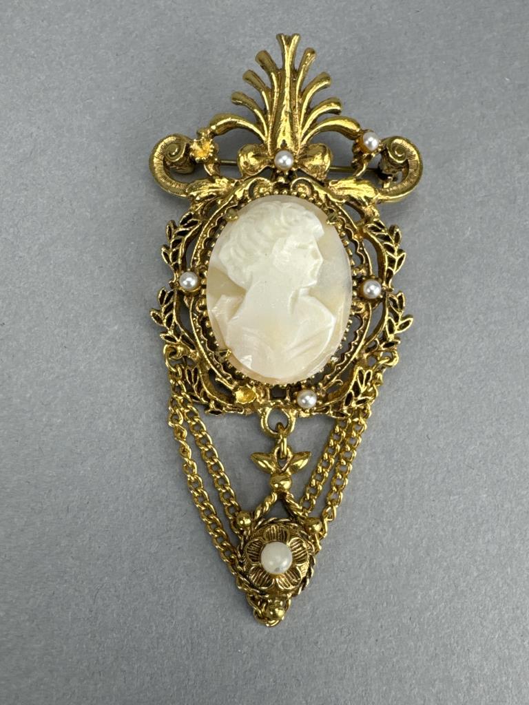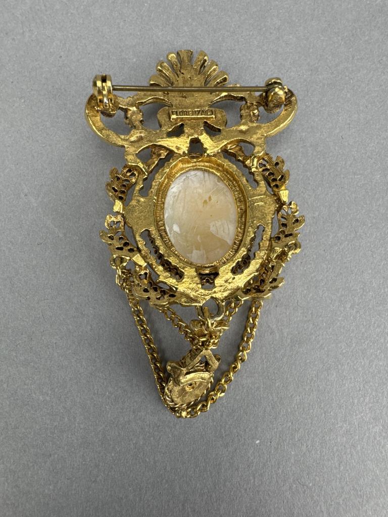 Florenza cameo brooch and 12K GF Rhinelander Inc. opaline glass screw clip earrings