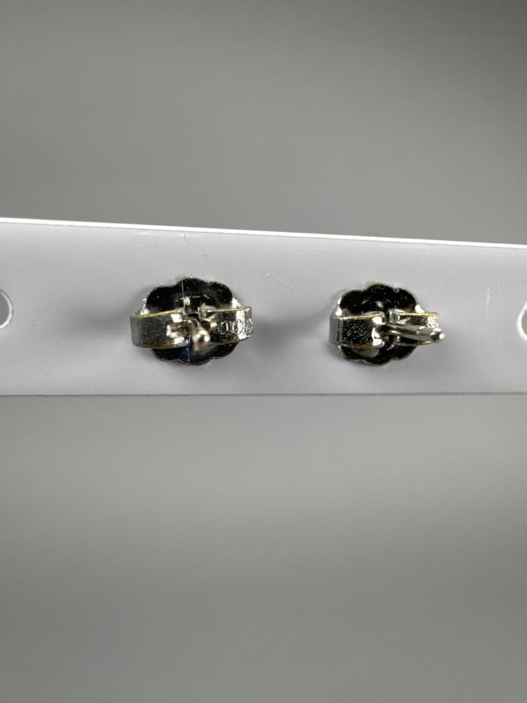 Not marked-tests 10K, 2 diamonds approx. 0.03-0.05 carat each, 8 rubies surrounding each diamond, and weigh approx. 1.1 grams w/o backs. Backs are marked AVON, not real.