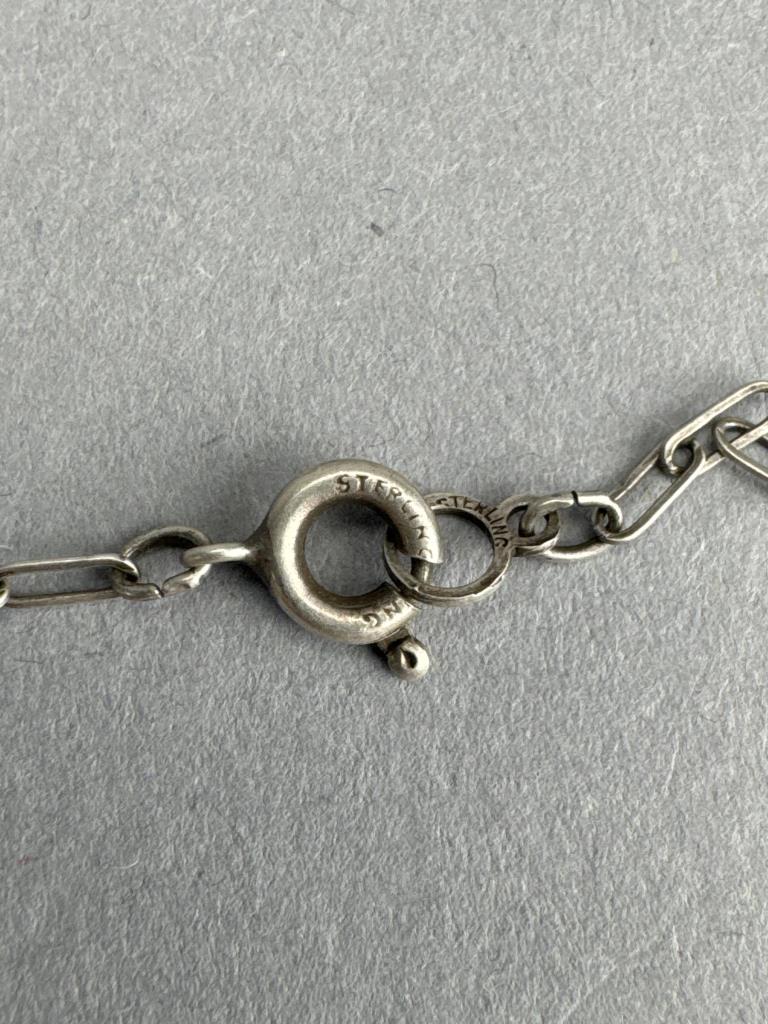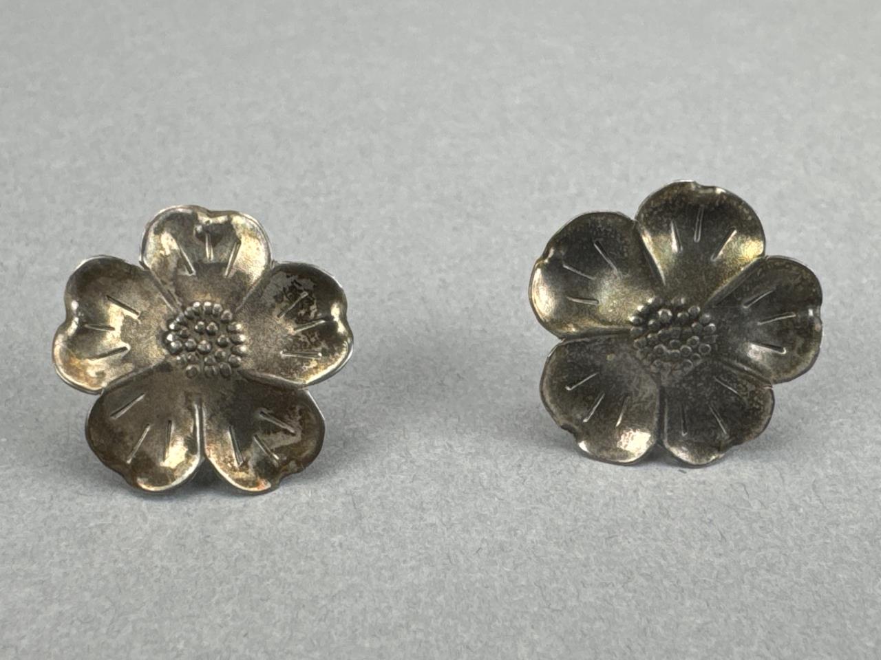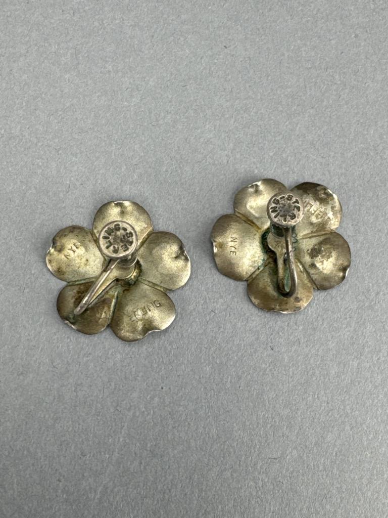 Clasp and jump ring are marked STERLING (tests real), measures 16 inches, 2 stone links replaced (not real replacements), and weighs approx. 8.8 grams. Five petal floral screw clip earrings marked STERLING NYE and weigh approx. 3.4 grams total.