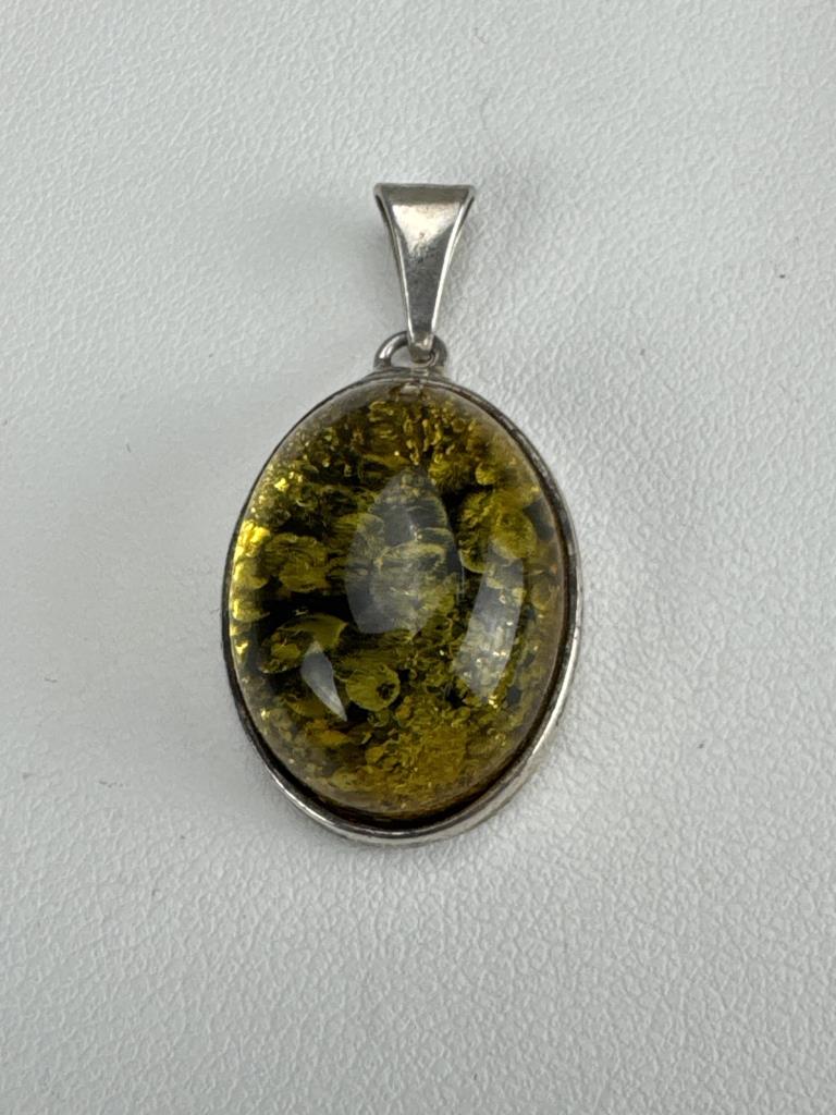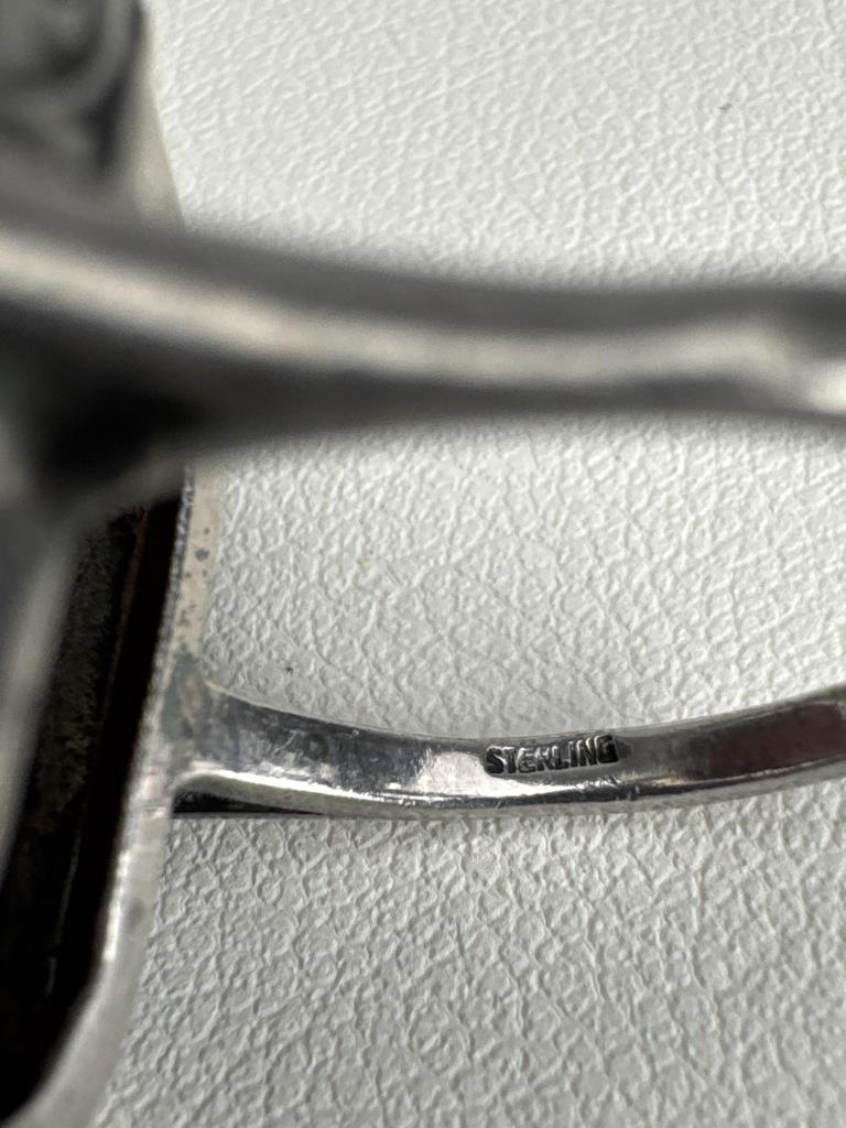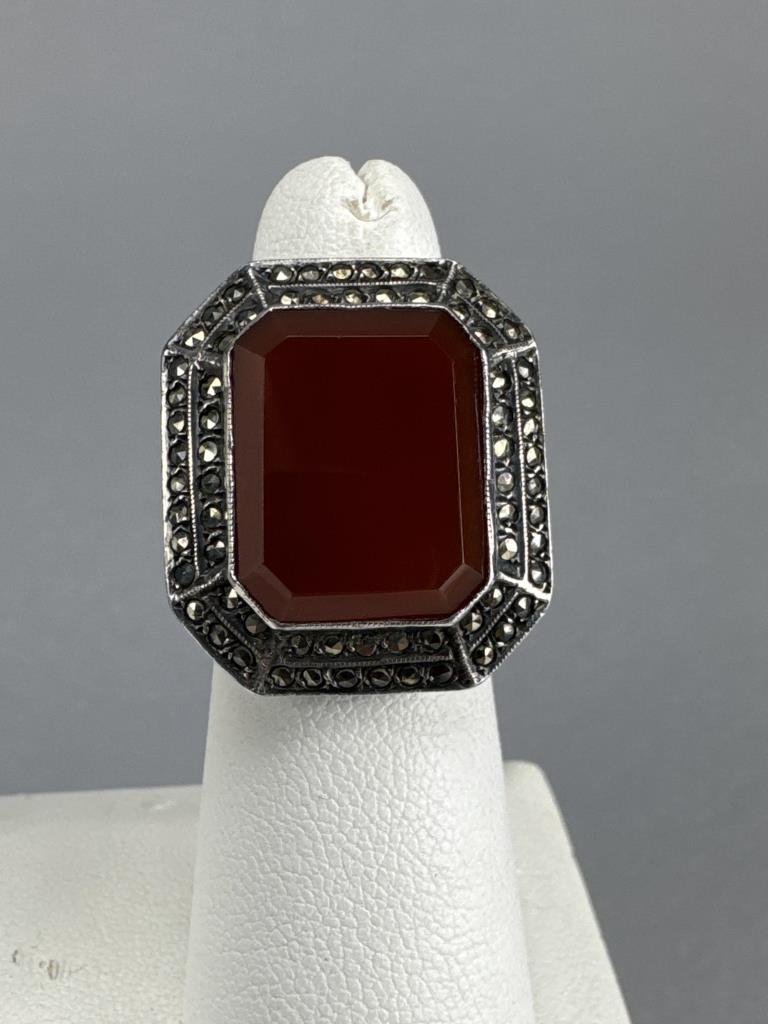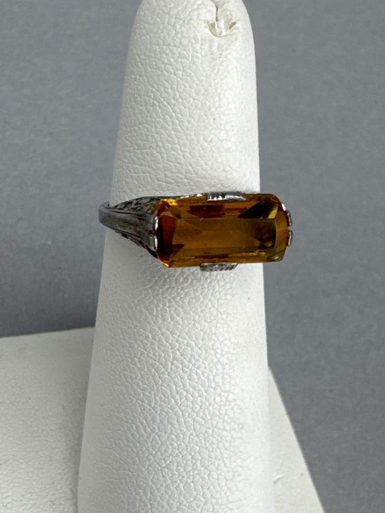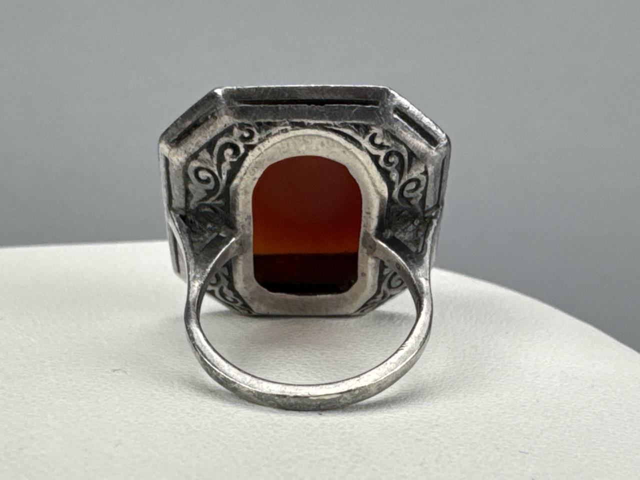 Carnelian and marcasite ring is marked STERLING GERMANY, is size 4 1/2, and weighs approx. 10.3 grams. Citrine filigree ring is marked STERL (partially worn), size 5, and weighs approx. 1.8 grams. Amber like (copal/resin) pendant is 19.4 x 14.8 x 9.0 mm and weighs 4.2 grams.