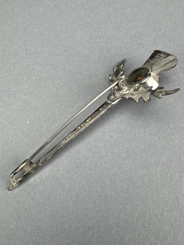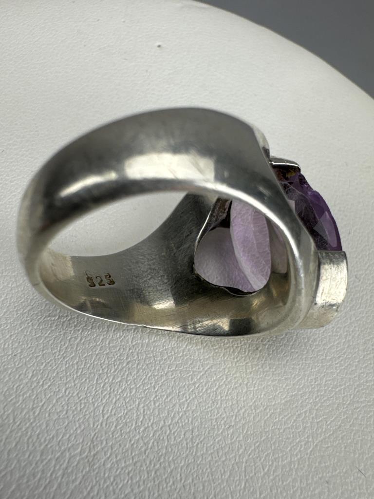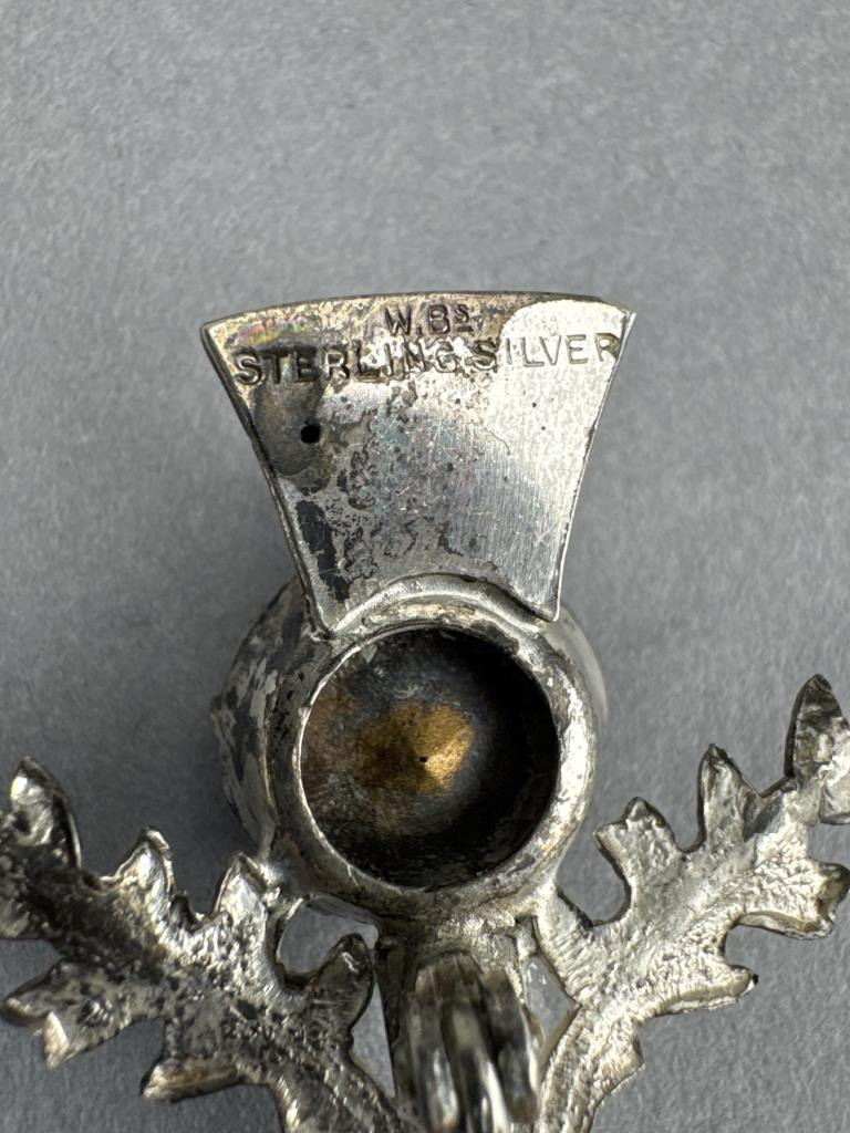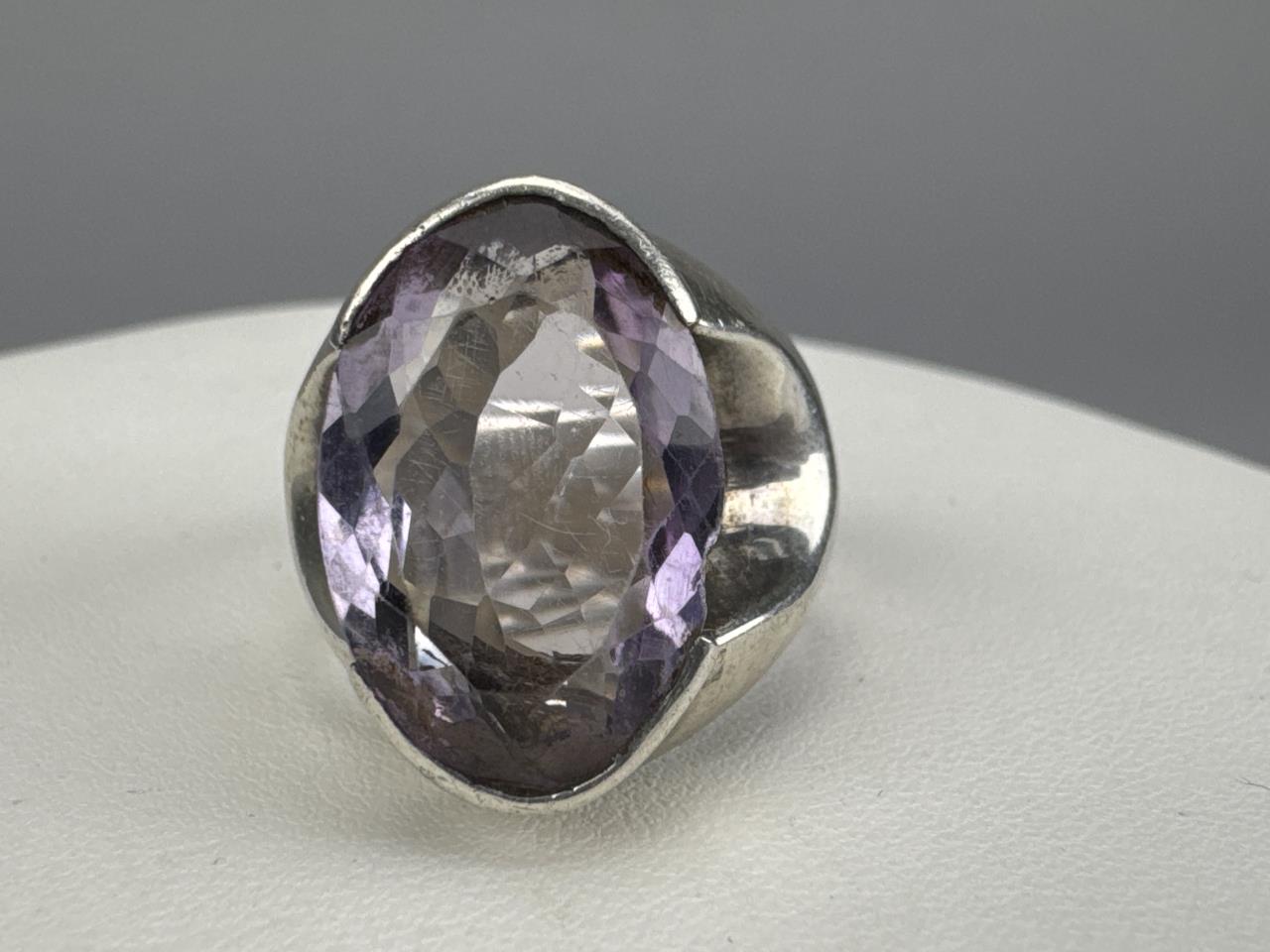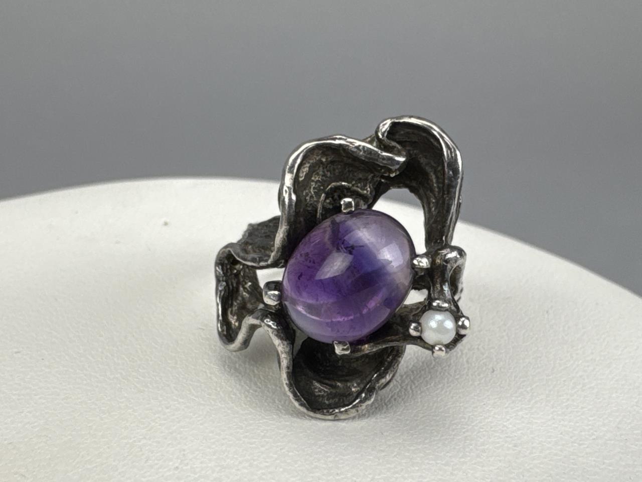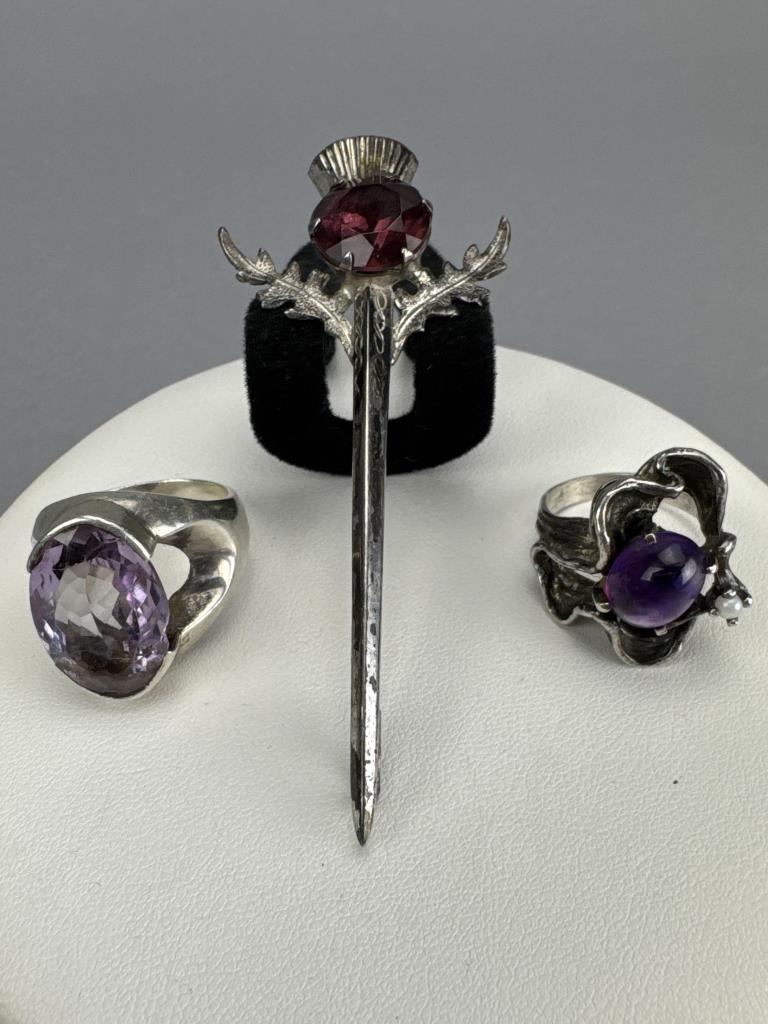 Scottish thistle like pin w/ purple stone is marked WBS STERLING, is 3 inches, and weighs 7.1 grams. Large oval amethyst (chip on edge of girdle) ring is marked 925, size 8, and weighs 11.0 grams. Cabochon amethyst and seed pearl ring tests silver, size 6 3/4, and weighs 7.3 grams.