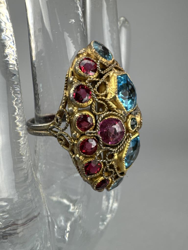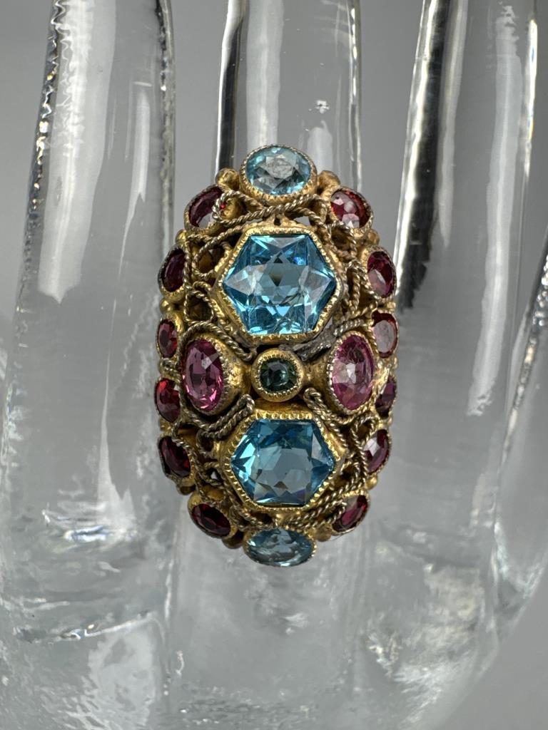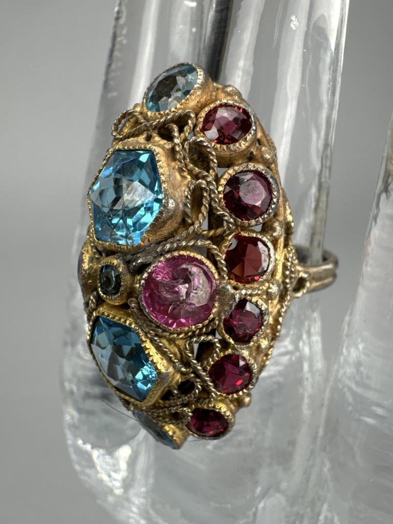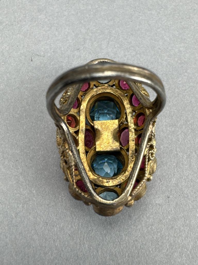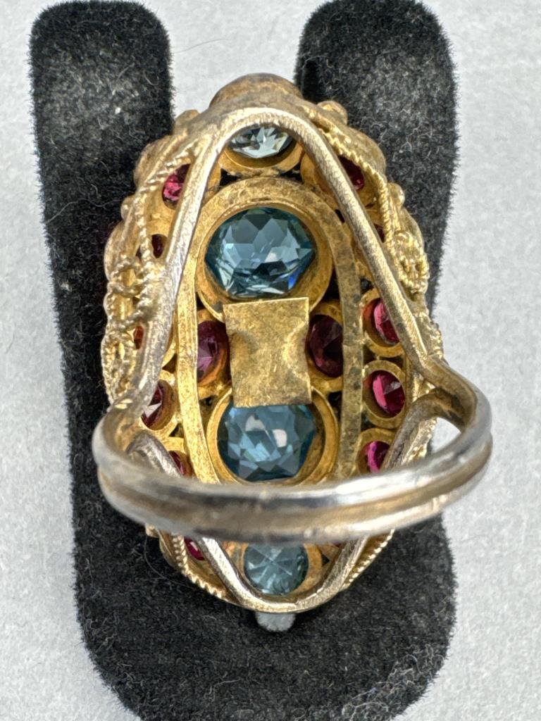 Gold Over Silver Red Pink Blue Glass Cluster Ring