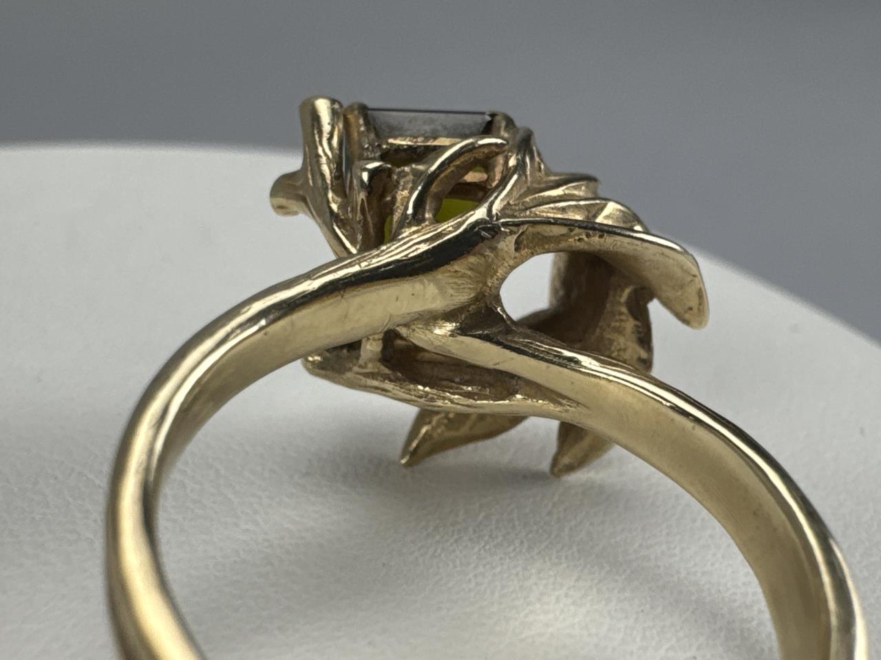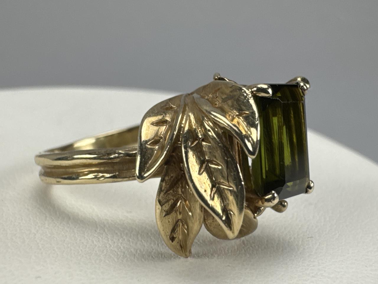 14K Ladies Emerald Cut Green Tourmaline Leaf Ring