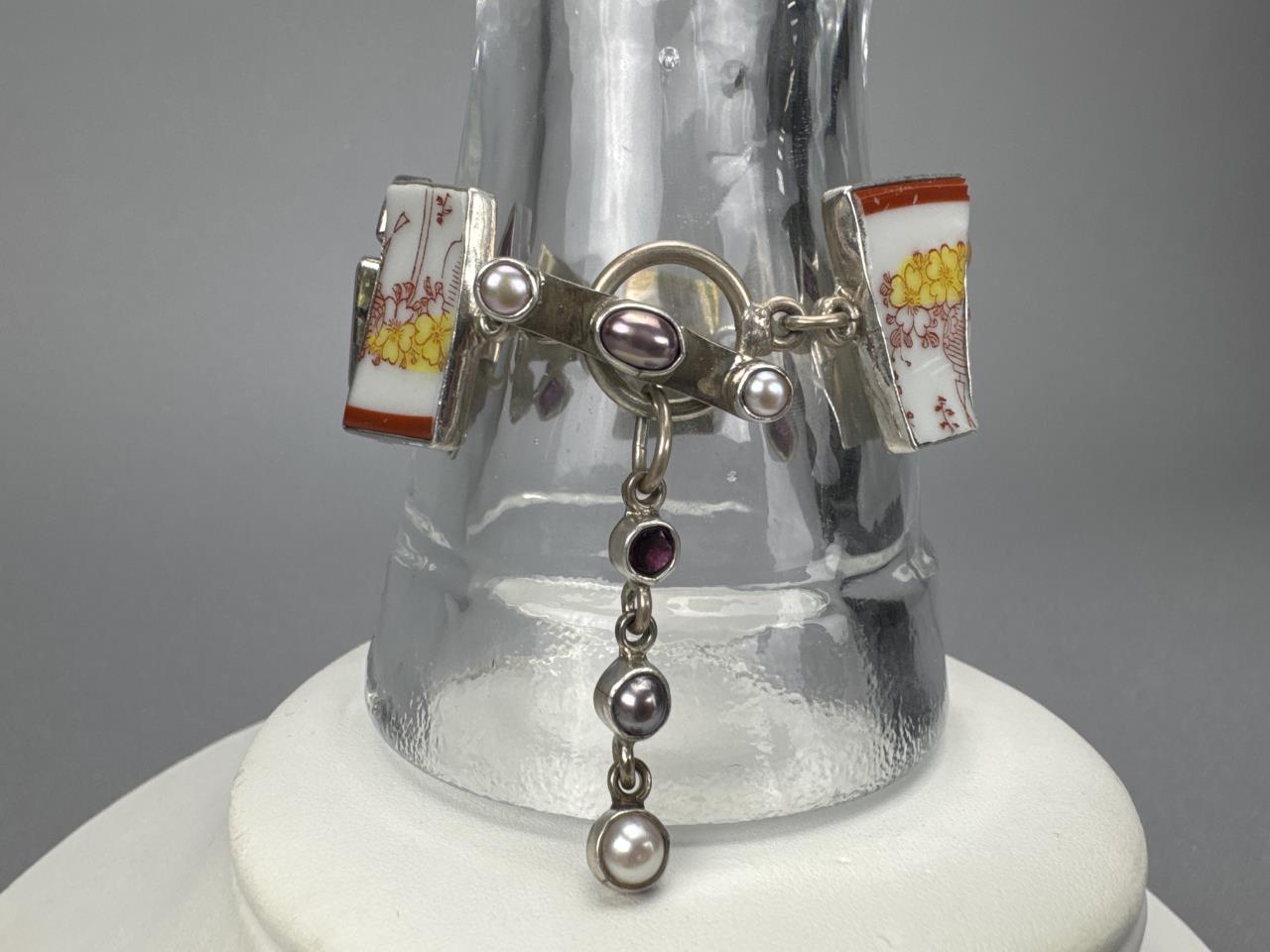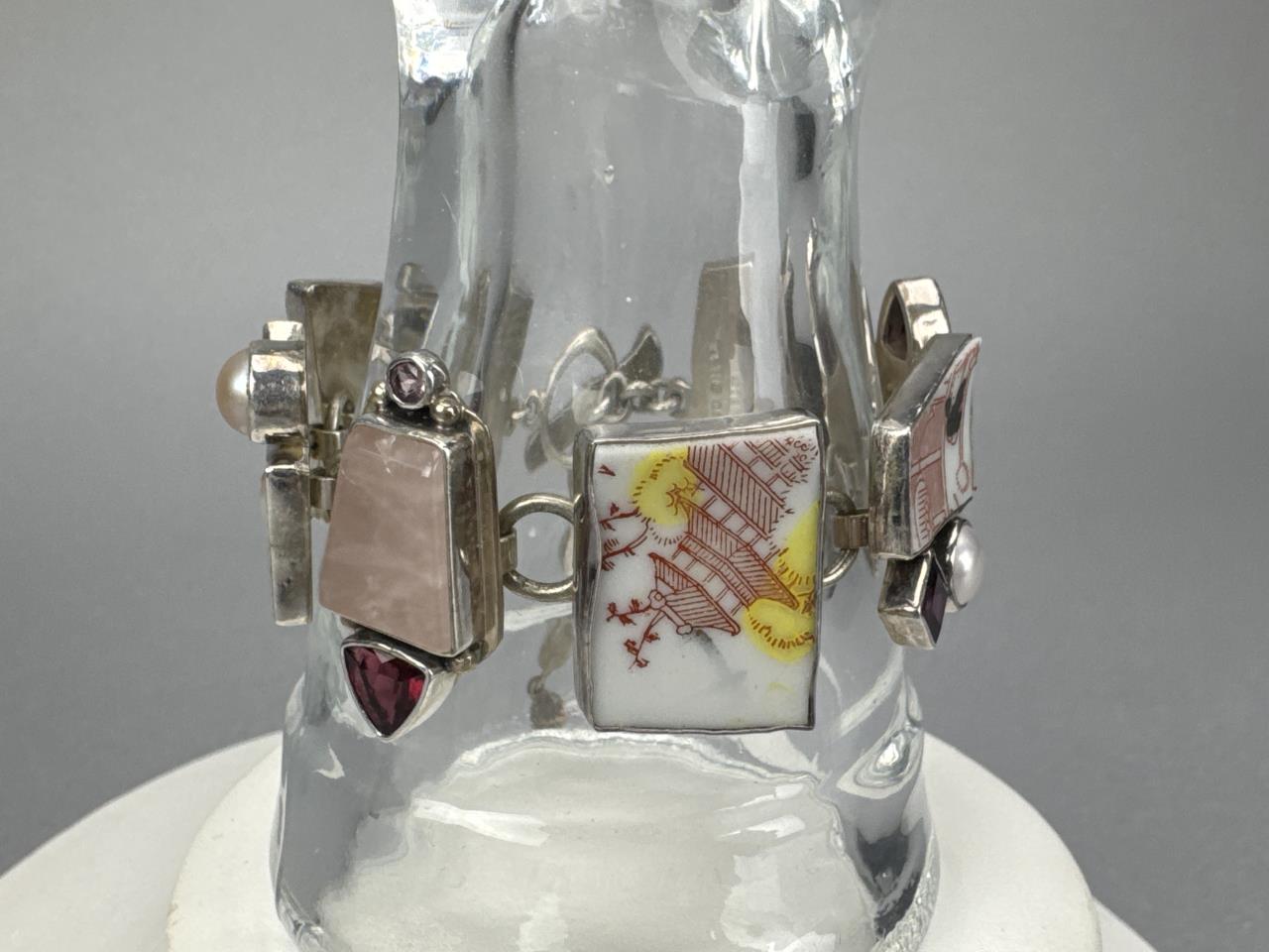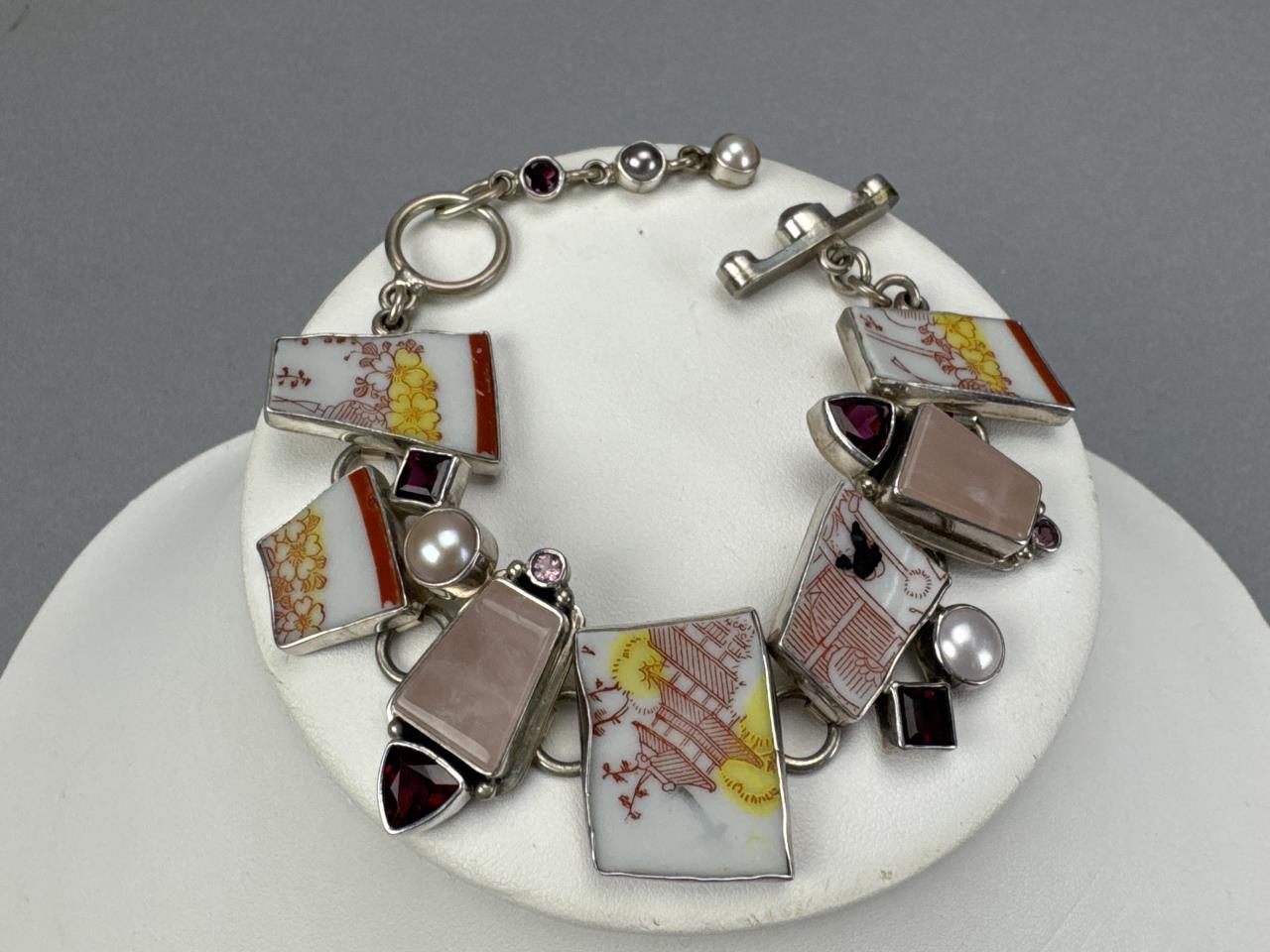 7 inch toggle clasp, rose quartz, cultured pearls, rhodolite garnets, broken China set in Sterling silver, marked STERLING THE DREAMER, and weighs approx. 55.0 grams.