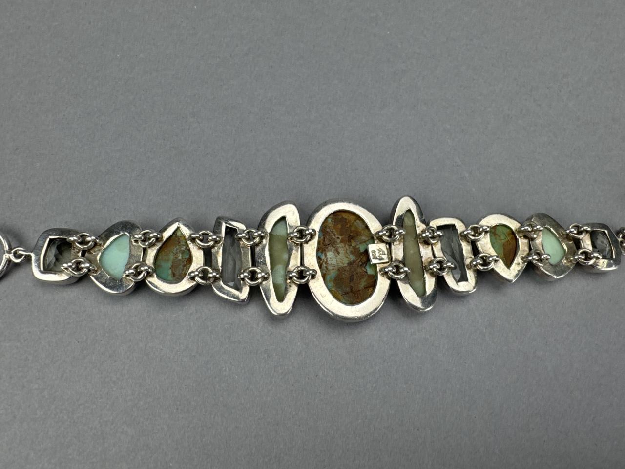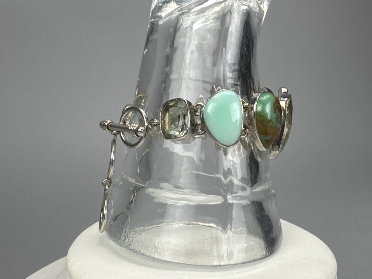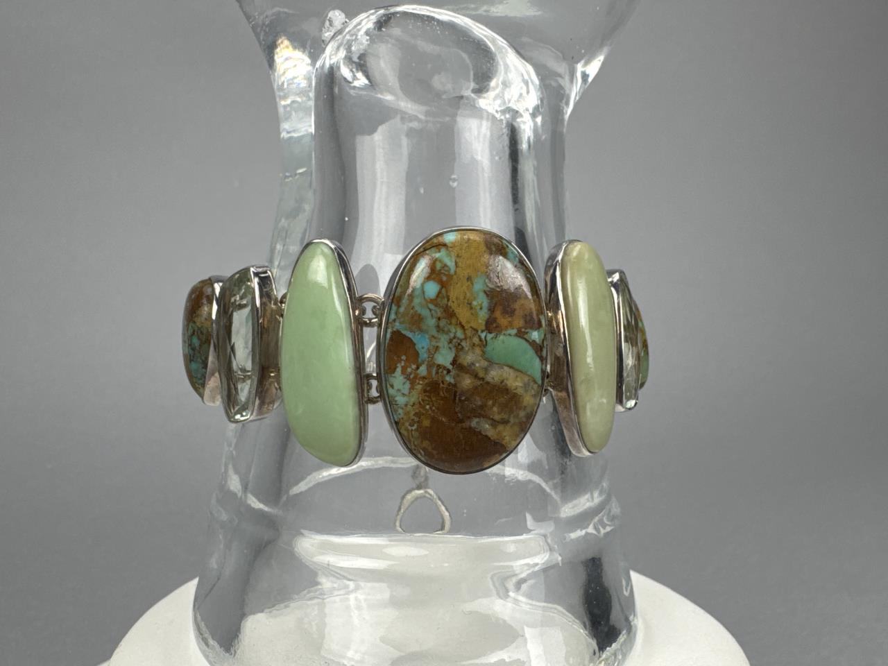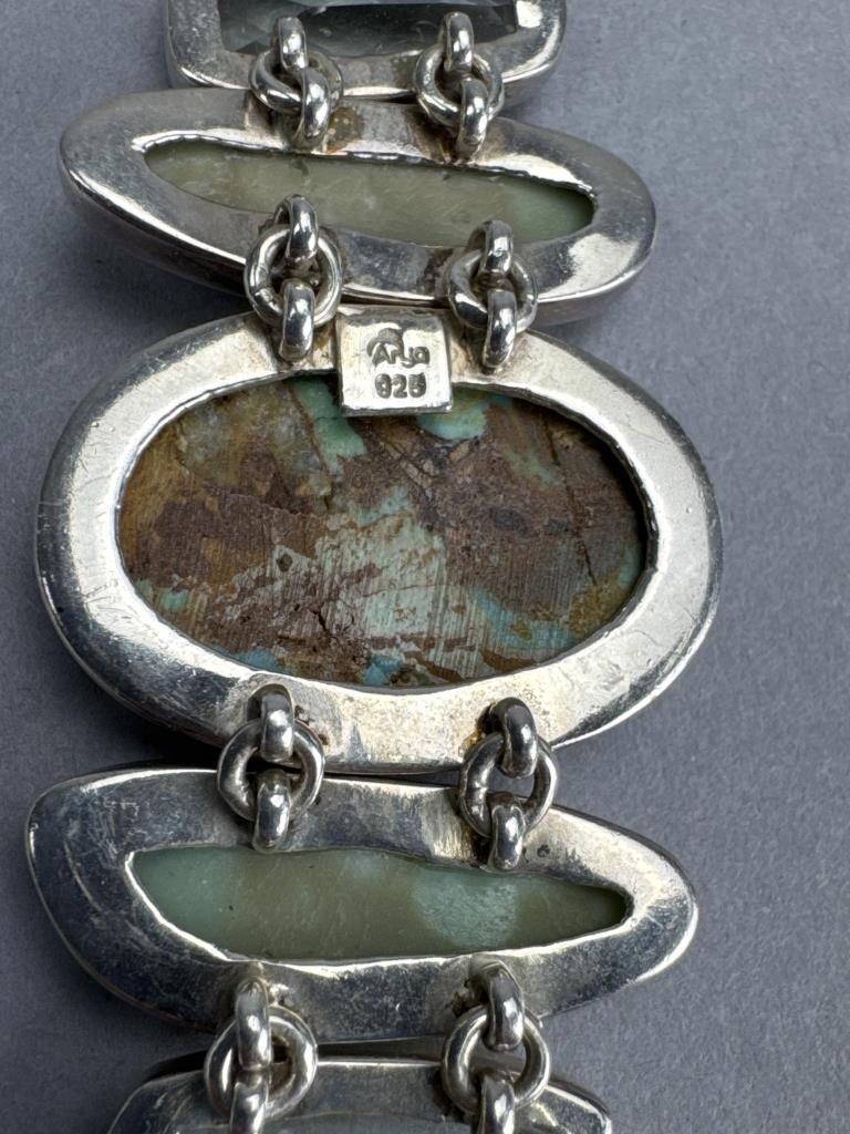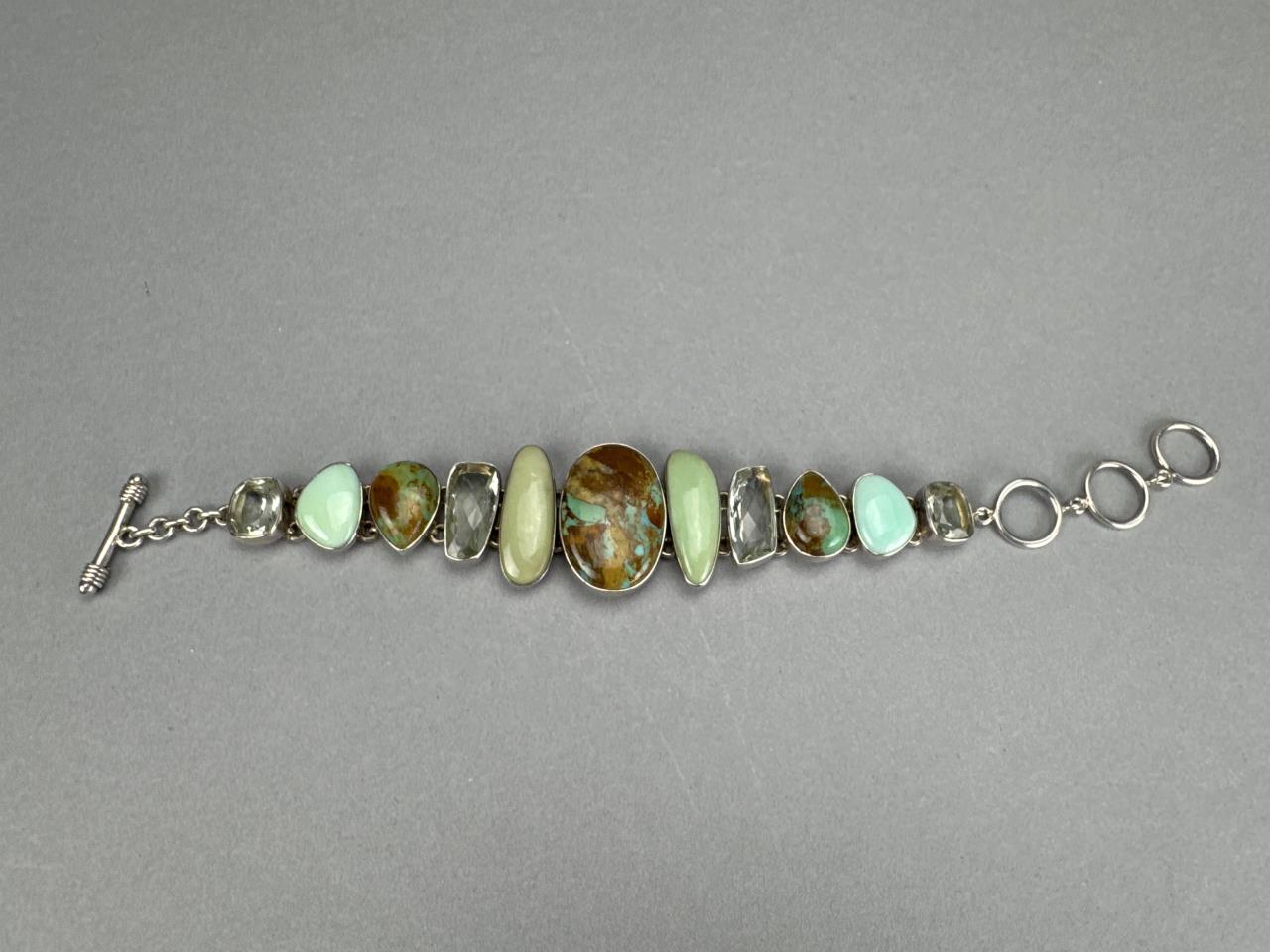 7 + 2 inch toggle clasp Arya signed bracelet, boulder turquoise, prasiolite, and green opal stones. Weighs approx. 46.2 grams.