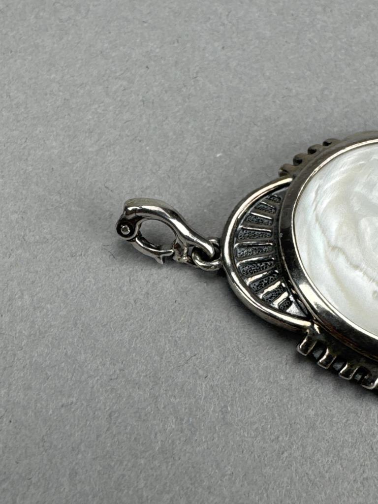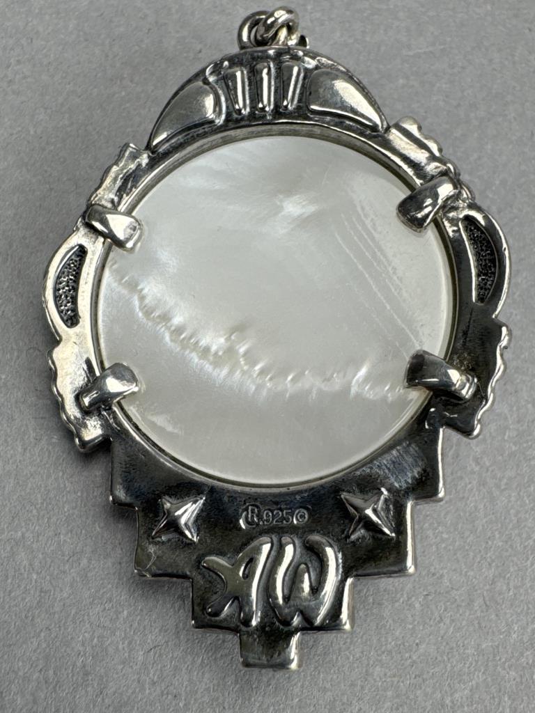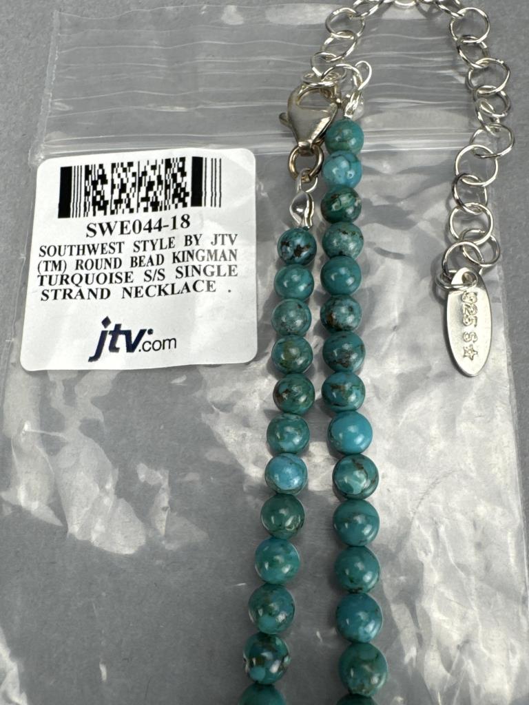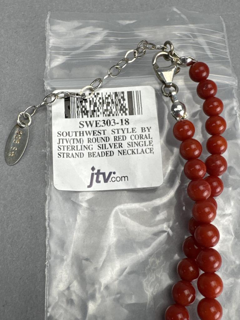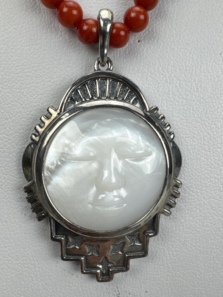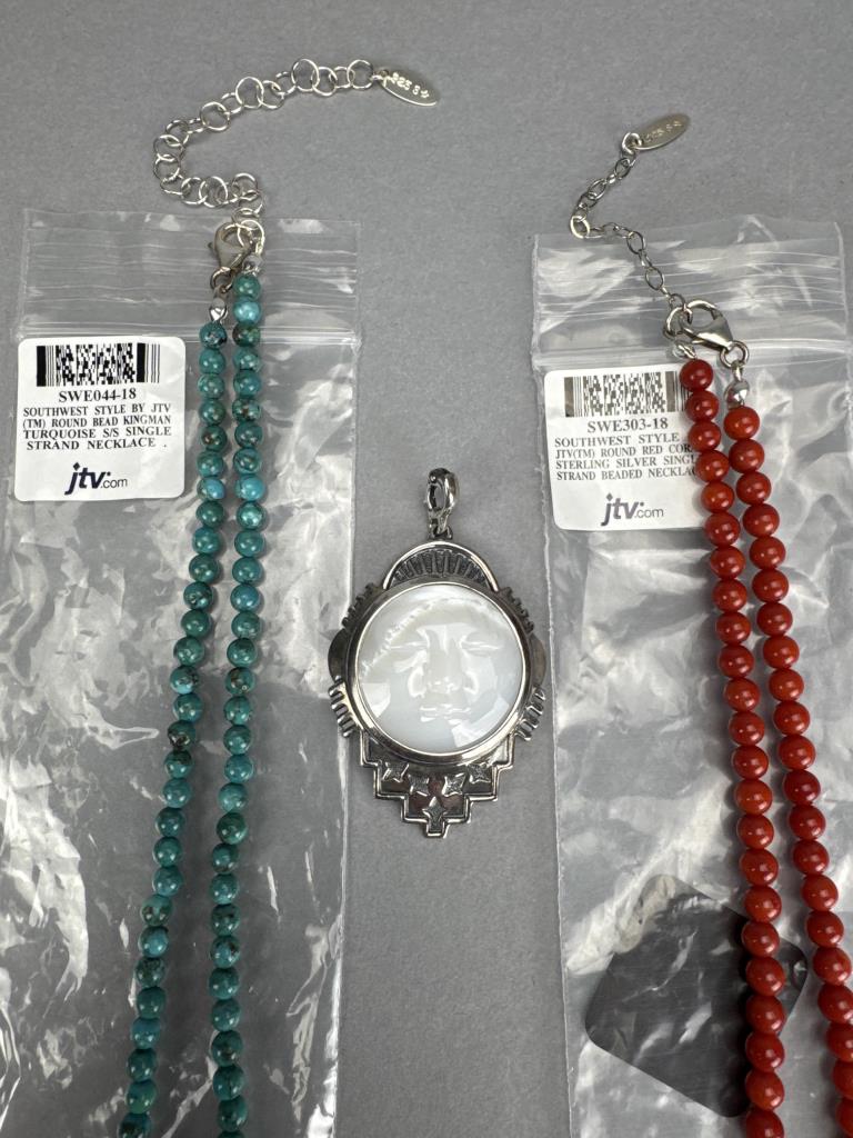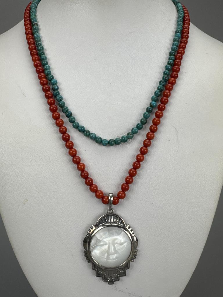 18 +2 inch Southwest style by Jtv round 5mm red coral bead necklace and 4+mm turquoise bead necklaces marked 925 S star. American West 2 x 1 1/4 inch mother of pearl sleeping moon face charm with lobster bail, marked 925 AW, and weighs approx. 14.4 grams.
