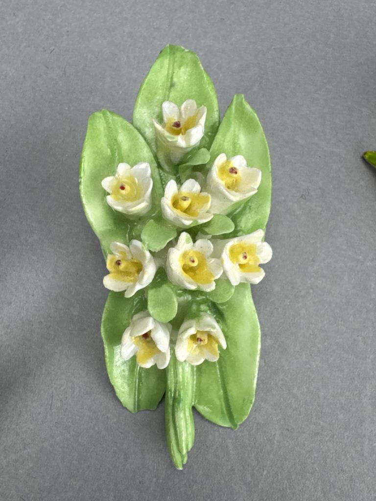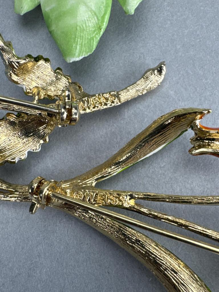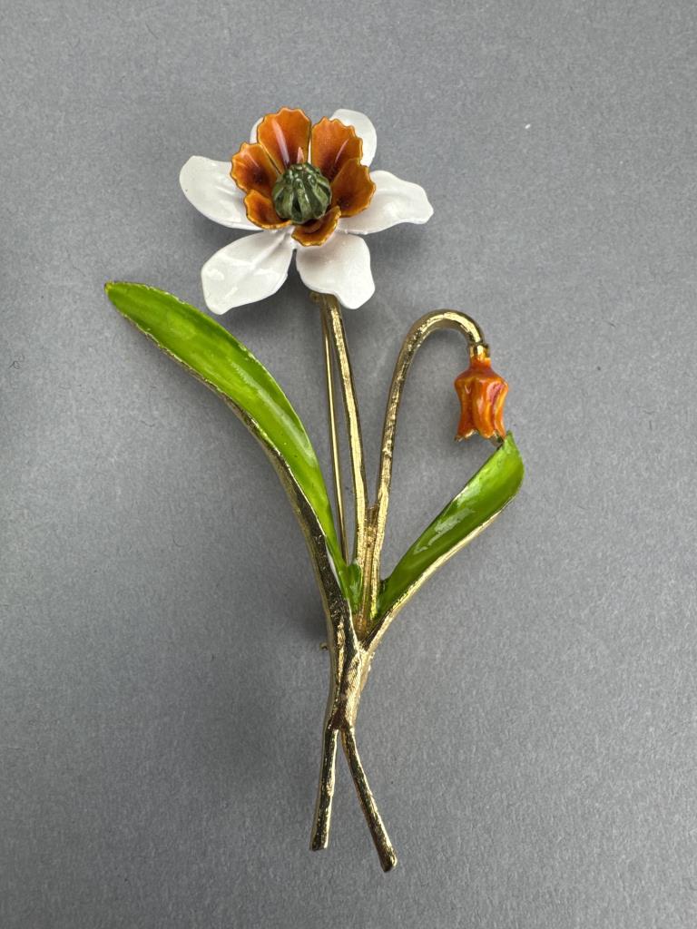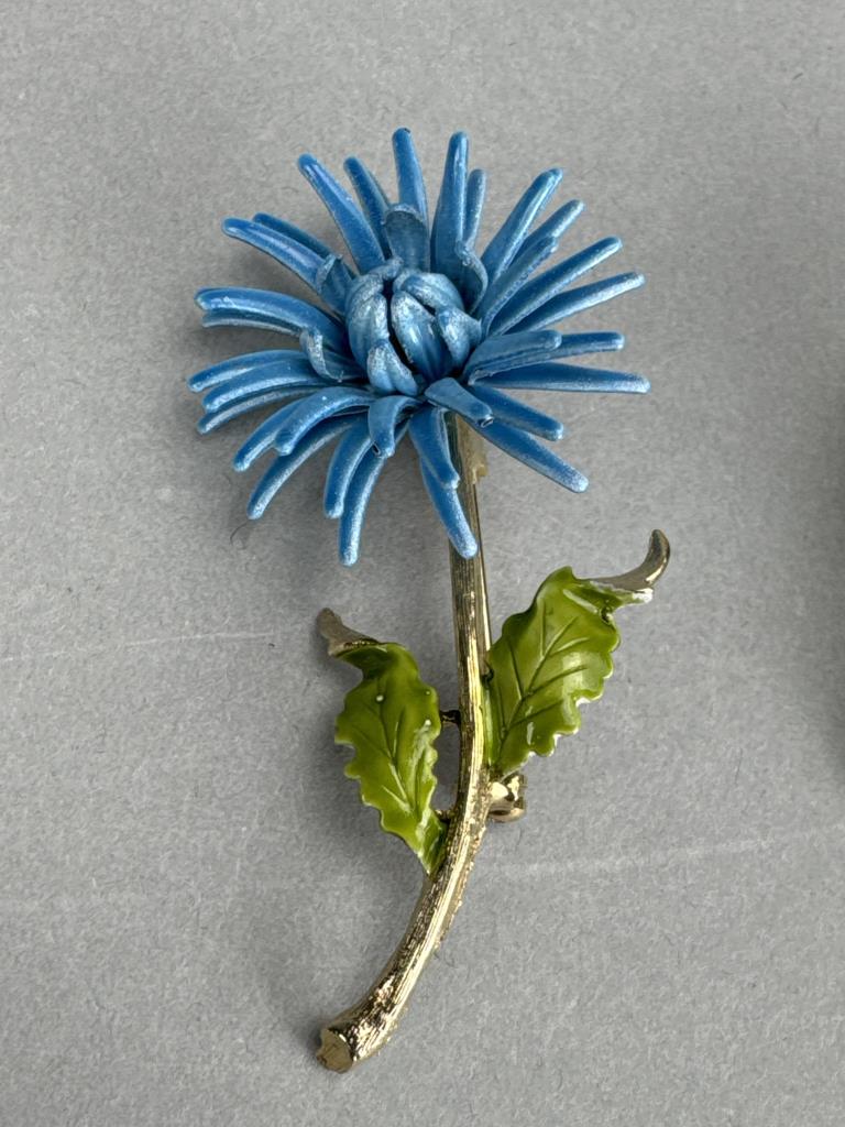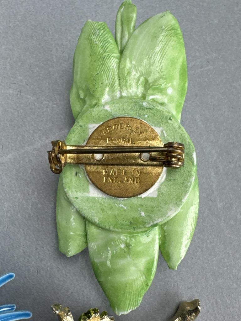 Signed Weiss brooches – Daffodil is 3 x 1 3/4 inch, Chrysanthemum is 2 1/2 x 1 1/4+ inch. Signed Adderly Floral Made in England China Bone water lilies brooch is 2 1/2 x 1 1/8 inch.