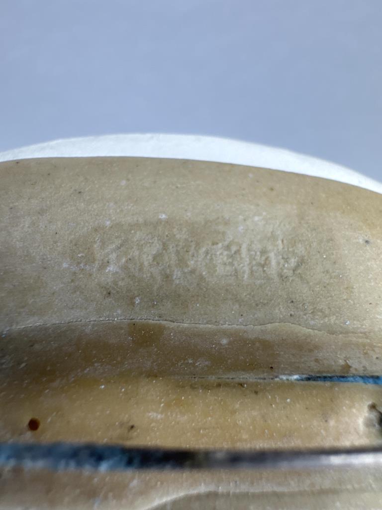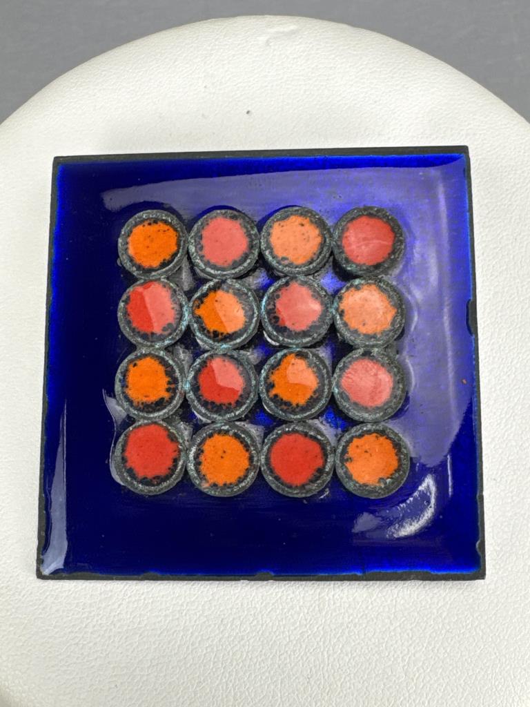 Blue square with red and orange dots modernist pin is 2 x 2 inch. Kruger pin is 1 5/8 x 1 3/8 inch.