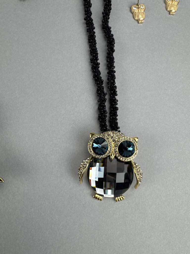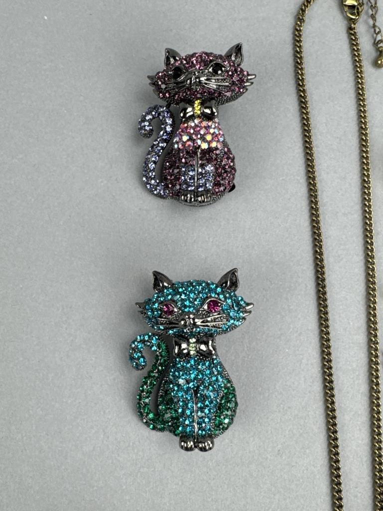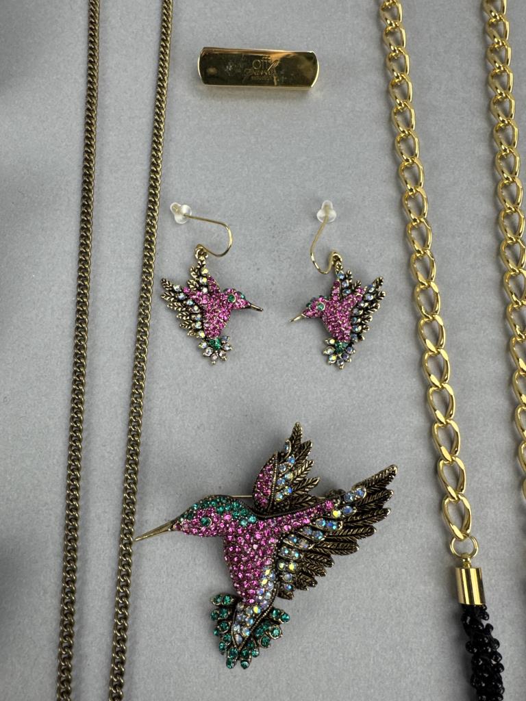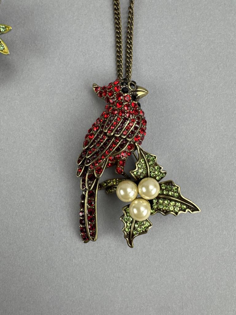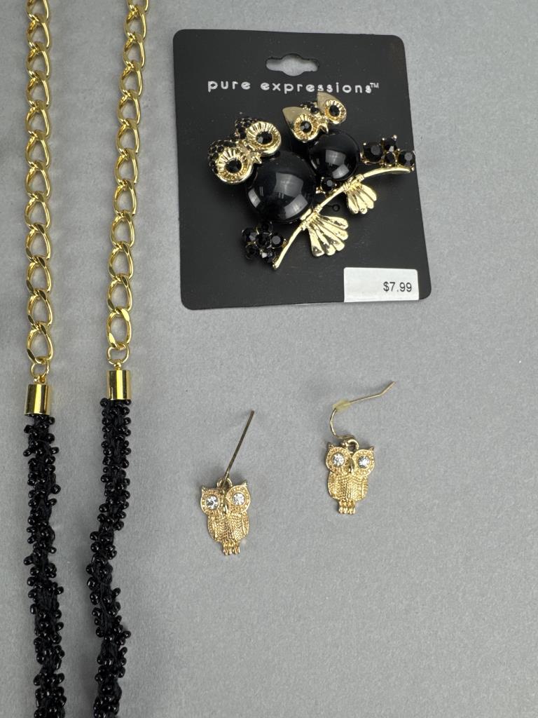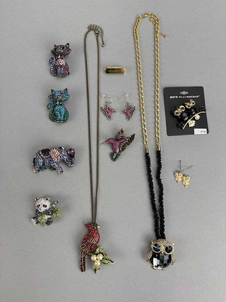 24 + 3 inch bronze tone necklace with pearl simulant Cardinal brooch/pendant. 30 + 3 inch gold tone multicolor crystal owl charm/pin. Gold tone owl earrings. Gold tone hummingbird charm/pin and earrings. Cats, Elephant, and Panda pin/brooches. Bonus Owl pin.