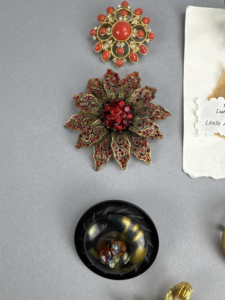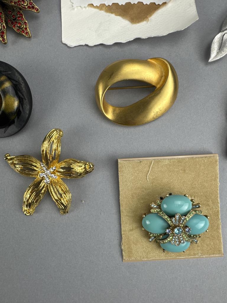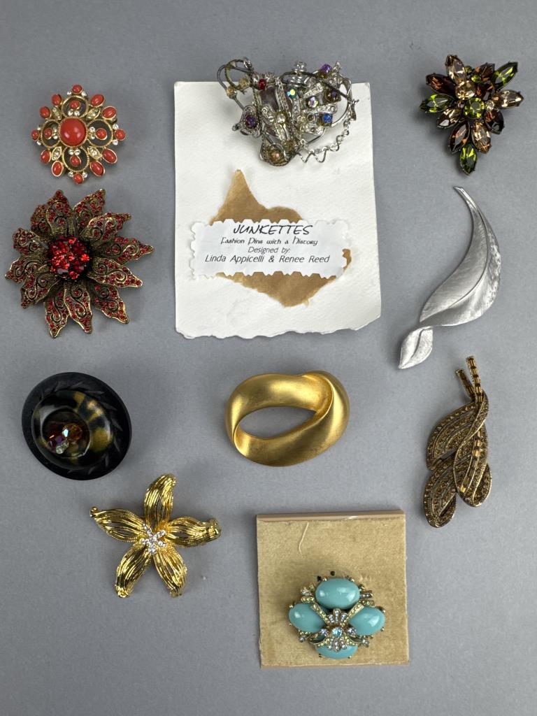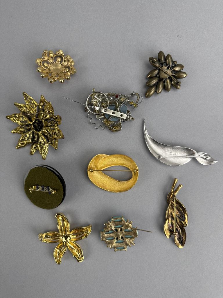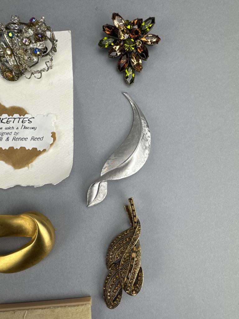 Feather pin is signed Trifari. Largest pin is 3 inchs