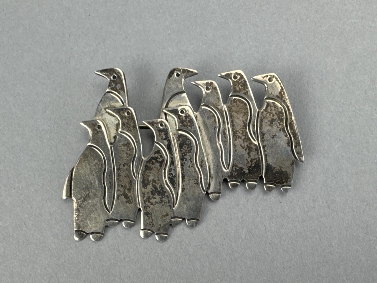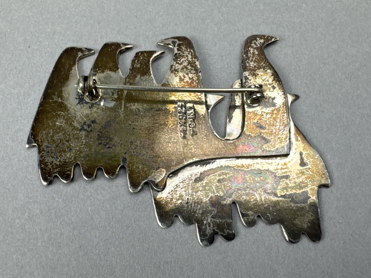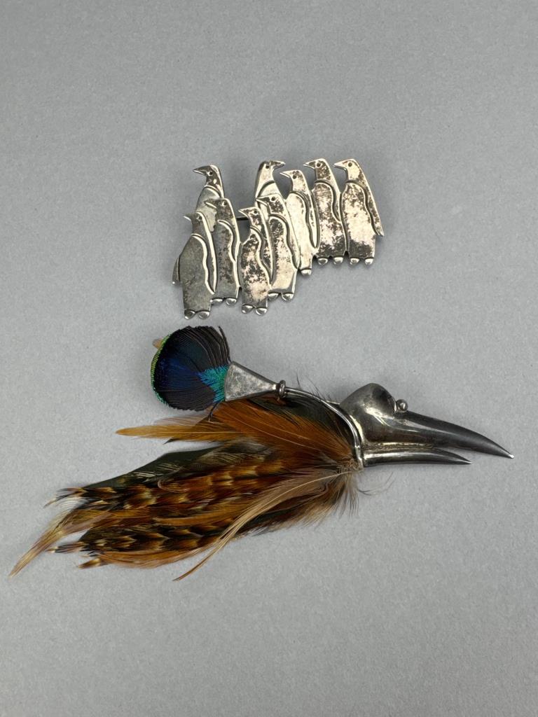 Bird head with feathers brooch marked 925 and weighs approx. 5.9 grams. Penguin pin marked MEX 925 TC-137 and weighs approx. 19.0 grams.