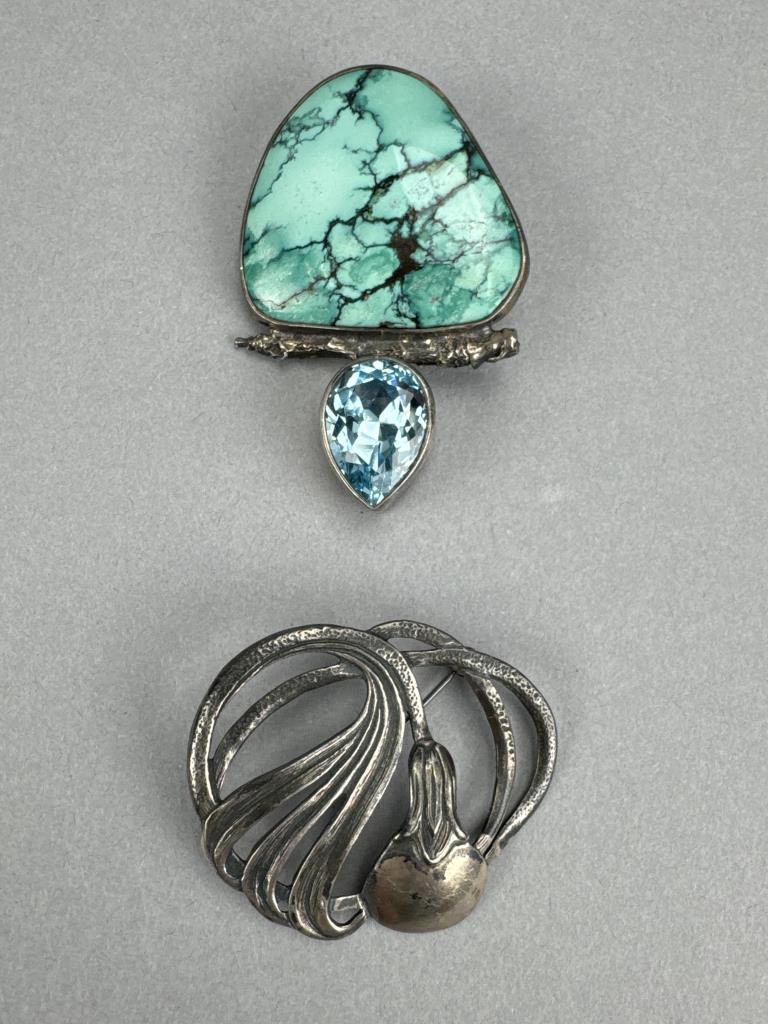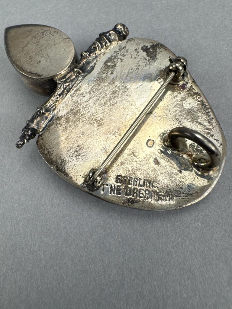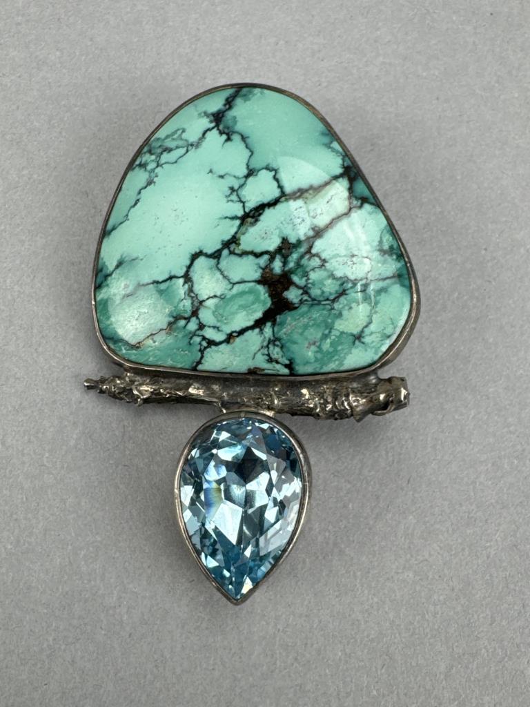 Turquoise and Blue Topaz marked Sterling The Dreamer pendant/pin combo weighs approx. 26.4 grams. Plant pin is marked 925 and weighs approx. 7.8 grams.