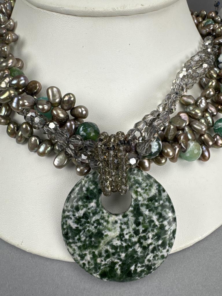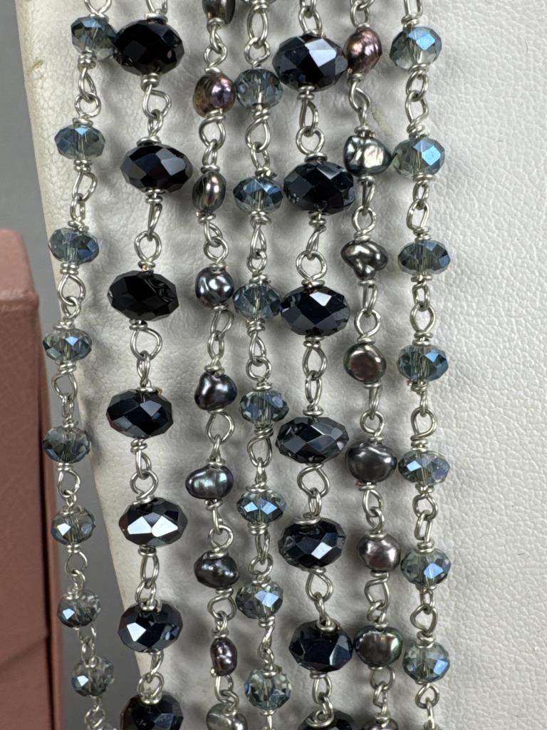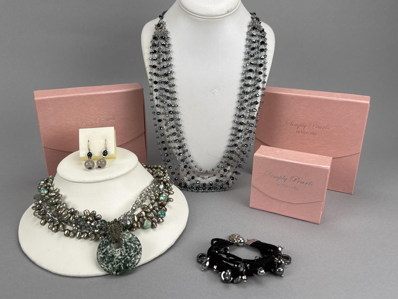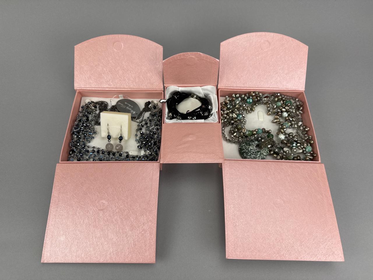 33 inch necklace, earrings, 7 inch bracelet, and 18 inch necklace in boxes.
