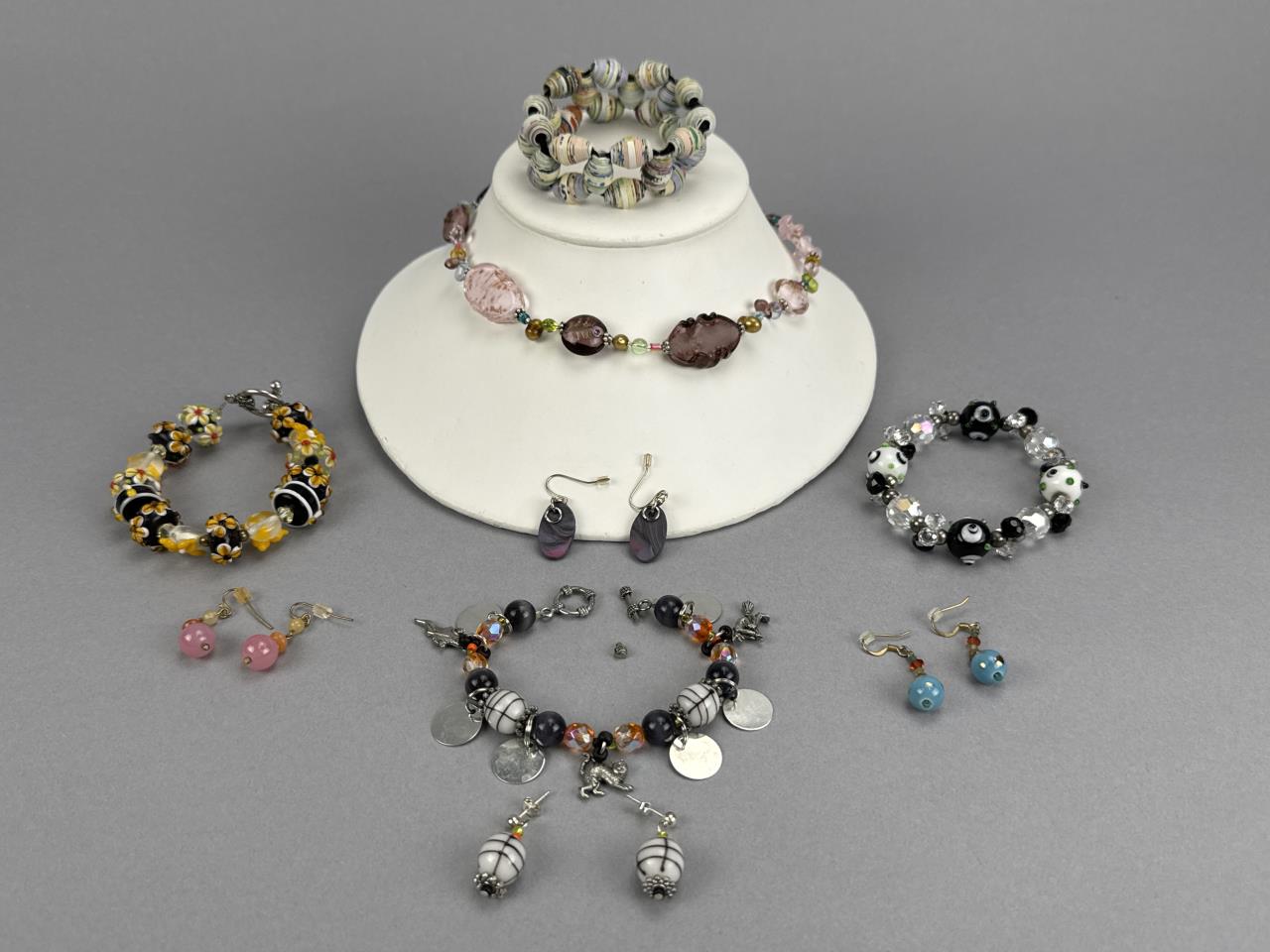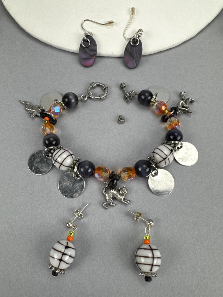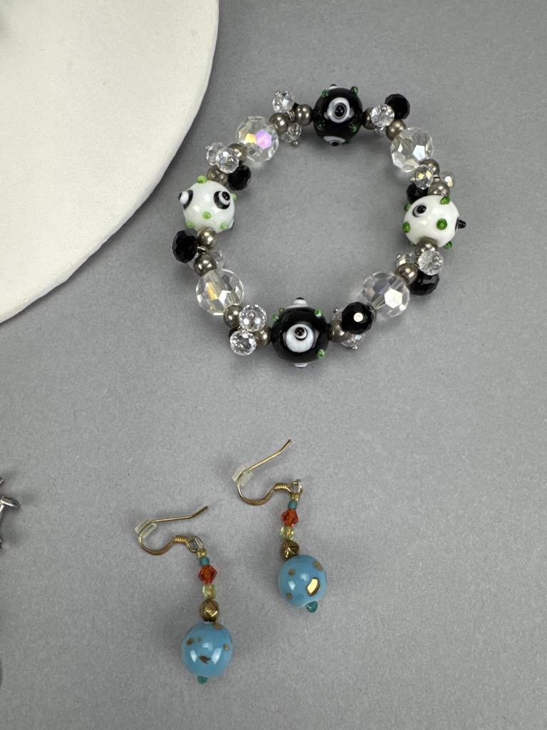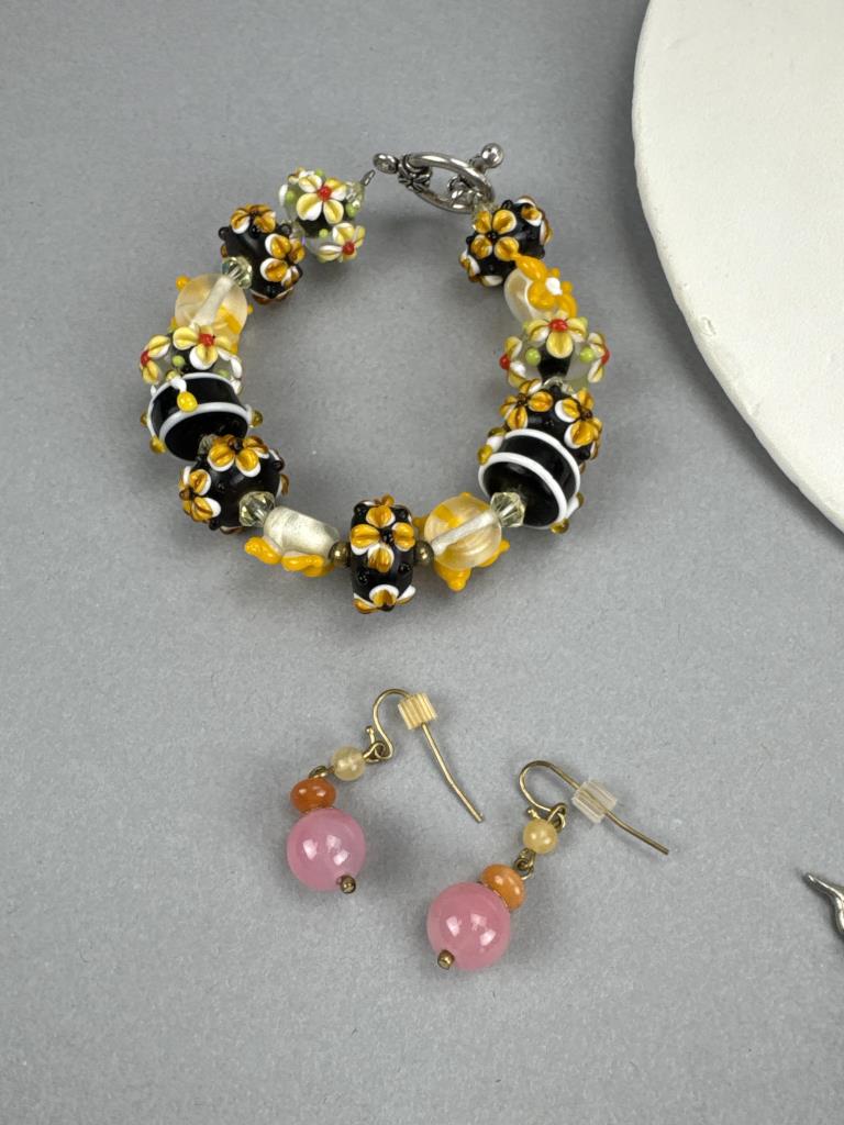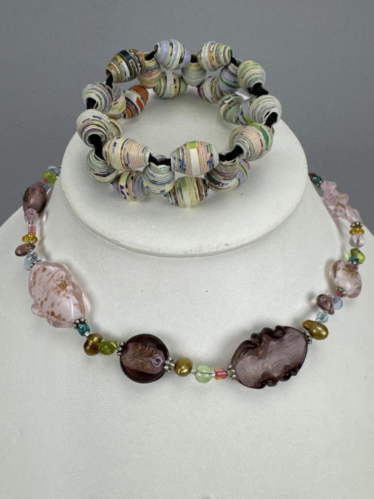 Toggle clasp and stretch bracelets, earrings, Precious Designs necklace, paper bead bracelet.