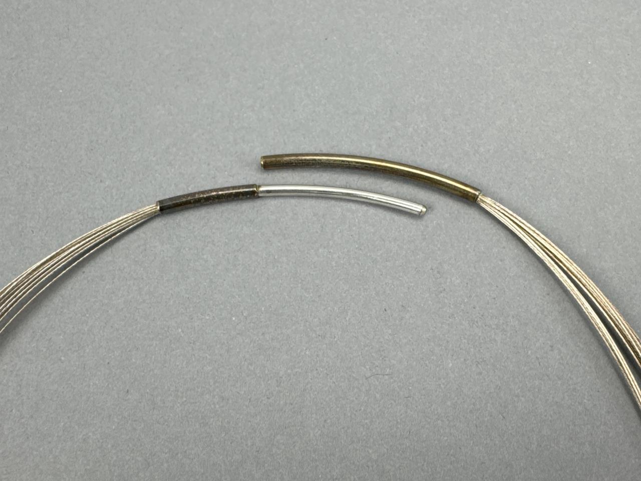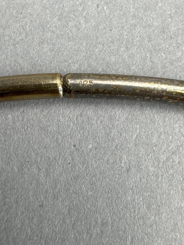 16 inch sterling silver wire collar necklace marked 925 with silver/brass/glass charm and weighs approx. 56.4 grams total.