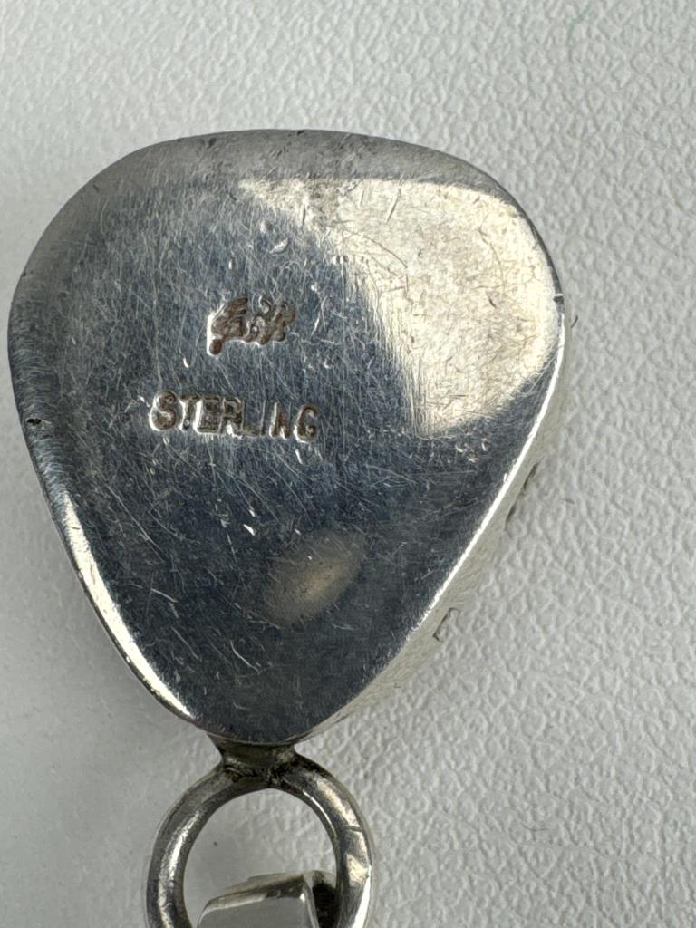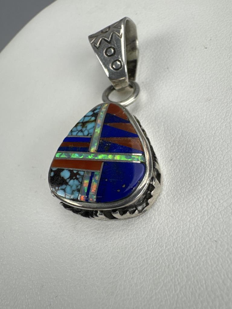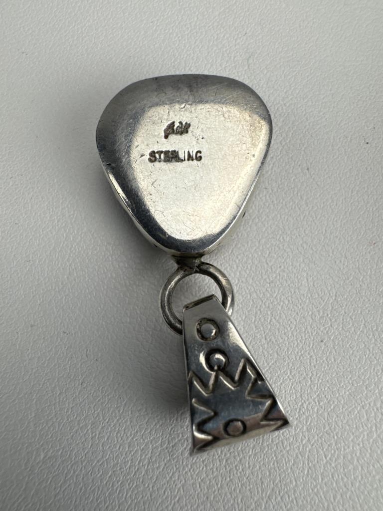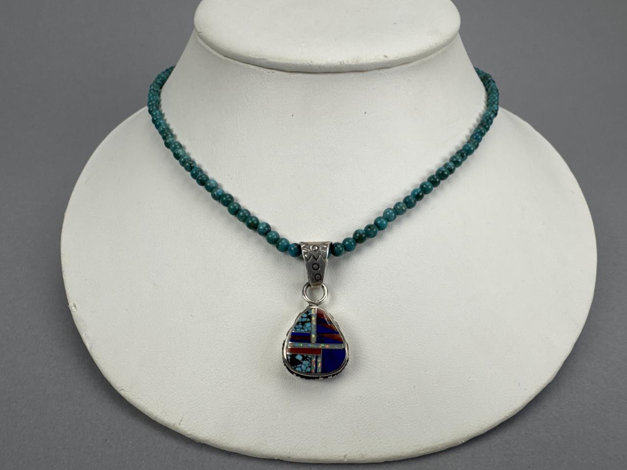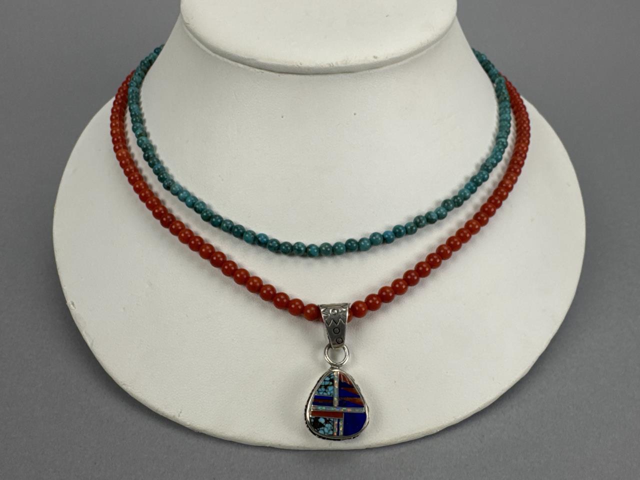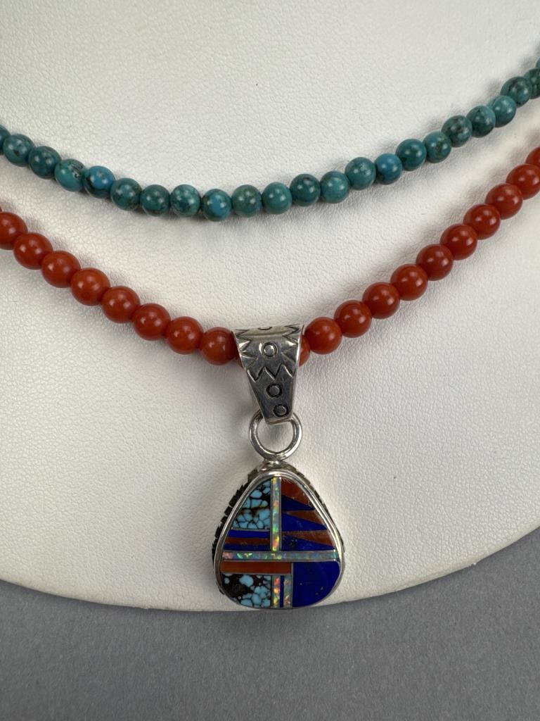 18 + 3 inch silver turquoise bead necklace marked 925 S star. 18 + 2 inch silver red coral bead necklace marked 925 S star. Zuni Southwest Style signed turquoise, coral, lapis, and mother of pearl inlay charm marked STERLING and makers initials, weighs approx. 9.9 grams.