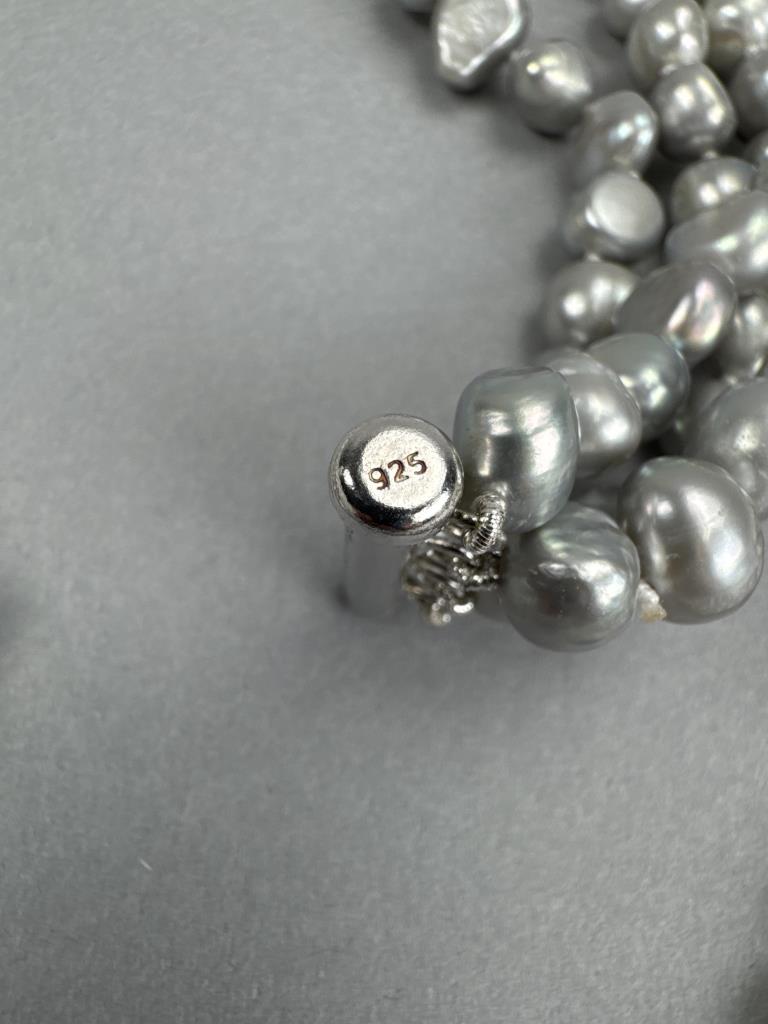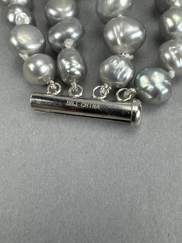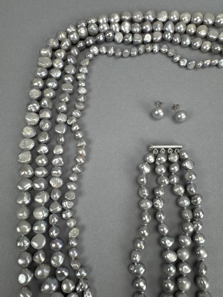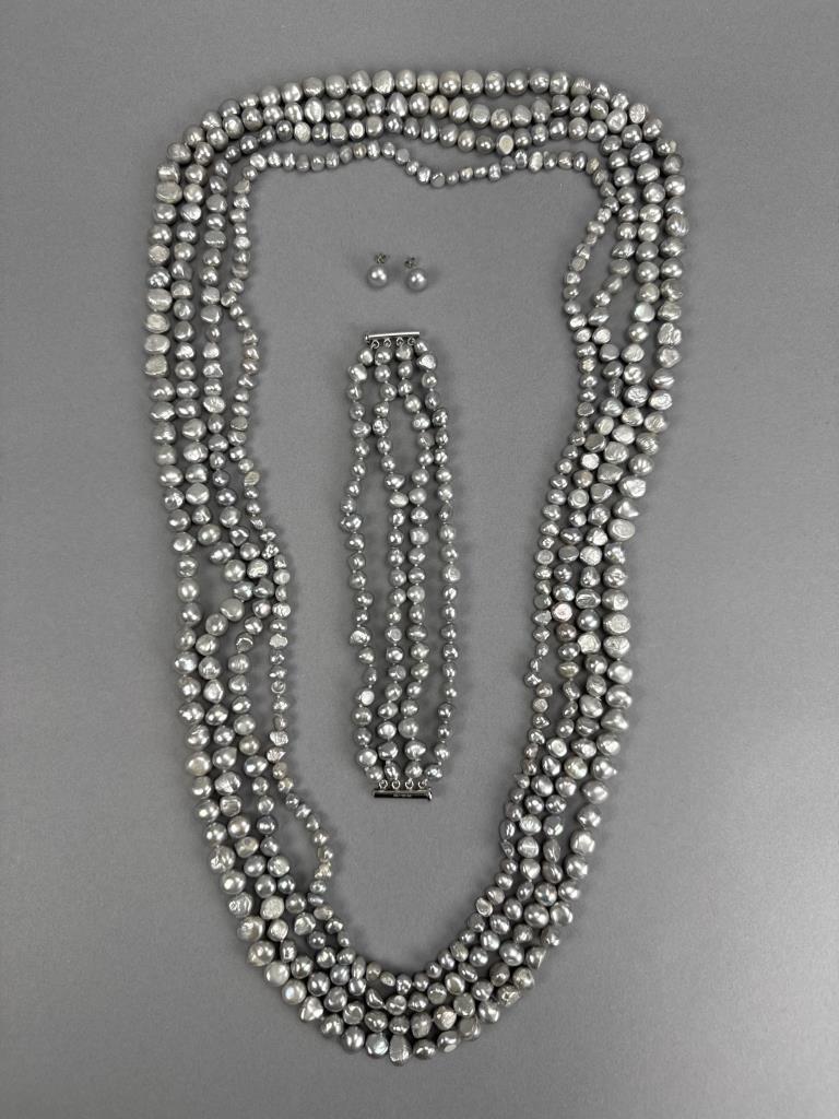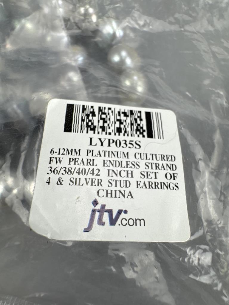 Jtv LYP035S – 6-12mm platinum cultured freshwater pearl endless strands, 36/38/40/42 inch set of 4 with matching silver stud pearl earrings marked PJS 925. 7 1/2 inch 4 strand cultured pearl bracelet marked 925 BBJ CHINA