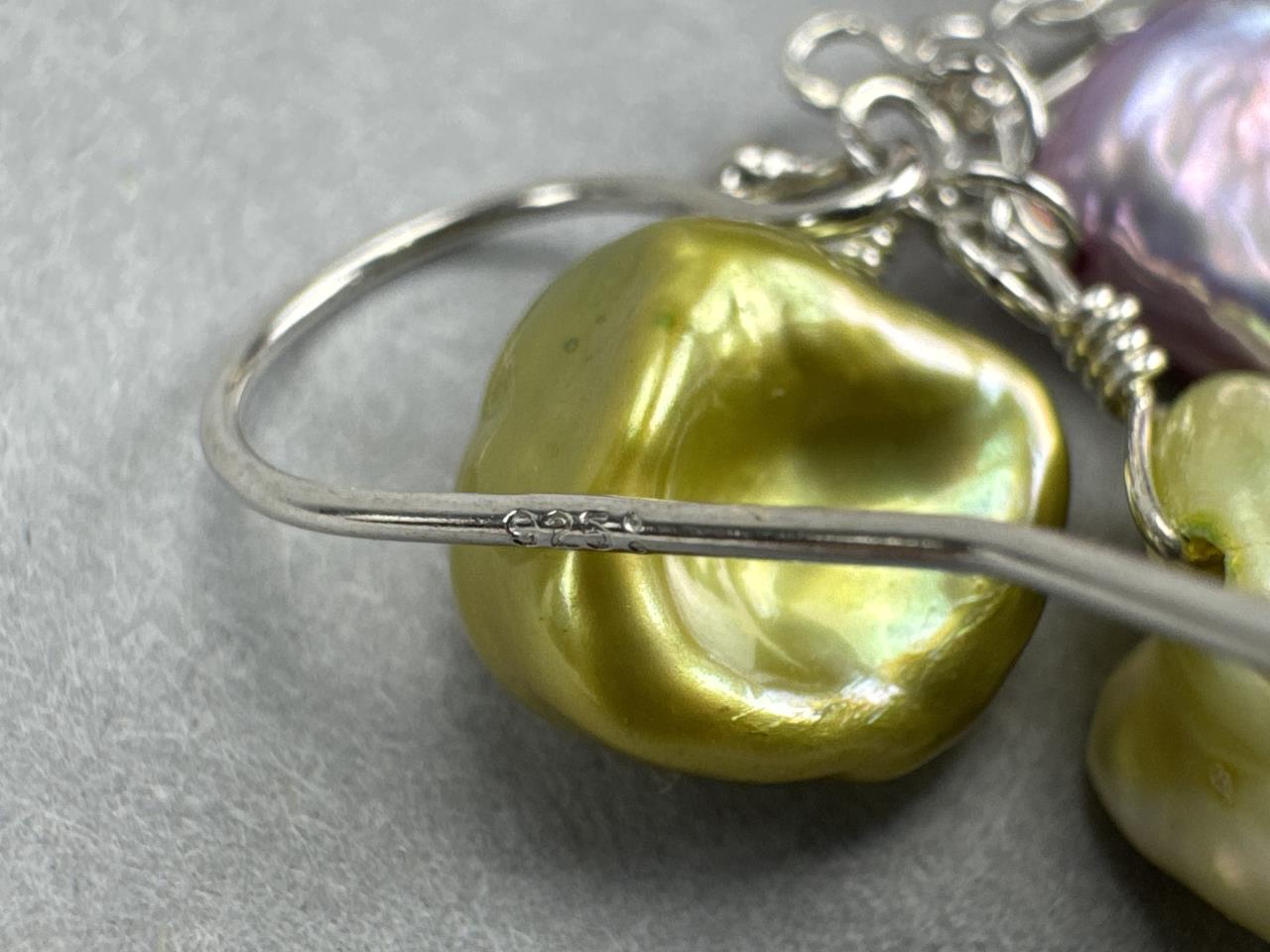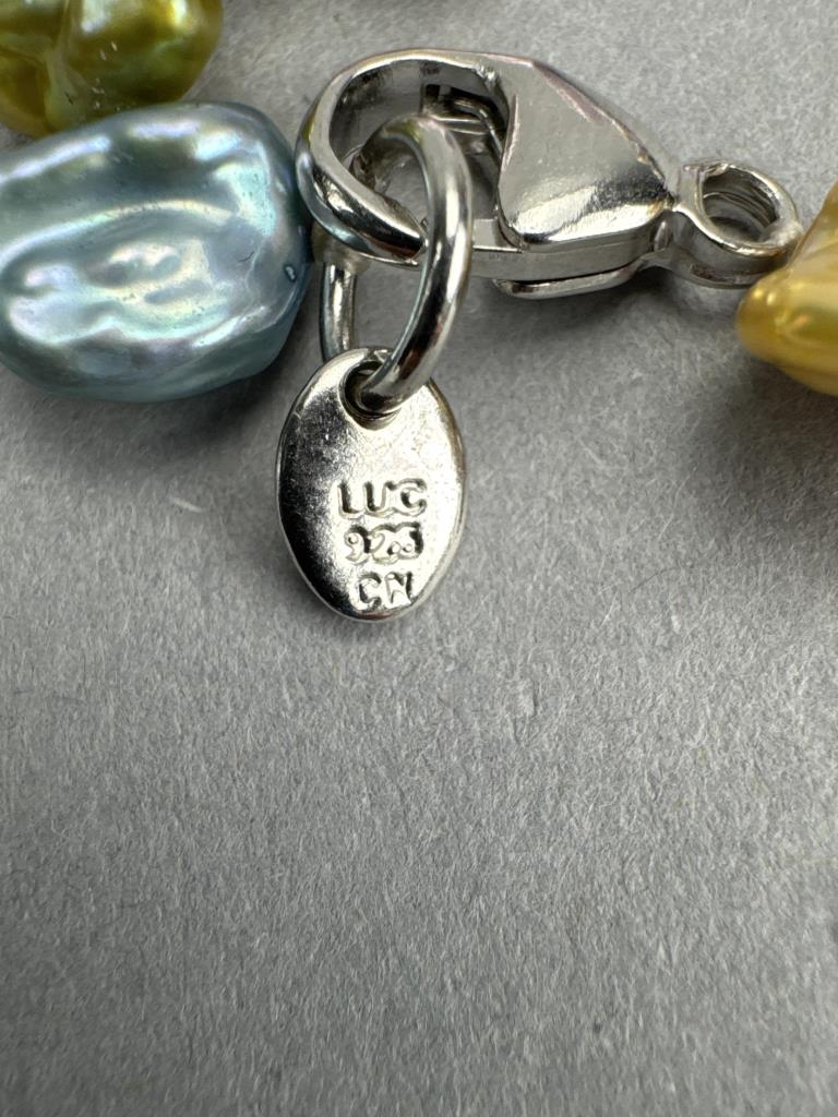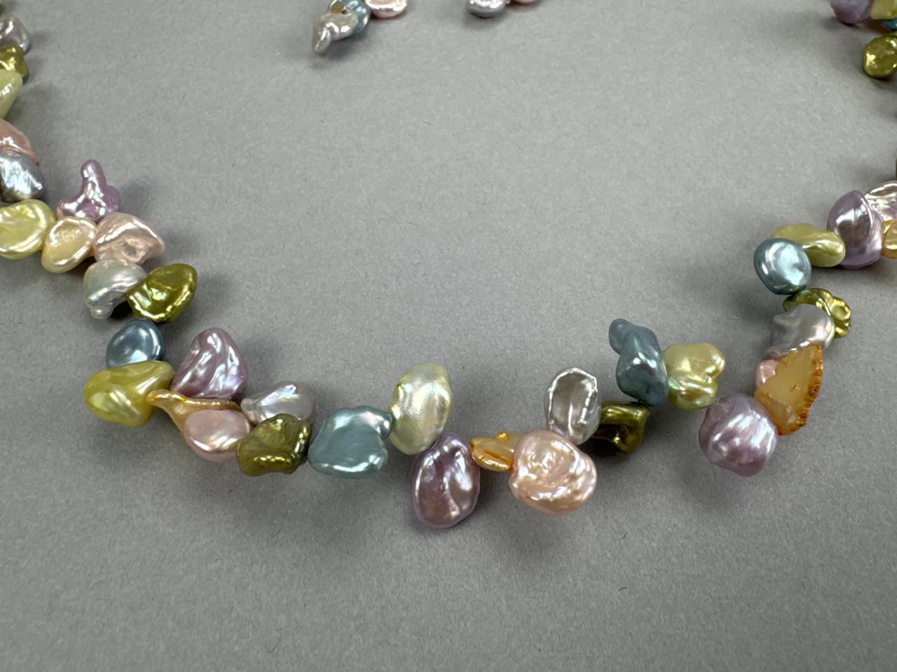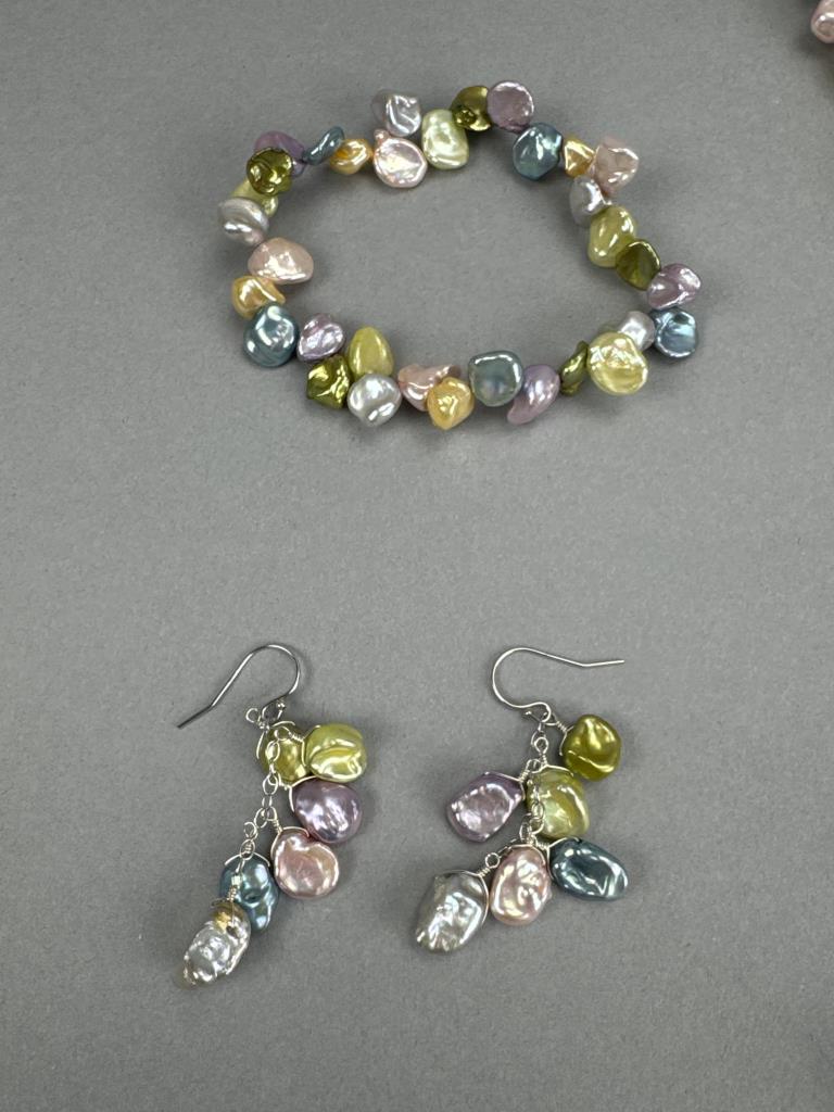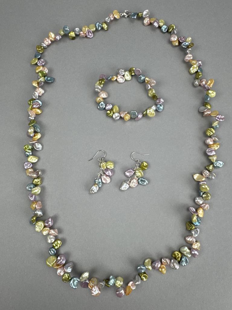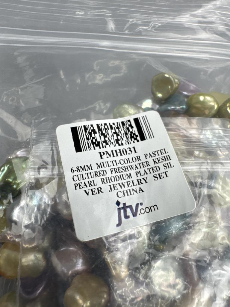 Jtv PMH031 – 6-8mm multi-color pastel cultured freshwater Keshi pearl rhodium plated over silver jewelry set. 34 inch necklace marked LUC 925 CN, stretch bracelet, earrings marked 925.