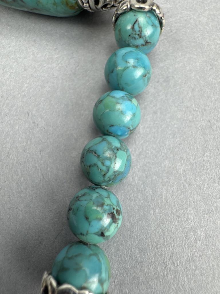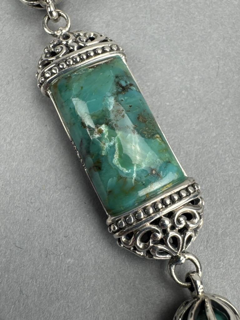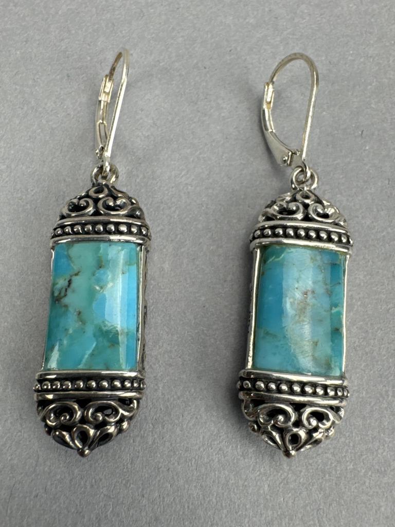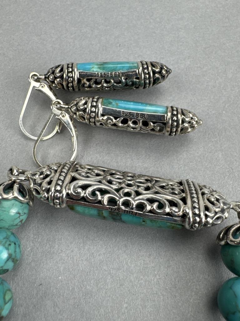 Jtv AKH167B-72 7 + 1 inch toggle clasp silver and turquoise bracelet marked 925 BBJ and weighs approx. 22.6 grams. Jtv AKH167E silver and turquoise dangle earrings, weighs approx. 10.0 grams total.