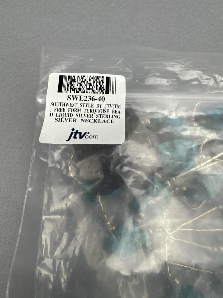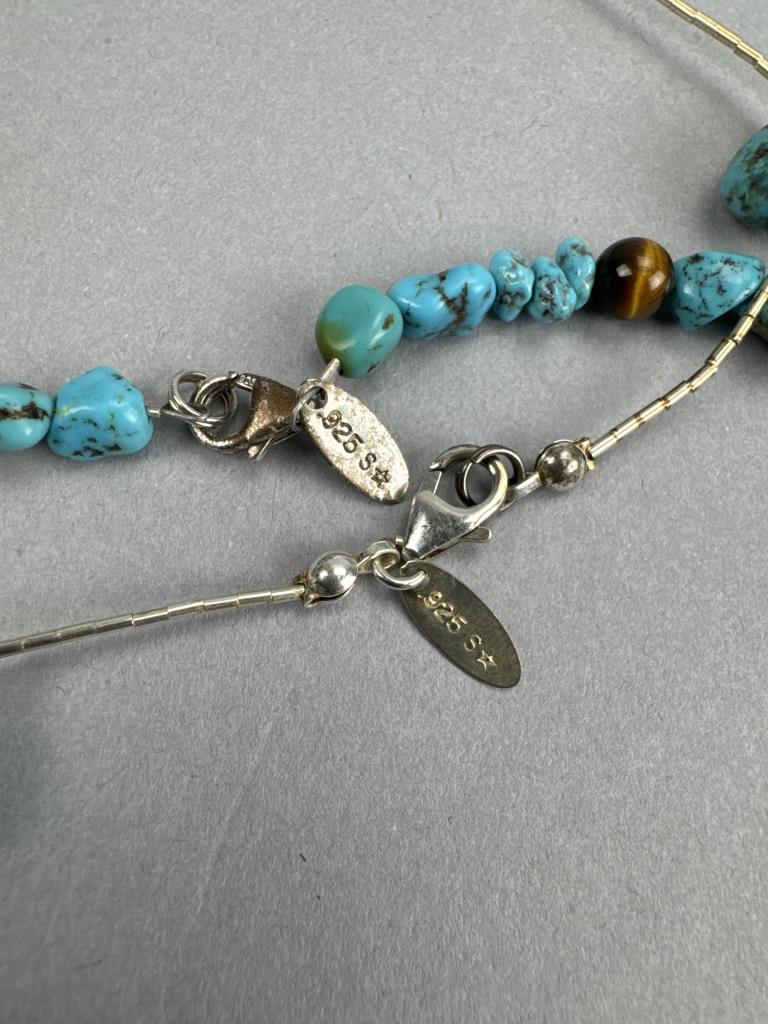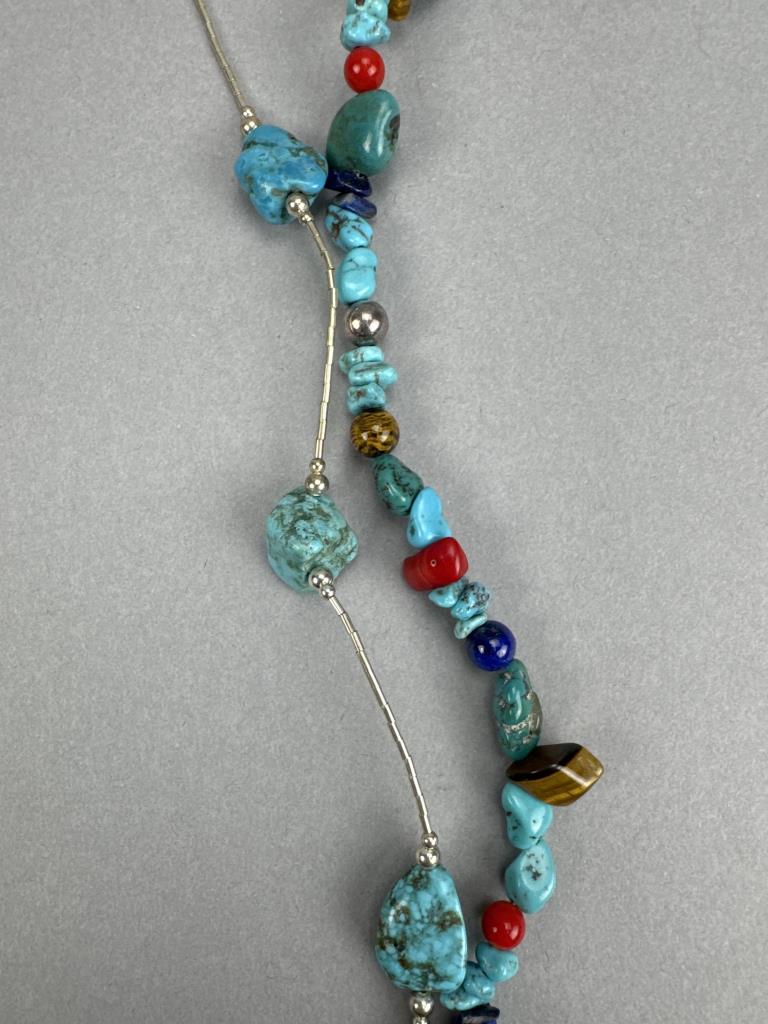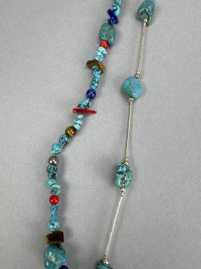 Jtv SWE236-40 40 inch Southwest style free form turquoise bead liquid silver necklace, marked 925 S star and weighs approx. 32.7 grams. 60 inch turquoise, tiger eye, lapis, red coral, and silver beads necklace marked 925 S star and weighs approx. 73.8 grams.