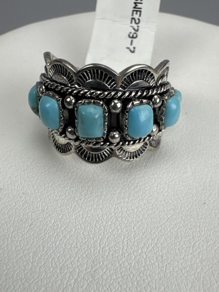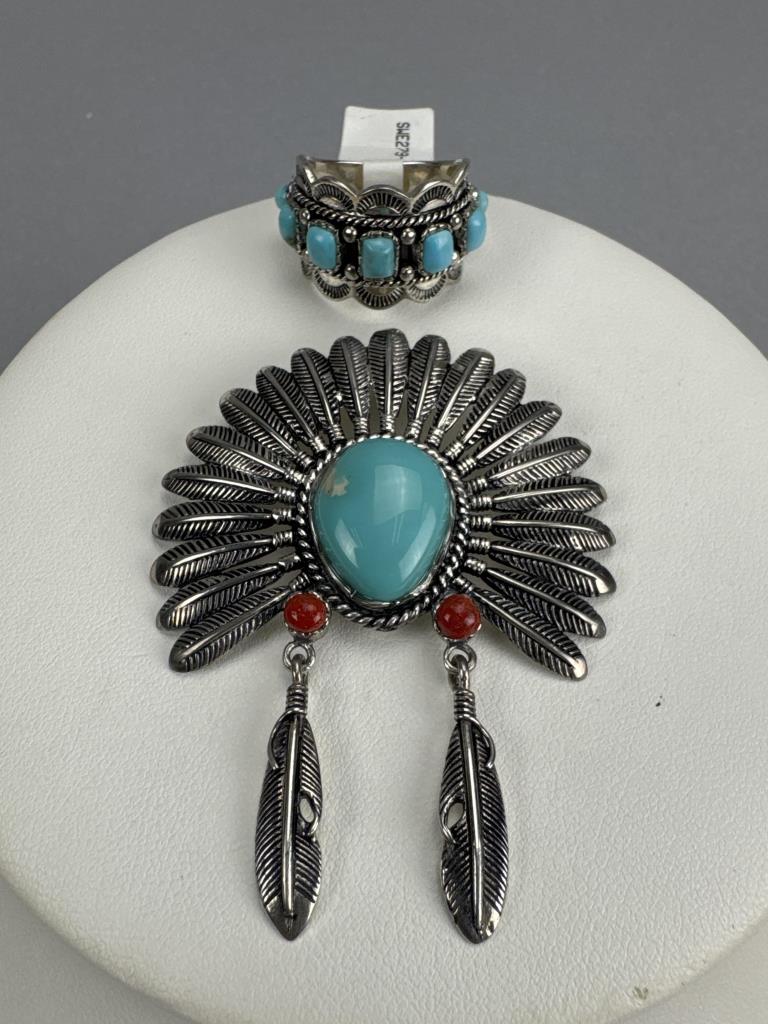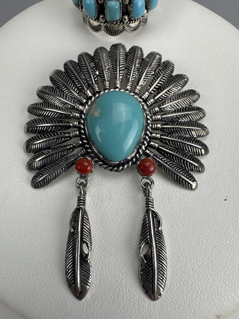 Southwest style sterling silver turquoise and red coral headdress pendant marked 925 NK THAILAND and weighs approx. 14.4 grams. Sterling silver ring is marked 925 NK THAILAND, size 7, and weighs approx. 6.7 grams.