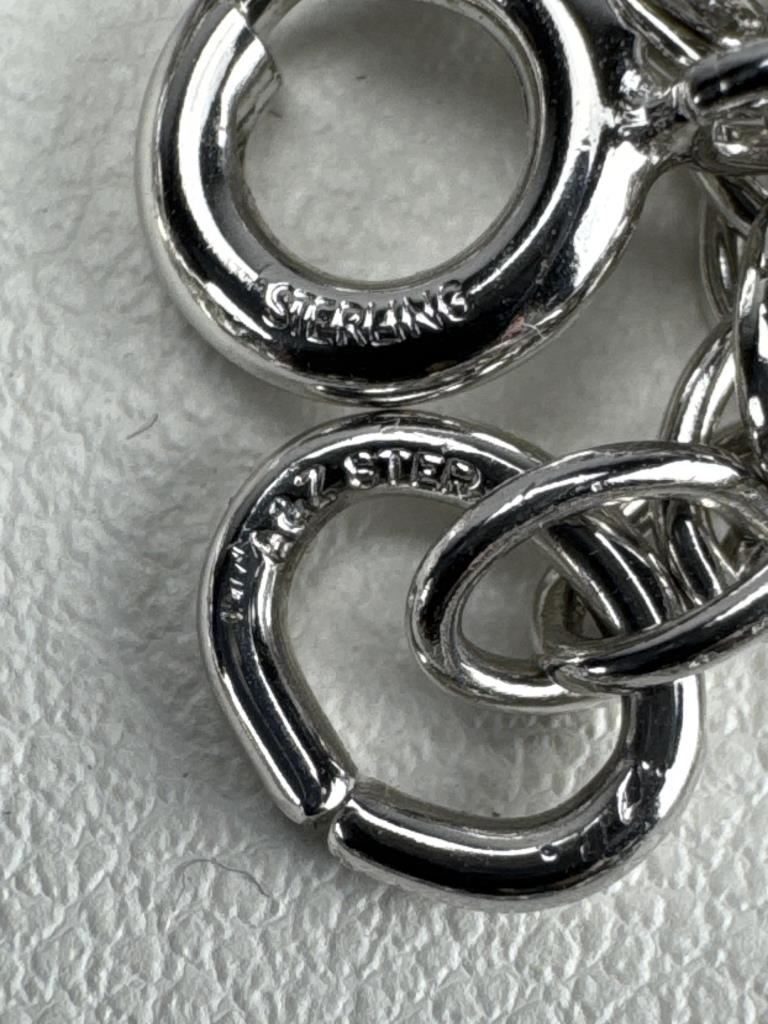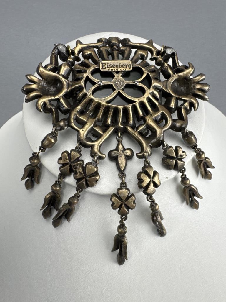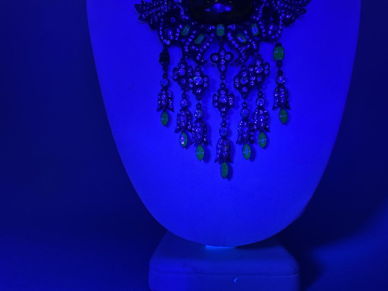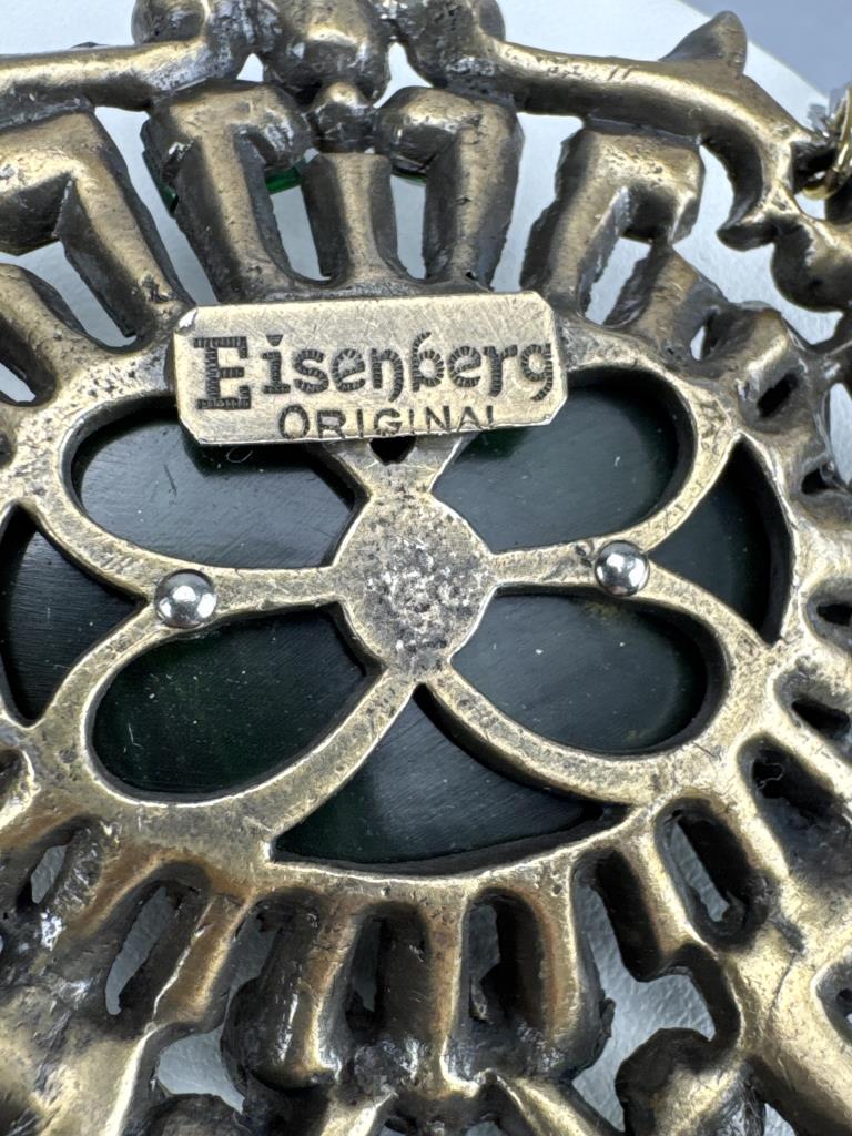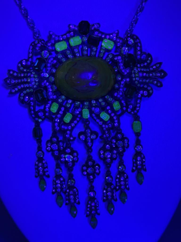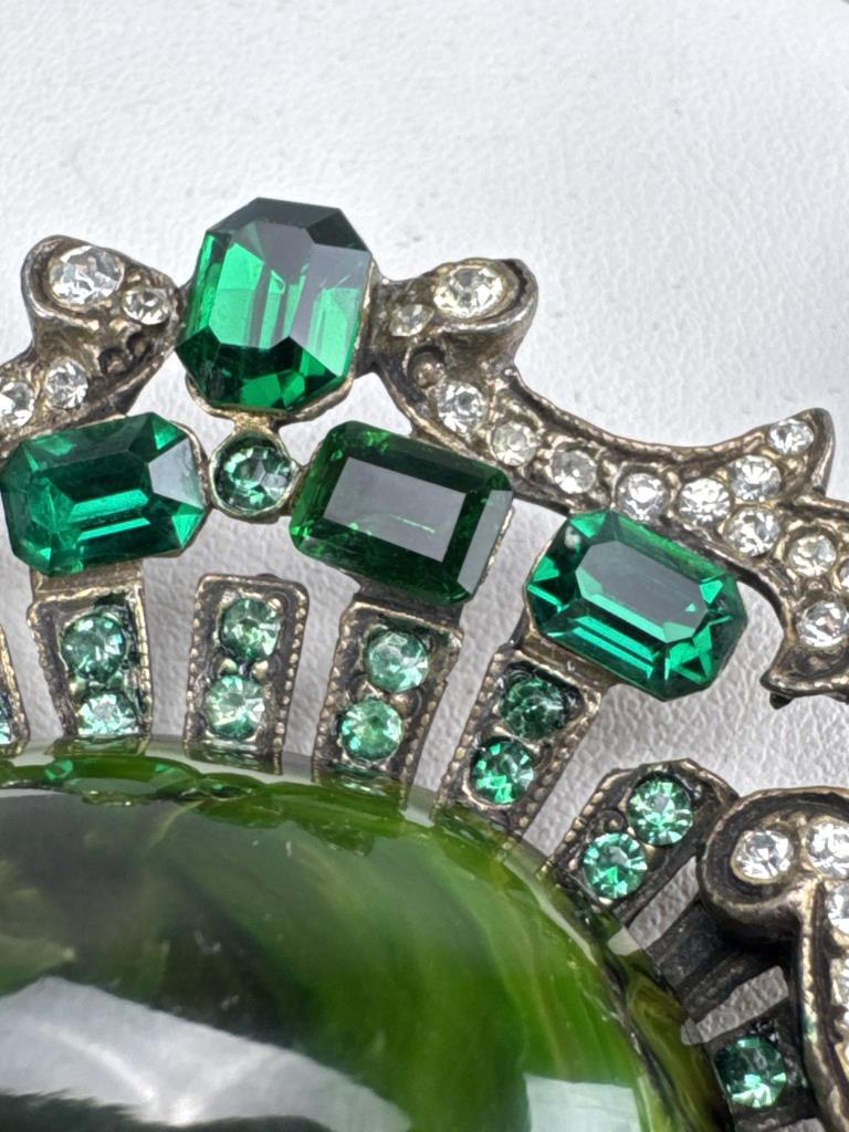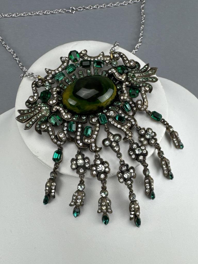 Circa 1930s-1940s pendant featuring a large marbled green molded Czech glass cabochon surrounded by emerald-tone (some uranium based) and clear rhinestones. Necklace is marked A &Z STERLING and one emerald was professionally replaced. Weighs approx. 110.2 grams.