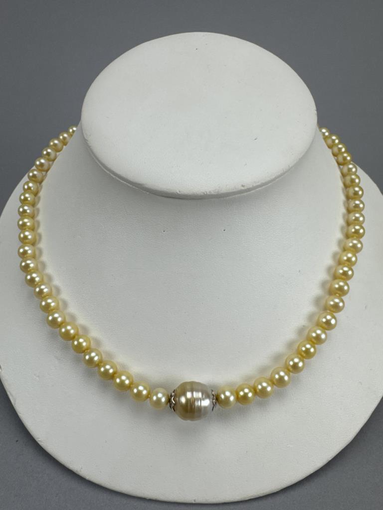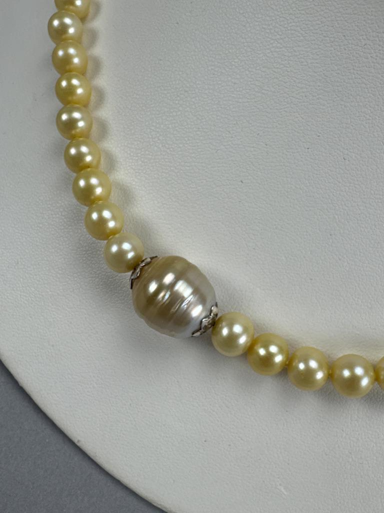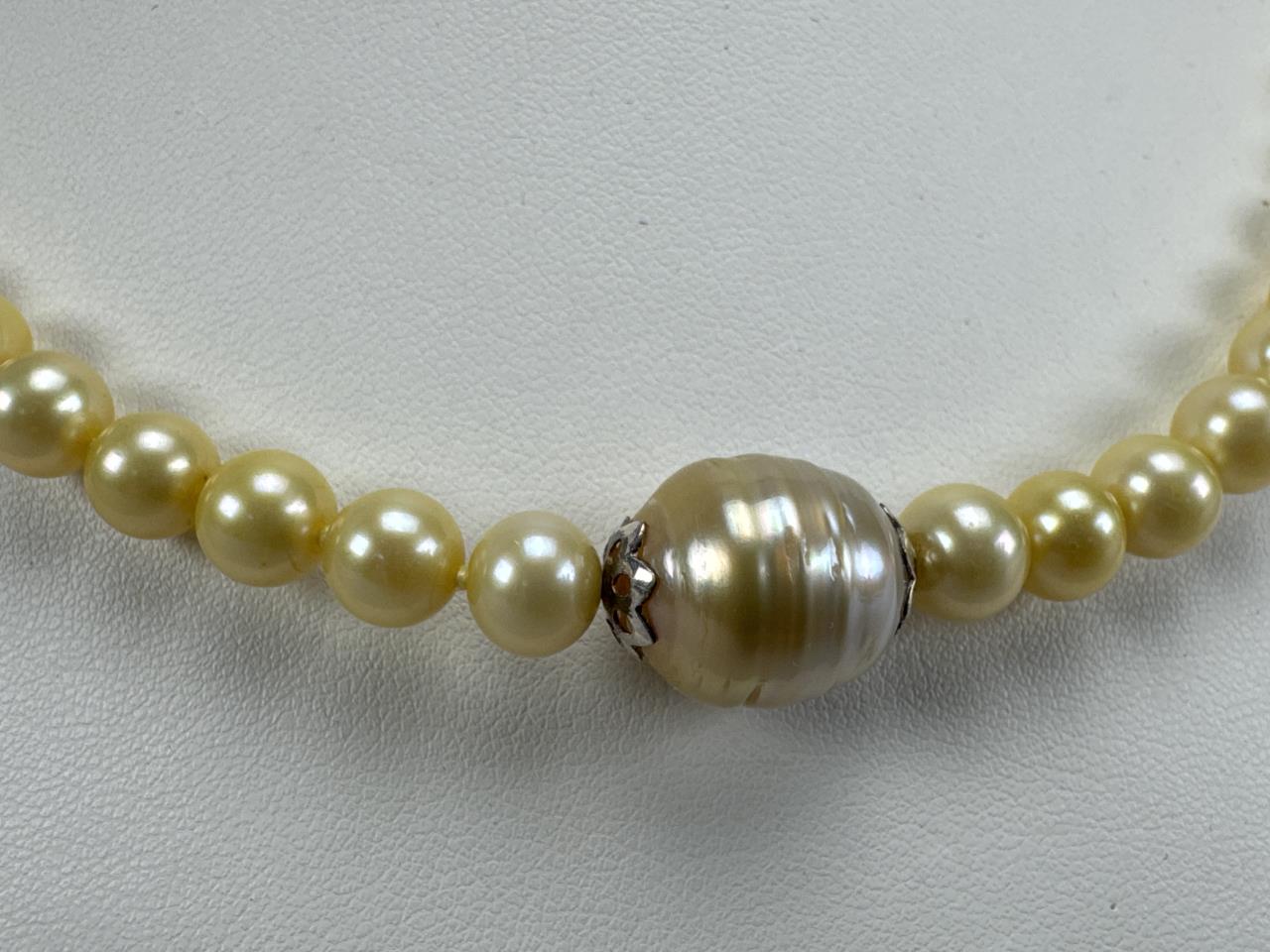 Clasp is marked B 925. Round pearls measure approx. 7.5mm, large Baroque pearl measures approx. 13.4 x 14.5mm. Weighs approx. 38.6 grams.