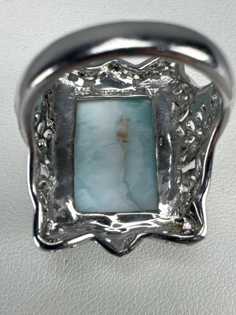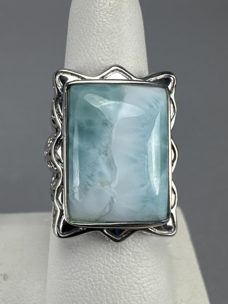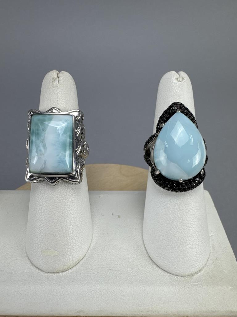 18.5 x 13.5 mm larimar and filigree ring is marked 925 THAILAND NK, size 7, and weighs approx. 9.5 grams. 21.5 x 16 mm larimar and black spinel ring is marked * 925 China, size 7 and weighs approx. 9.2 grams.