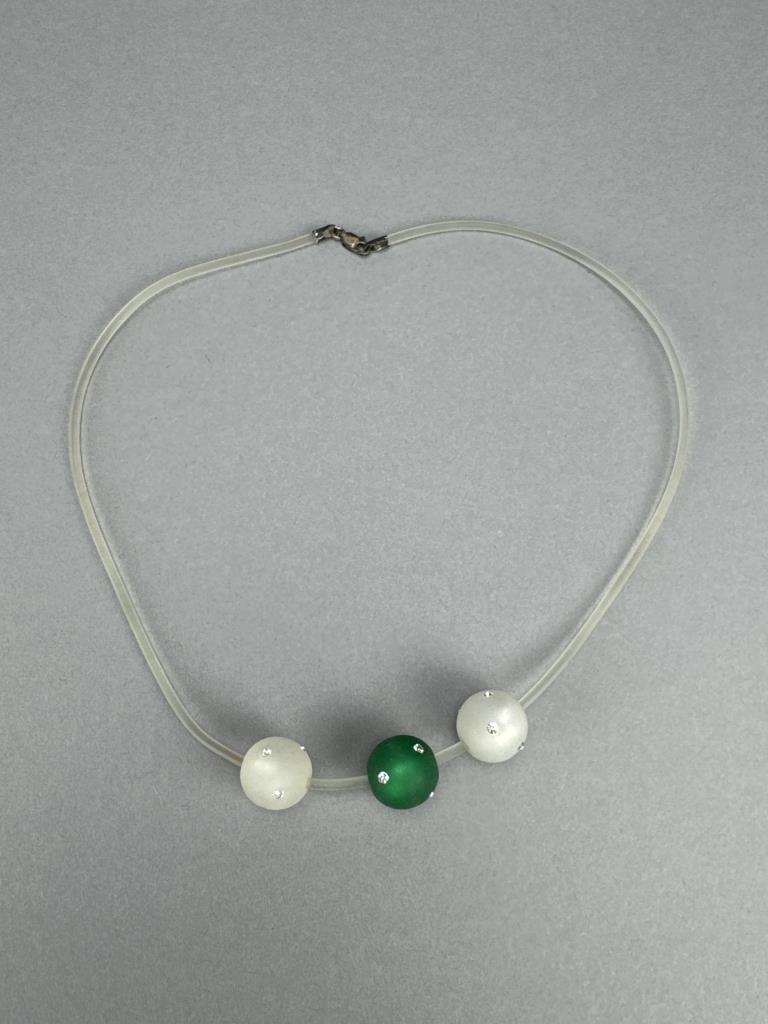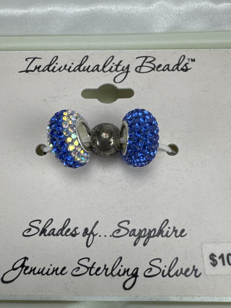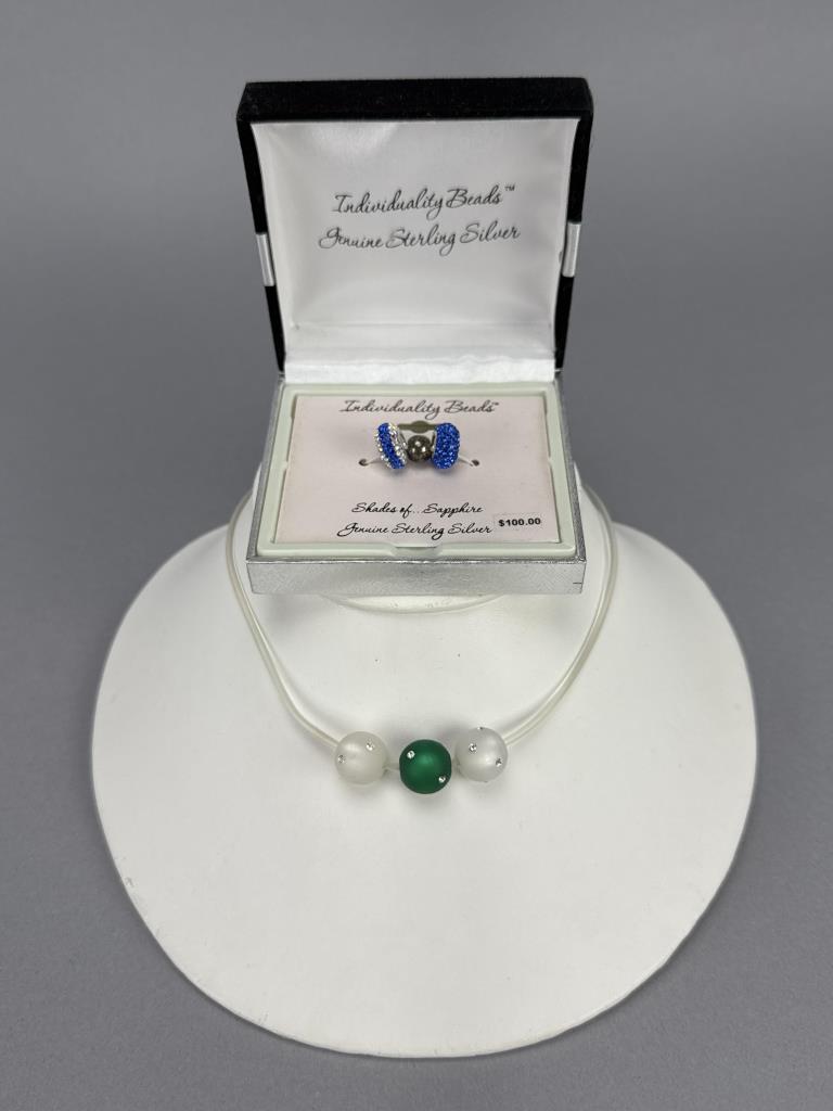 Sterling silver Individuality Beads shades of sapphire in original box. 16 inch silver clasp clear rubber cord necklace with green and white beads
