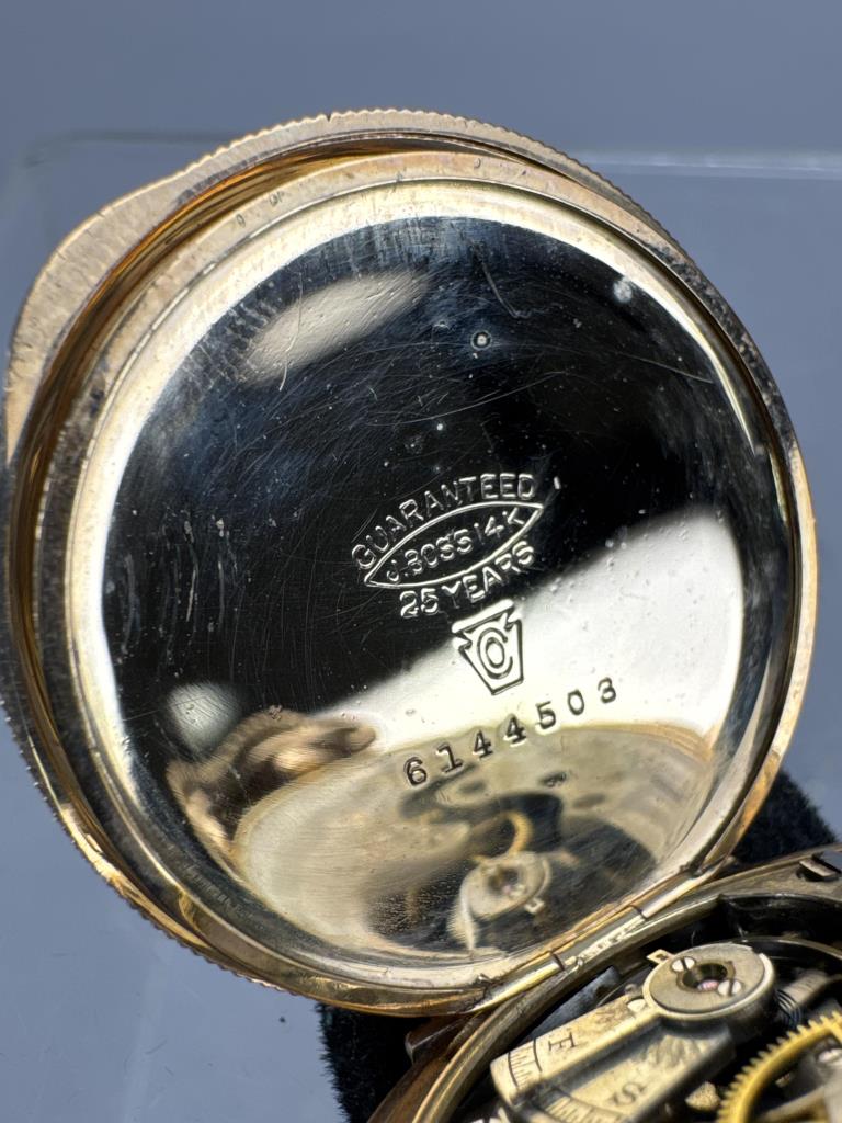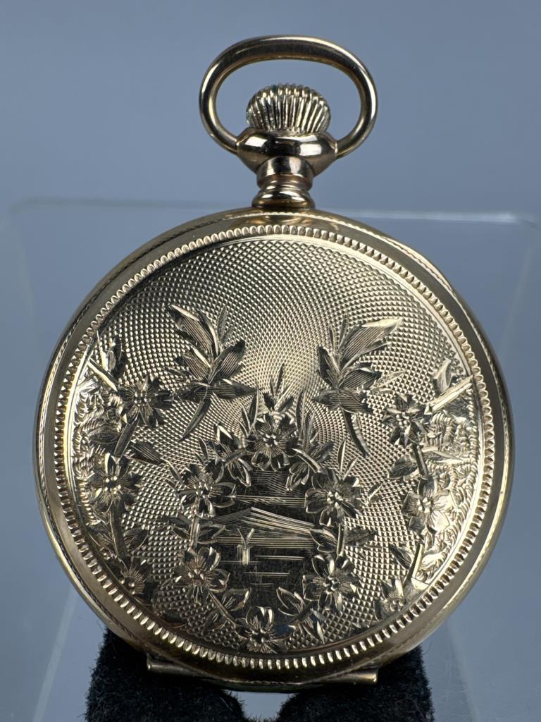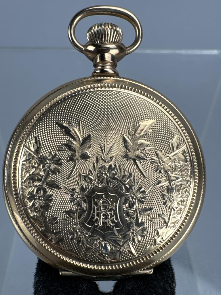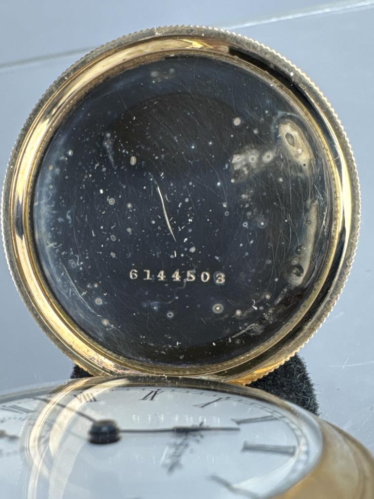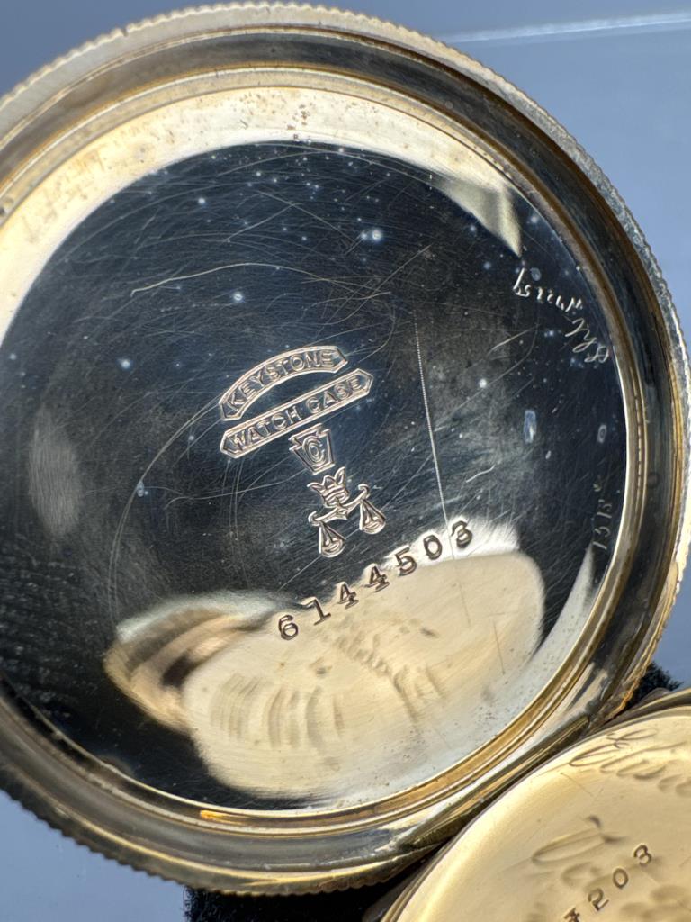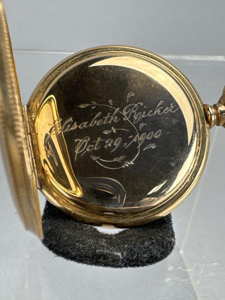 Serial No. 8451540. Os, 15 jewel. Grade: 223. 14K Gold filled Hunting case (matching numbers 6144503) with engine turned / floral design with monogram on one panel, other with lake and mountain scene. Inside cover engraved “Elisabeth Ricker / Oct 29, 1900.” Pendant wind, Unable to set time. Average condition. Appears to be running. Total Wt: 38.6 grams.