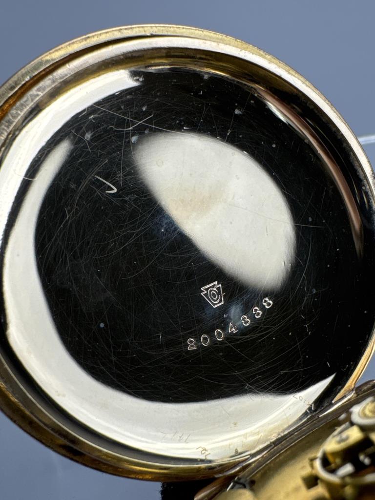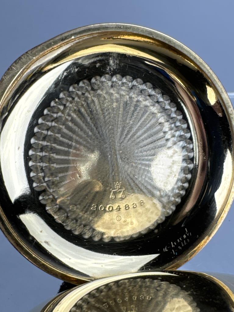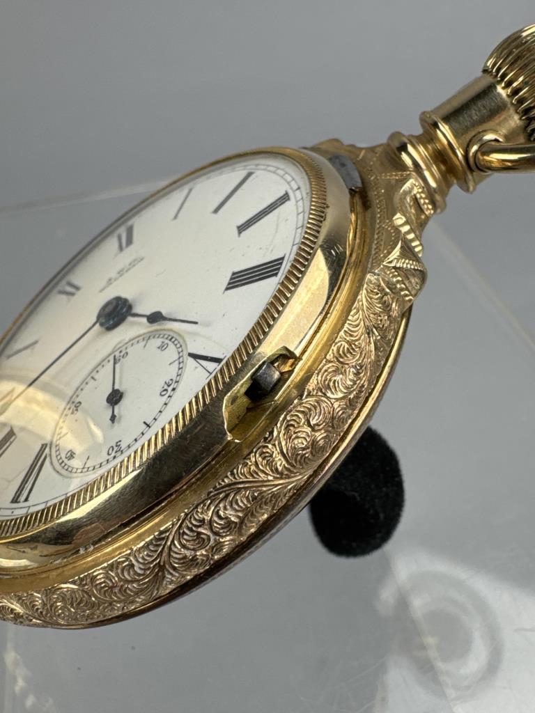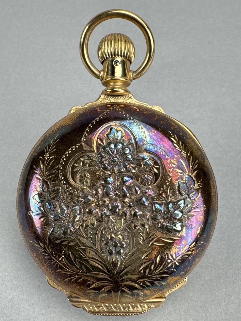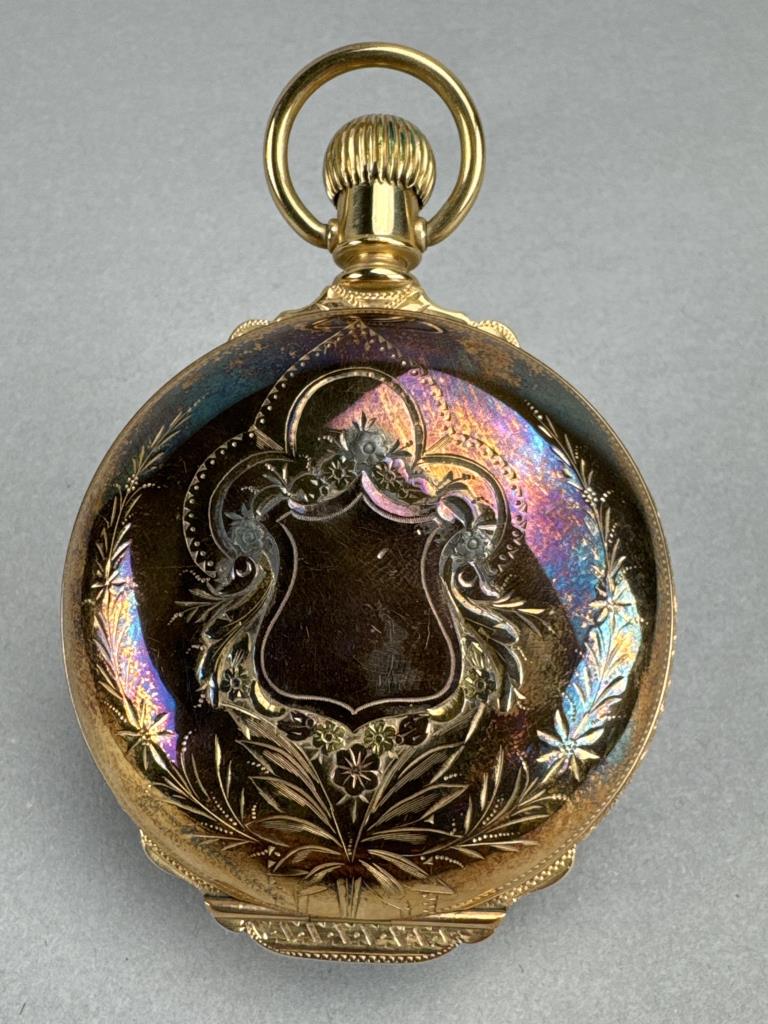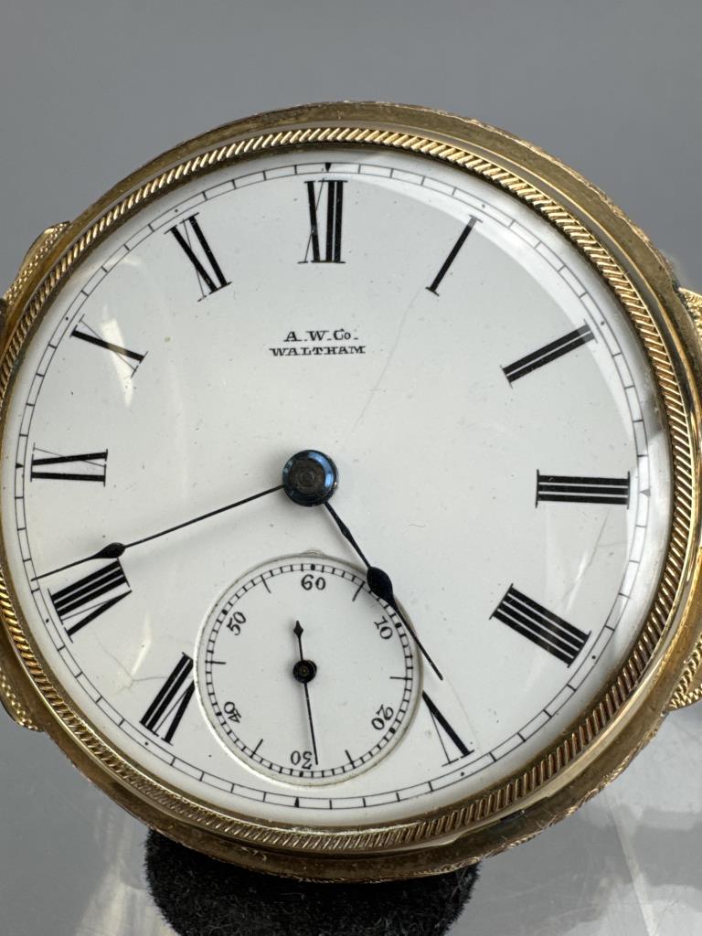 Serial No. 2724000, 1885/1886. American Waltham Watch Co., Waltham, MA. 14K gold filled. Etched case, back inside cover is marked Crown over Balance Scales 2004838; inside movement cover marked Co within angled box; white dial with black roman numerals and hands, sub-seconds dial. Face marked A. W. Co. Waltham; 13 jewel, stem wind, lever set, grade R. E. Robbins, 18 size. Measures 2 1/8 x 3 3/16” to stem loop top. Toned, case worn, stem somewhat loose. Weighs 144.8 grams (93.1 dwt).