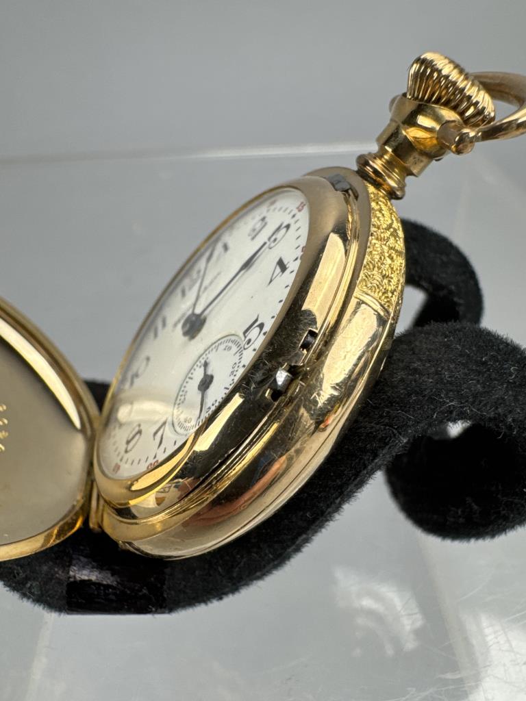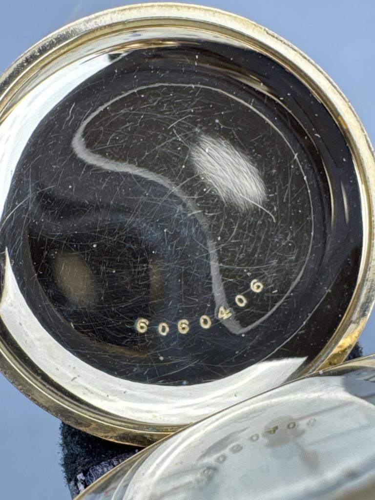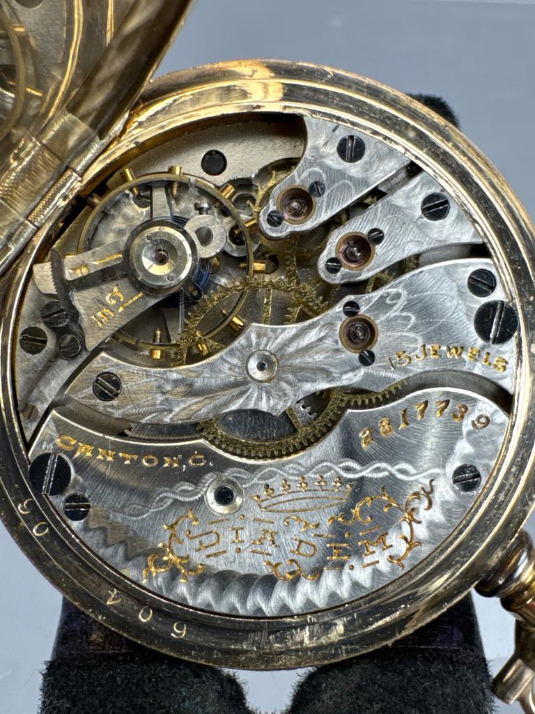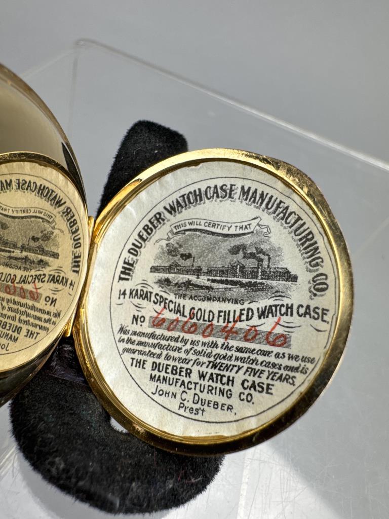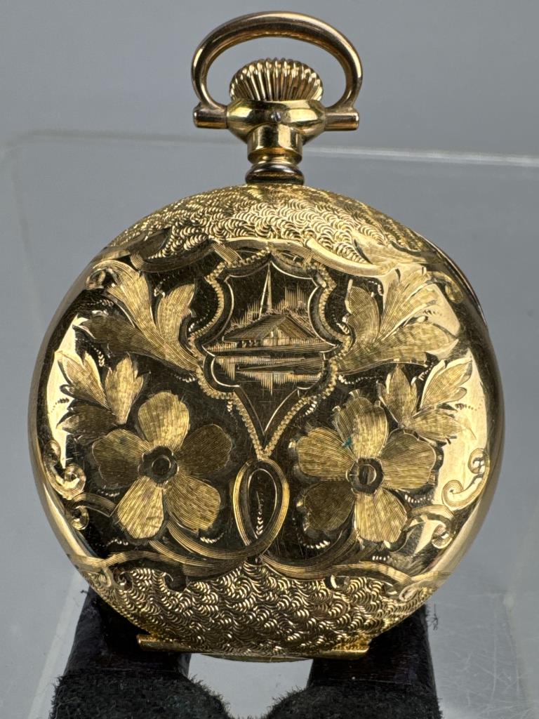 Serial No. 2817739, Model 4. 3/0 size, 15 jewel. Grade: Diadem. 14K gold filled Hunting case (Serial No. 6060406) with floral design, and “B” engraved on one side. Lever set, pendant wind. Paper label on inside back cover. Average. Not running.