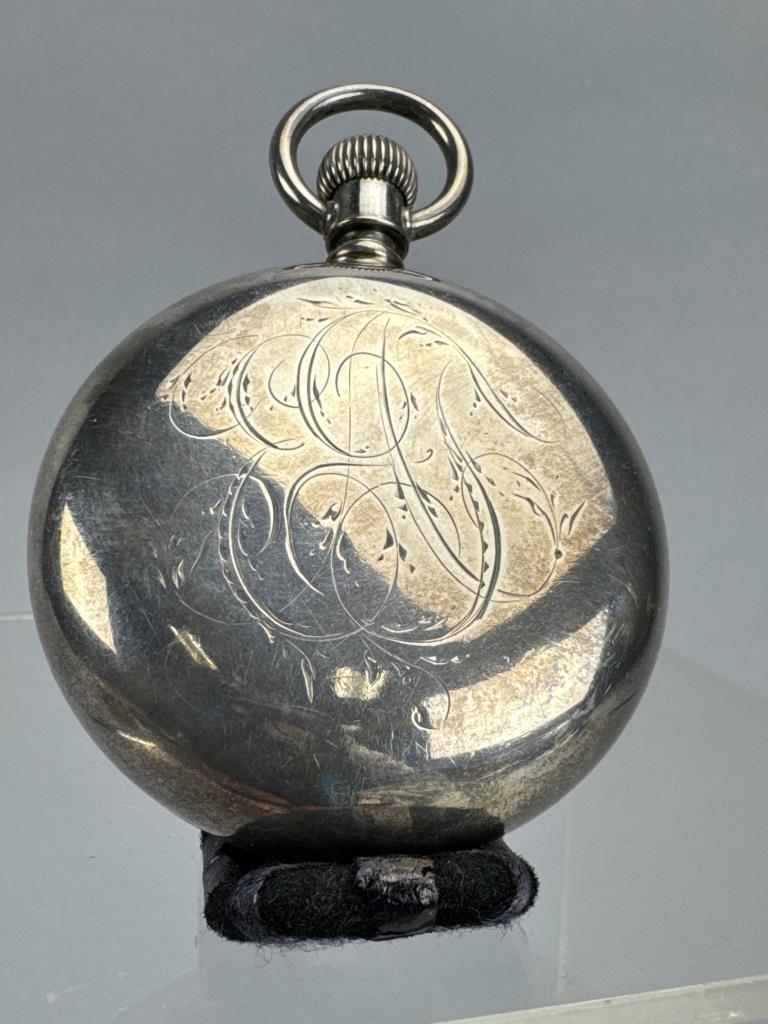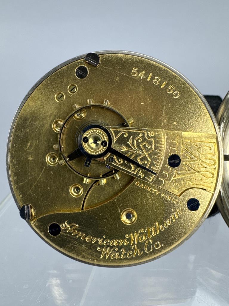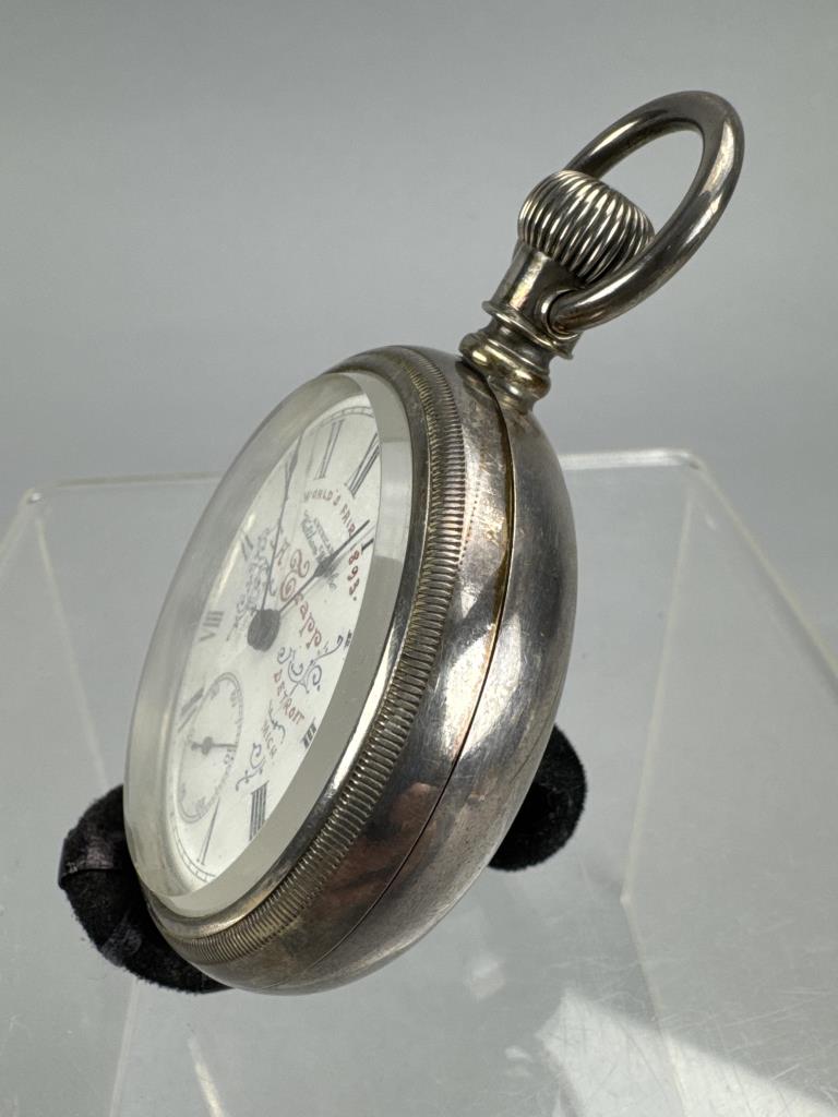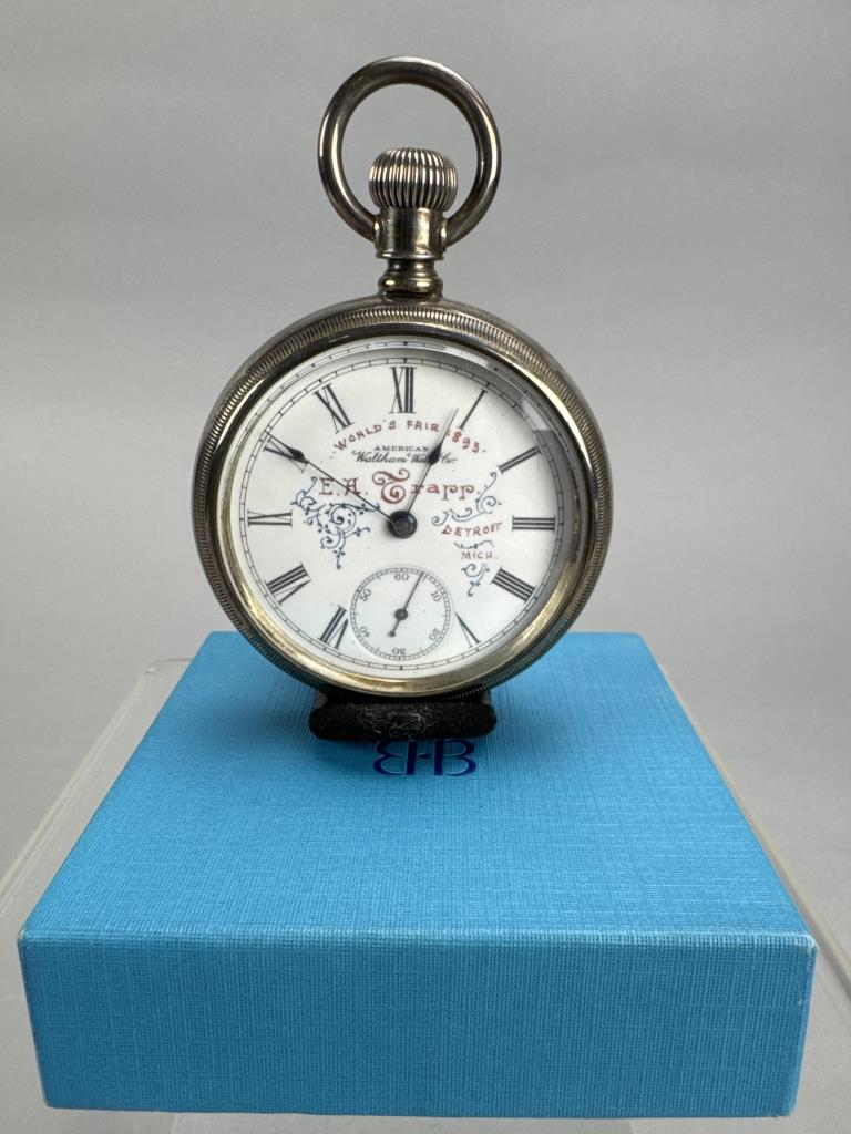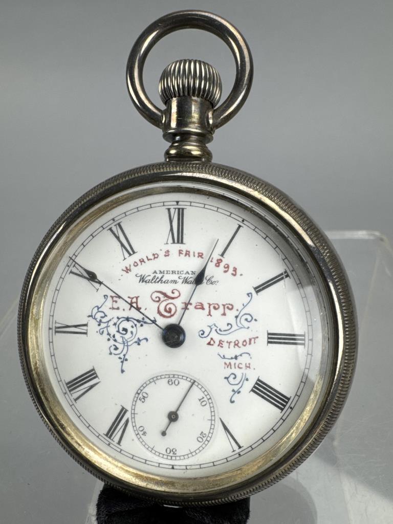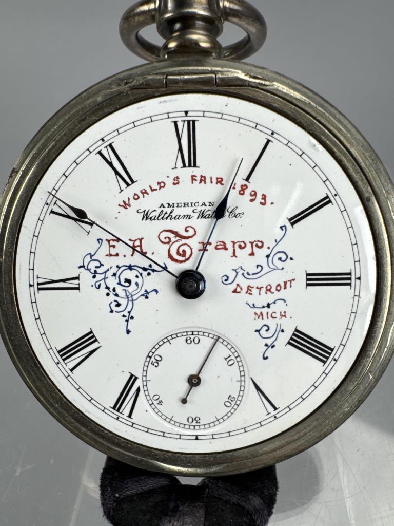 Serial No. 5418150, Model 1883. 18 size, 7 jewel. Silver open face Waltham Century case, unmarked; large monogram engraved on back. Gilt movement. White porcelain dial with black hands, sub-second dial, Roman numerals with red and blue imprint “World’s Fair 1893 / E. A. Trapp / Detroit / Mich.” on face. Pendant set and wind. Running. Case and dial worn. Nice Columbian Exposition pocket watch.