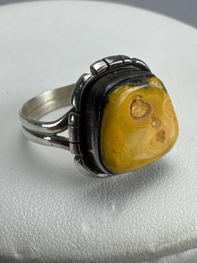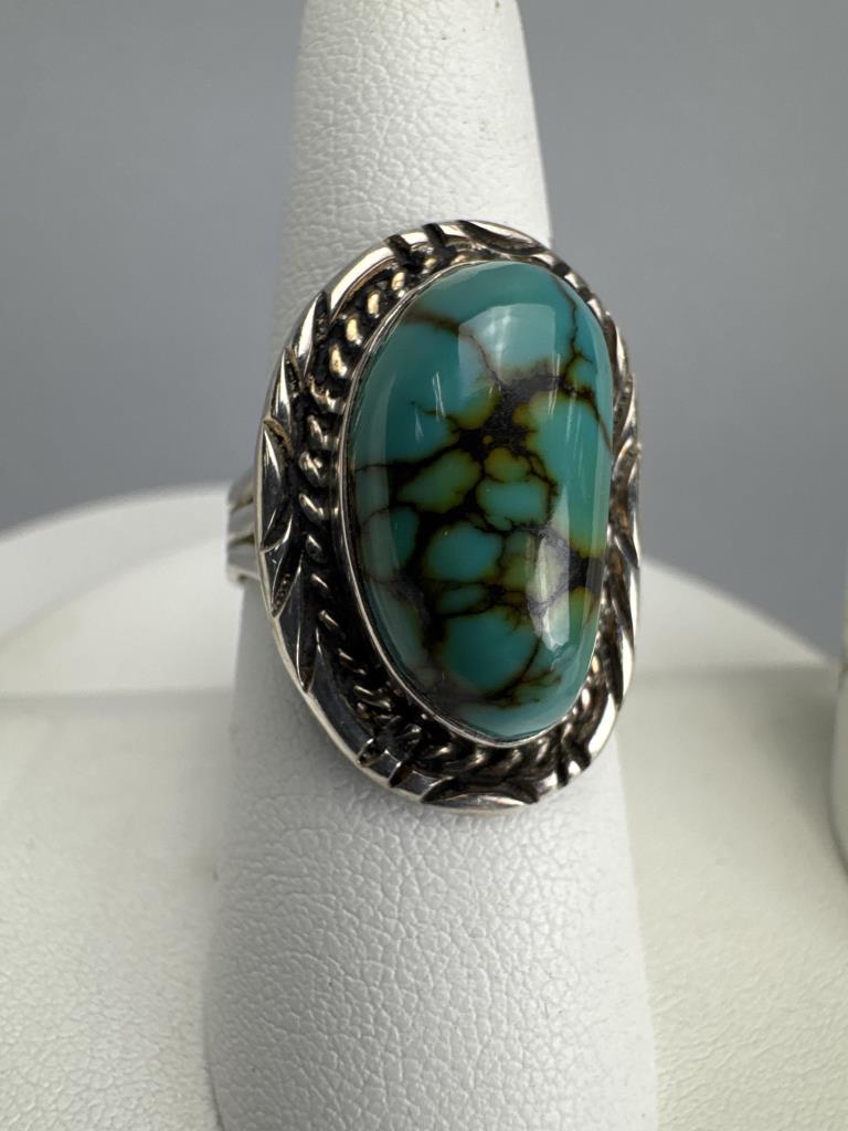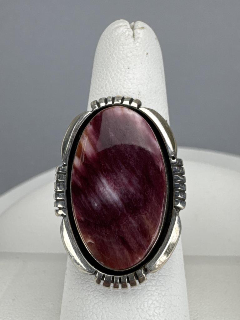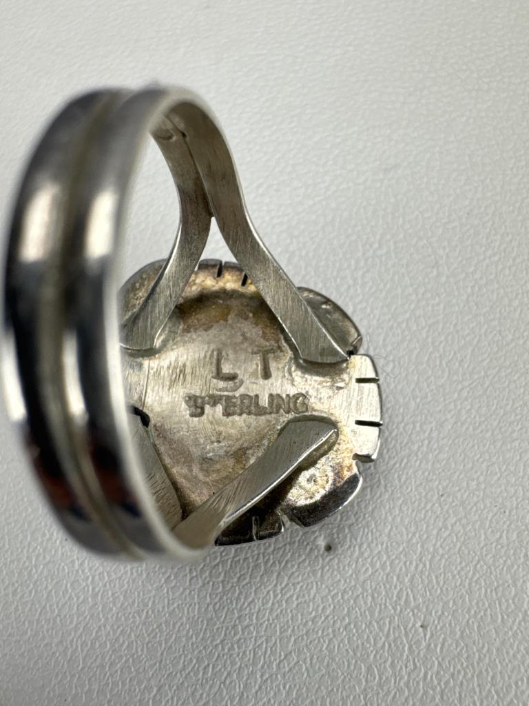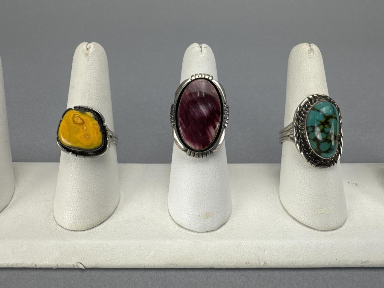 Purple Spiny Oyster ring signed D (Joe Delgarito) STERLING-size 8 1/4 & weighs approx. 9.1 grams. Spiderweb Turquoise ring signed but partially covered ?L STERLING-size 9+ & weighs approx. 8.2 grams. Yellow Spiny Oyster ring signed L T STERLING- ring size 8 3/4 & weighs approx. 5.5 grams.