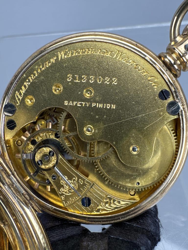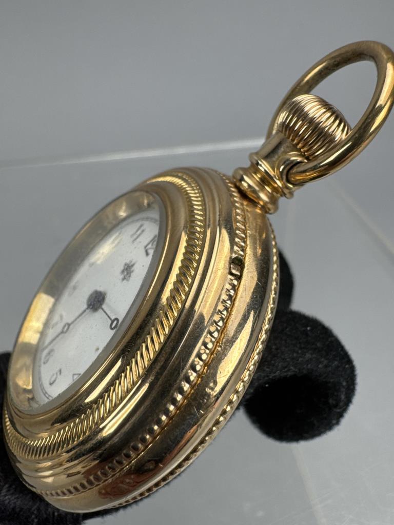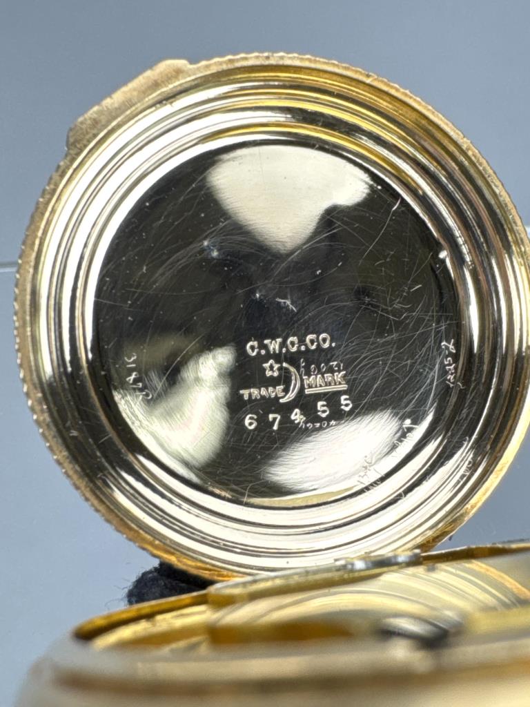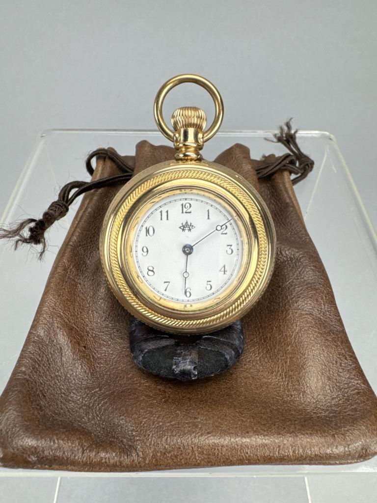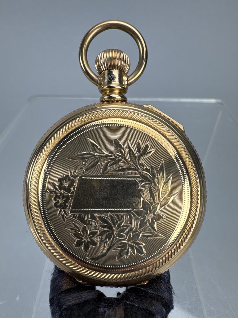 Model 1873-6. American Waltham Watch Co., Serial No. 3133022; C. W. C/ Co., gold filled watch case Serial no. 67455. Back of case with floral design and blank panel for engraving, engine turned. White dial with black Waltham monogram and hands, no second hand. Arabic numbers. 7 jewel, stem wind and set, grade: E, 6s size. Measures 38 x 57mm to stem top loop. Weighs 49.7 grams. Working, dial crystal with wear.