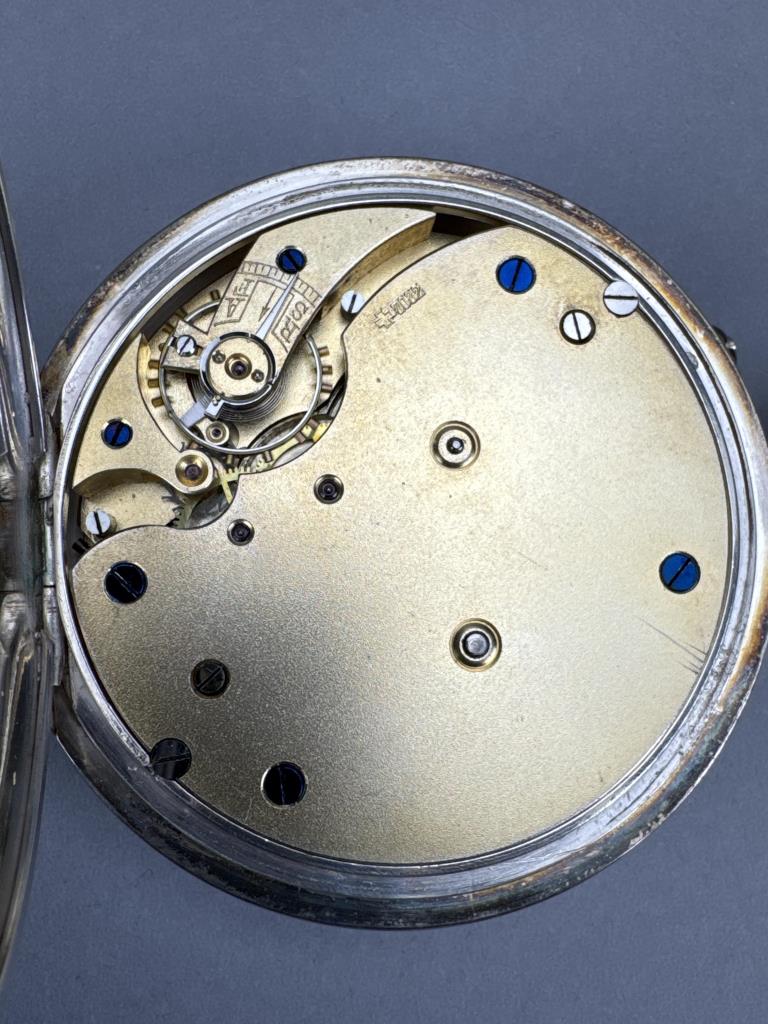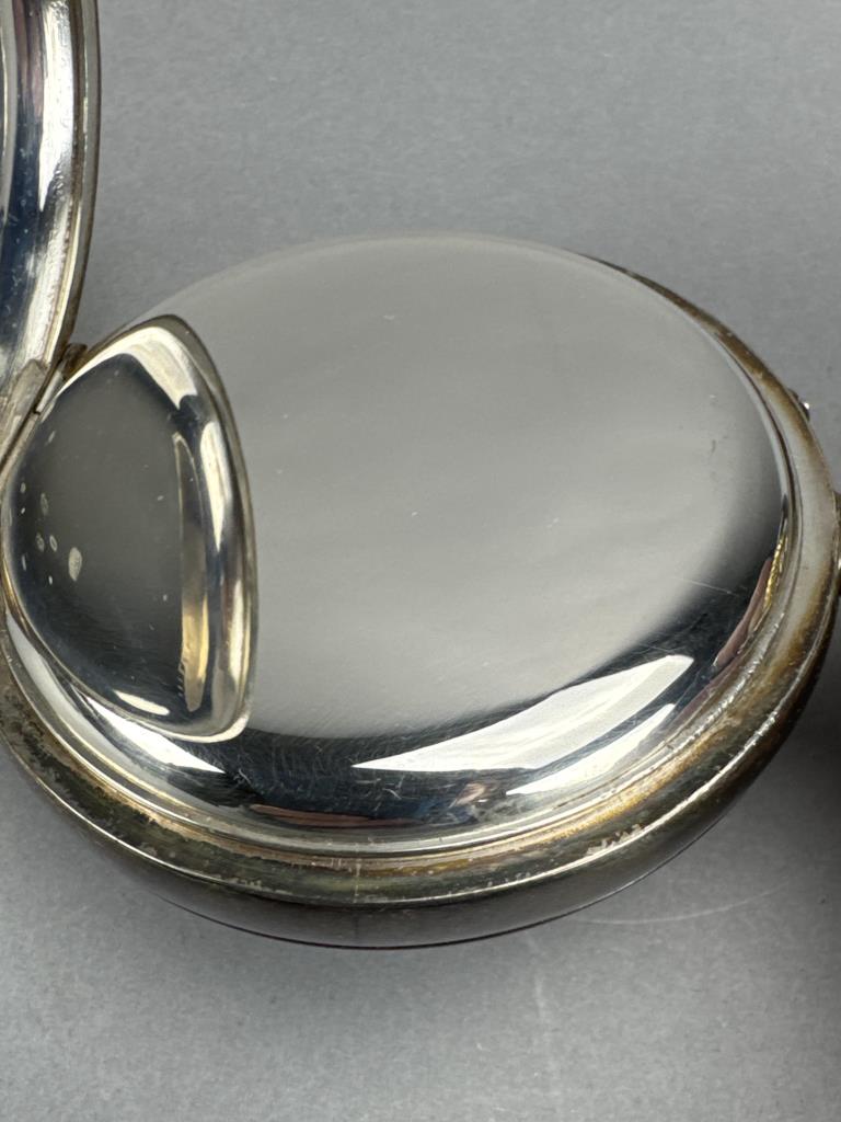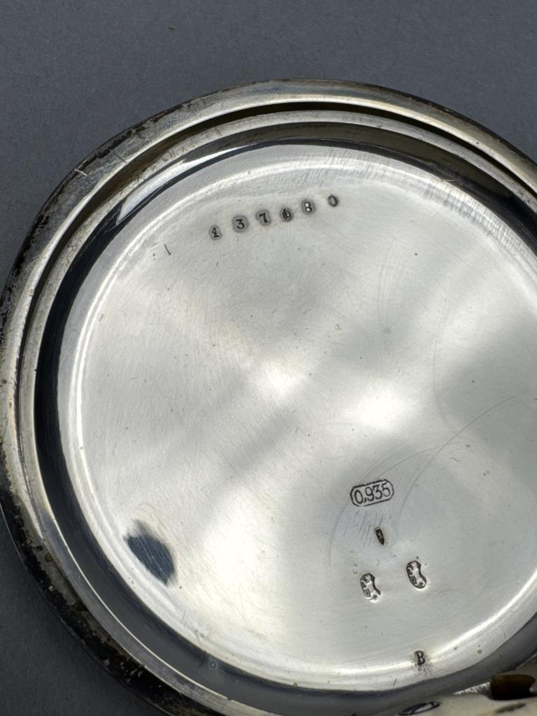 Edinburgh (Scotland) traveling bedside clock watch, c. 1900. Swiss movement by Hahn, Le Landeron, Switzerland. Serial No. +7032. 15 jewel. Gilt movement. .935 fine silver case, no embellishment, white dial with black hands, Roman numerals, sub-second dial. Total wt: 297.3 grams. Thick crystal. Case toned with a few blunt indentations, marks, wear. Heavy clock. Running.