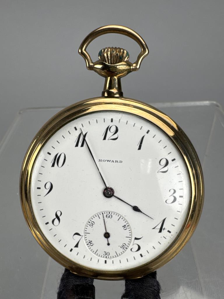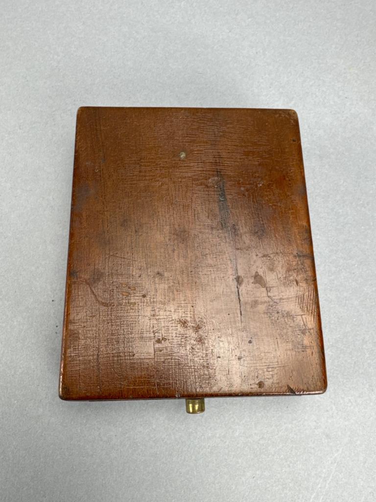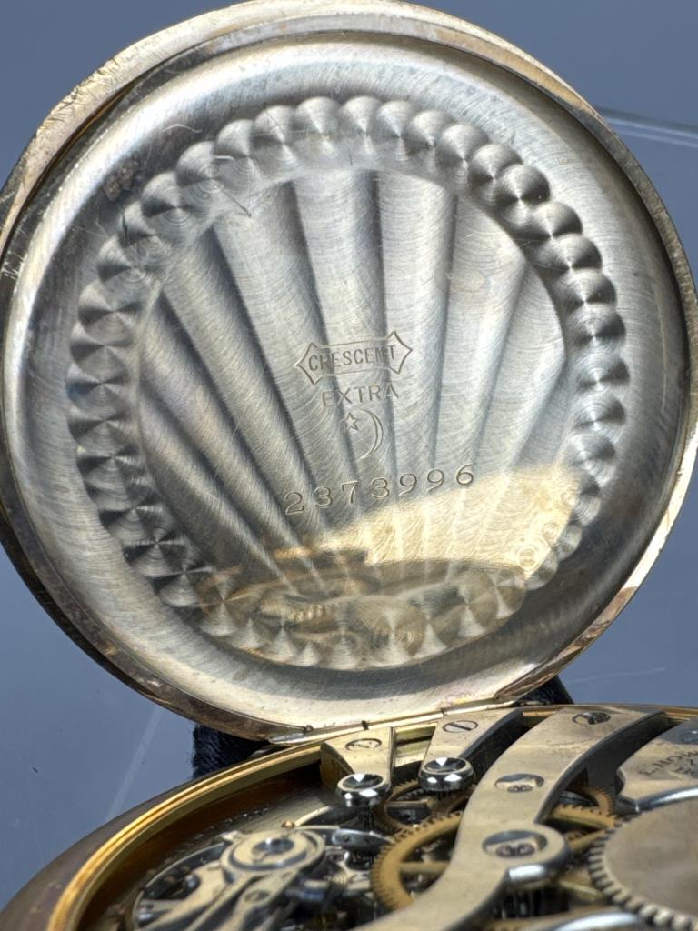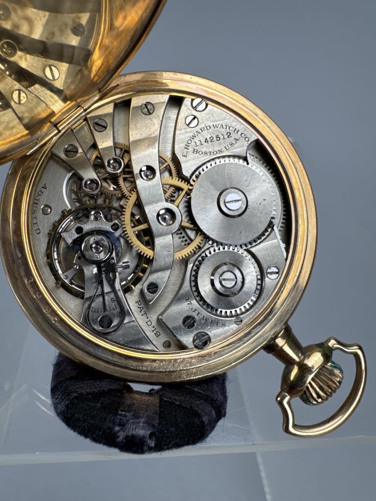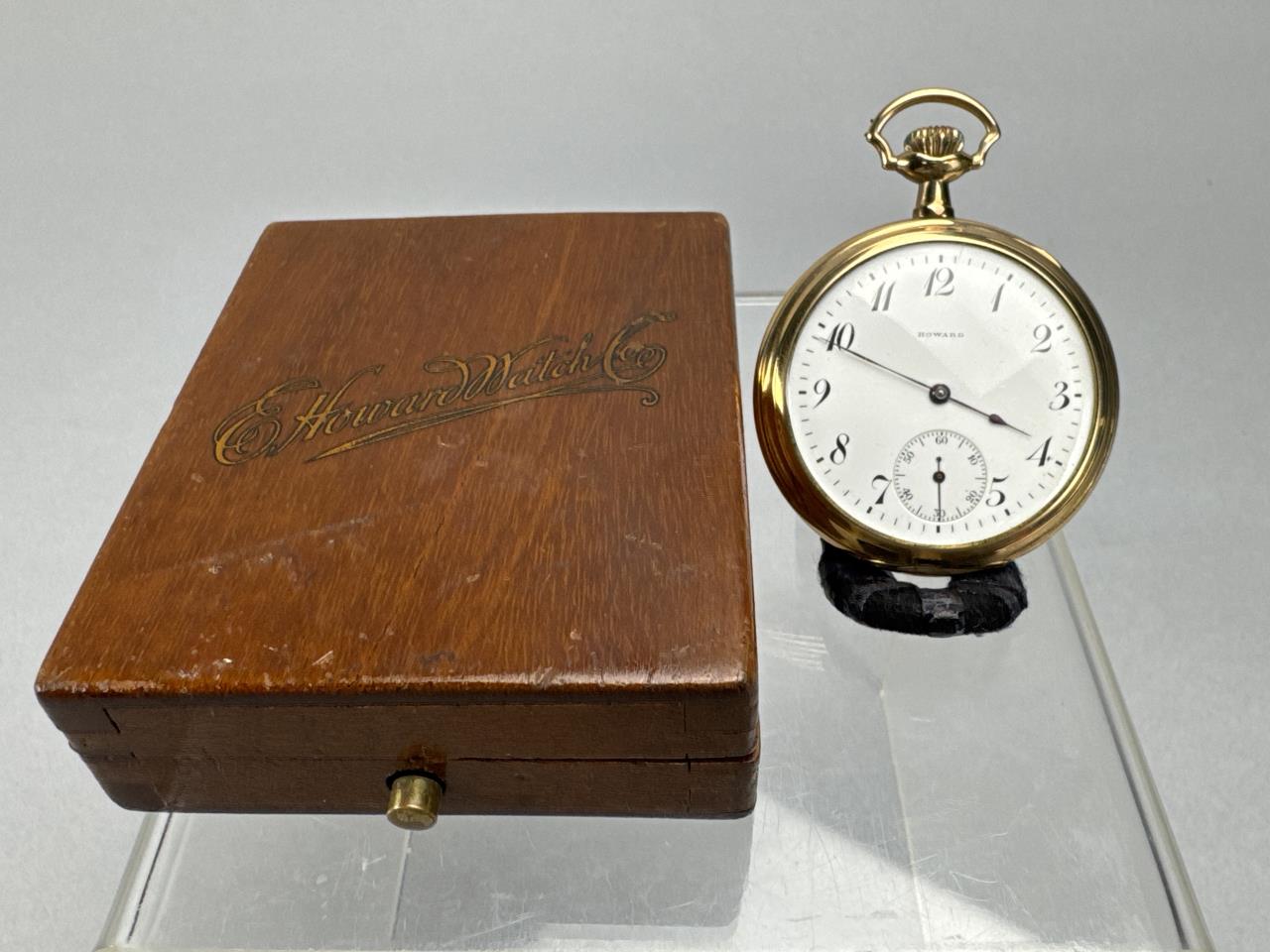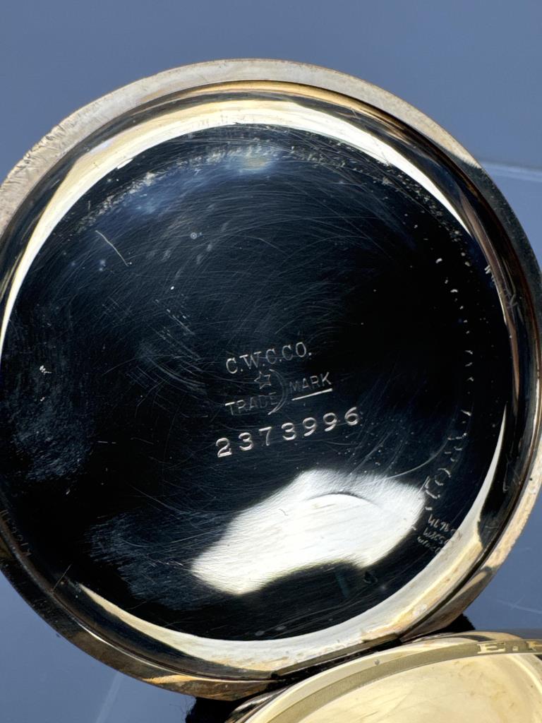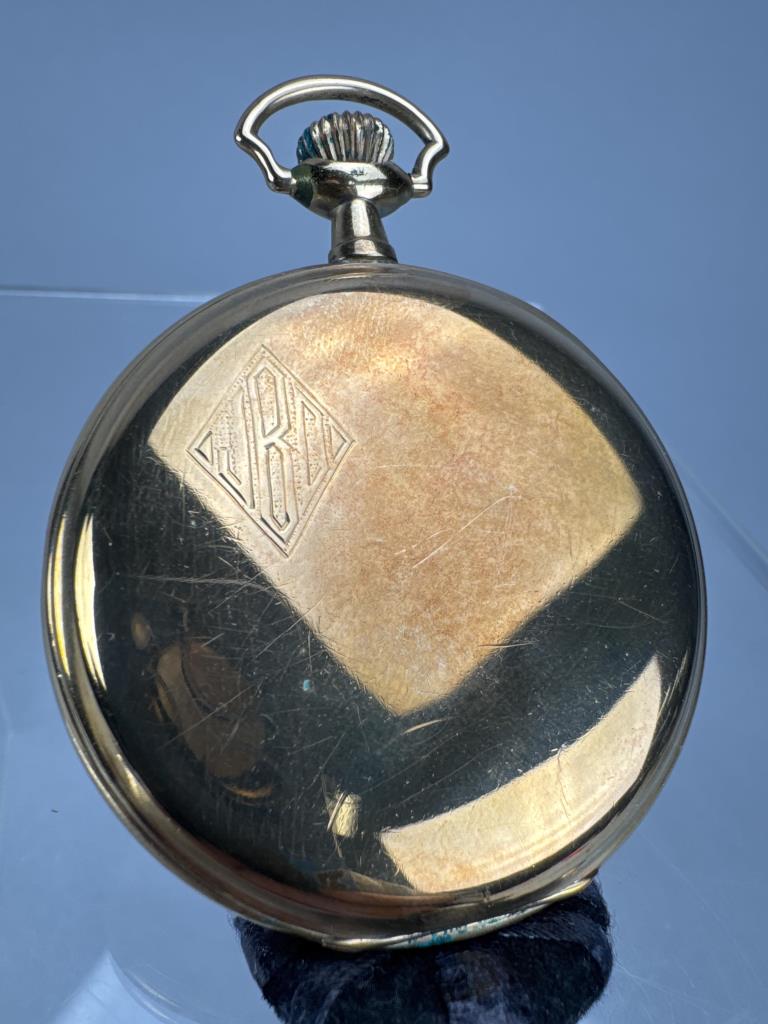Serial No. 1142512, c. 1912. Series 7. 12 size, 17 jewel, open face, white dial. C. W. C. CO. gold filled case Serial no.2373996, with monogram “JBD” on back. Crystal and case with wear, verdigris. Wood box included.