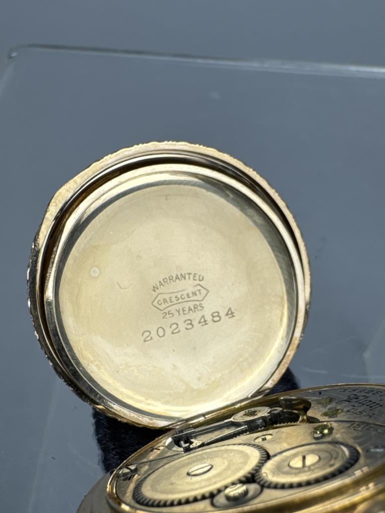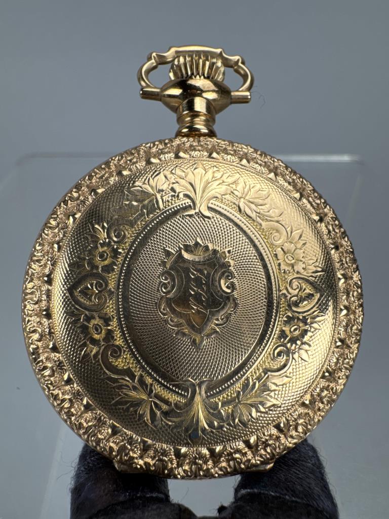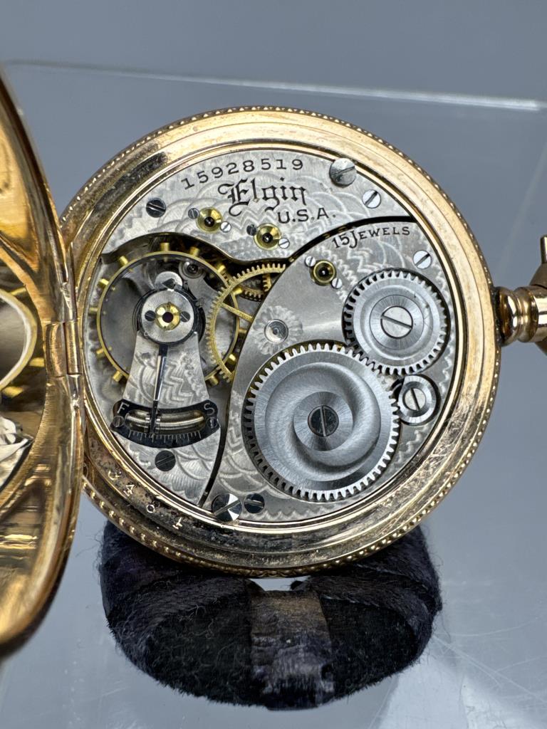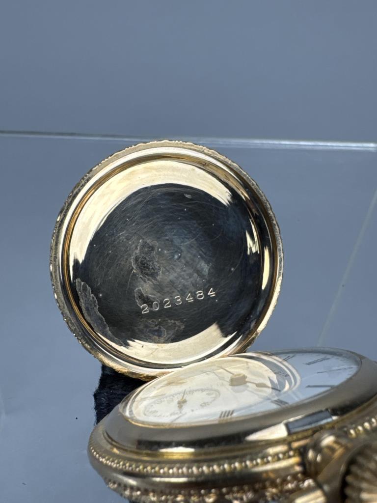 Serial No. 15928519. 0 size, 15 jewel. Grade: 354. C. W. C. CO. gold filled Hunting case Serial No. 2023484, with scrolled design and initials “V.L.L.” on cartouche.