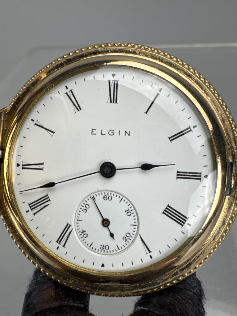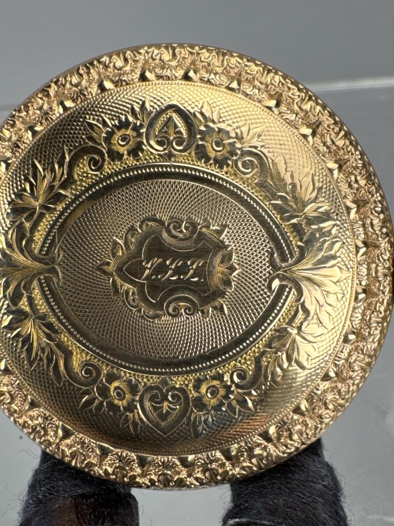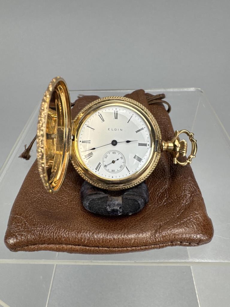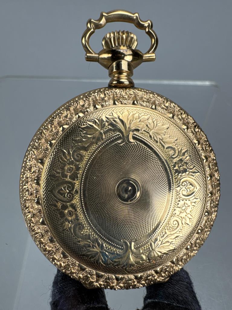 Serial No. 15928519. 0 size, 15 jewel. Grade: 354. C. W. C. CO. gold filled Hunting case Serial No. 2023484, with scrolled design and initials “V.L.L.” on cartouche.