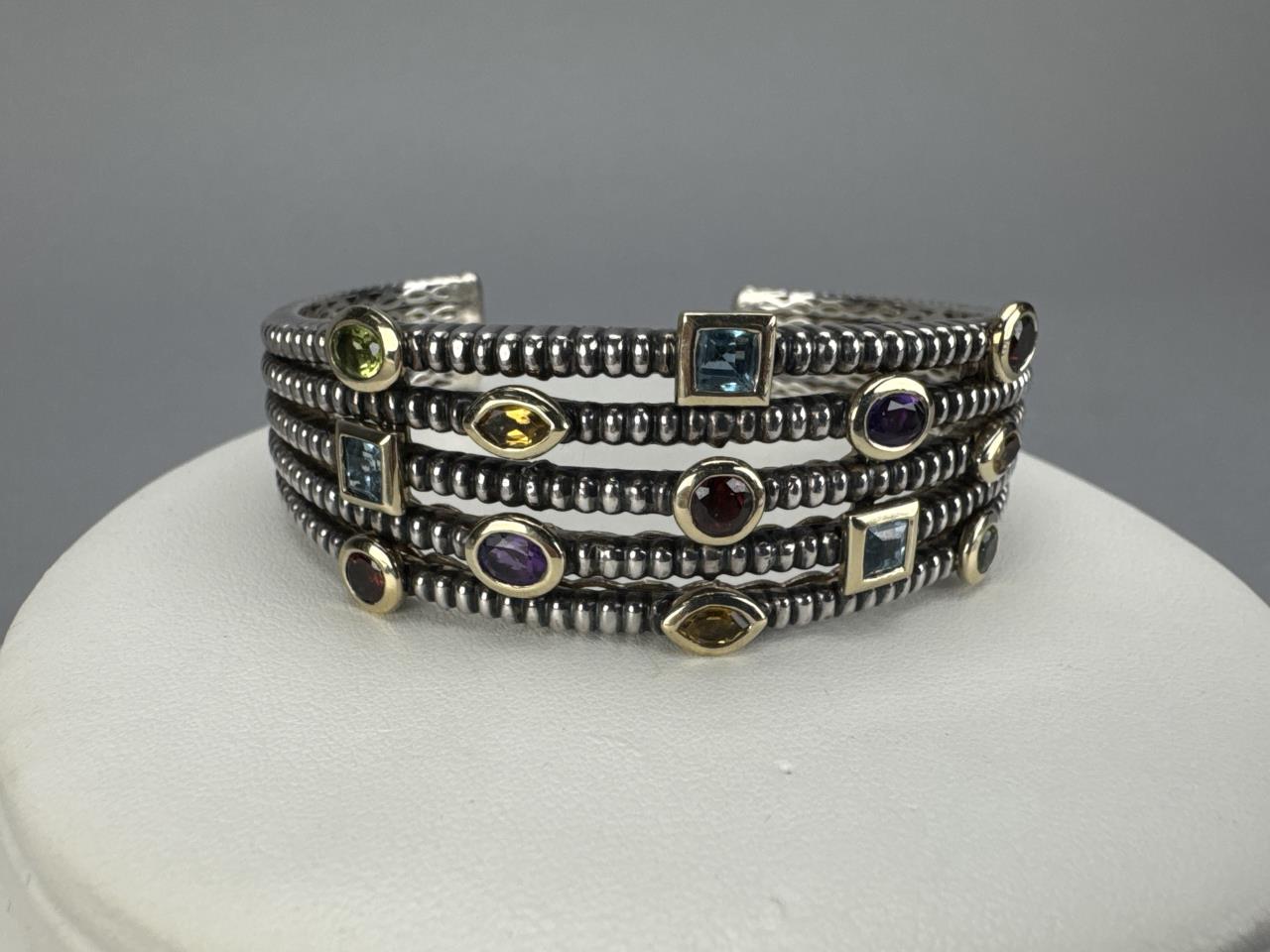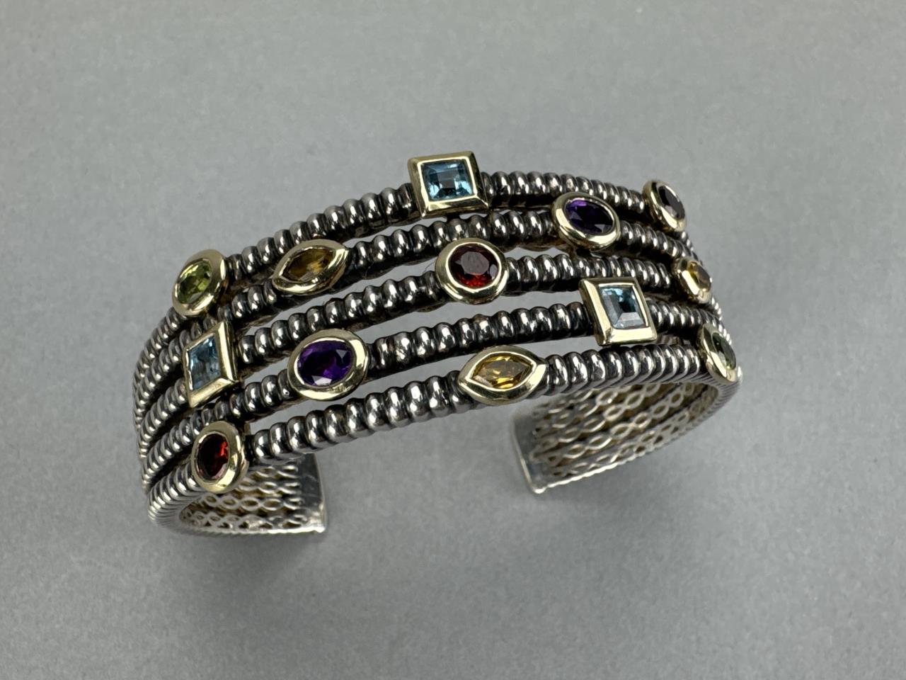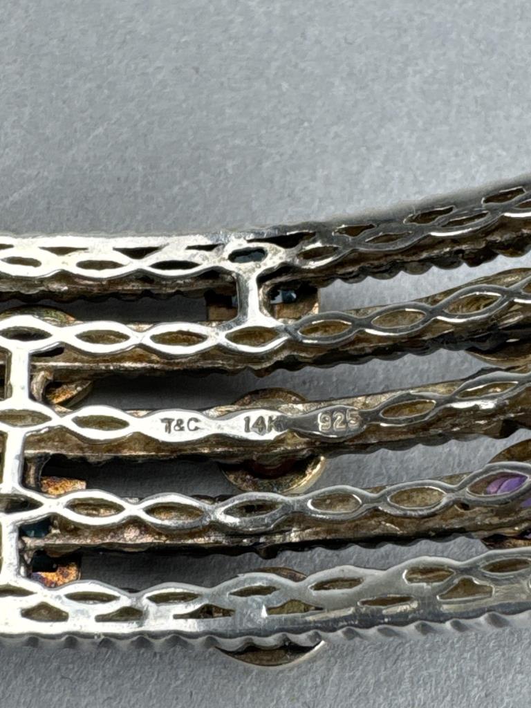 T & C Sterling 14K 5 Row Multi Gem Cuff Bracelet