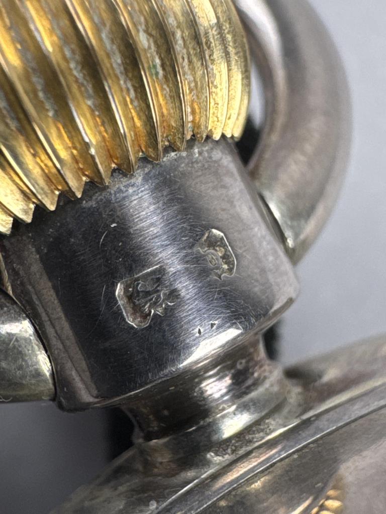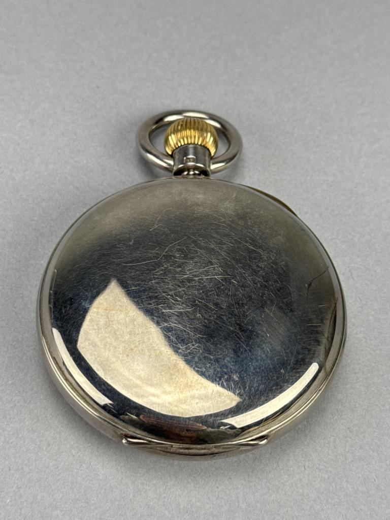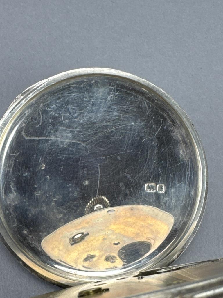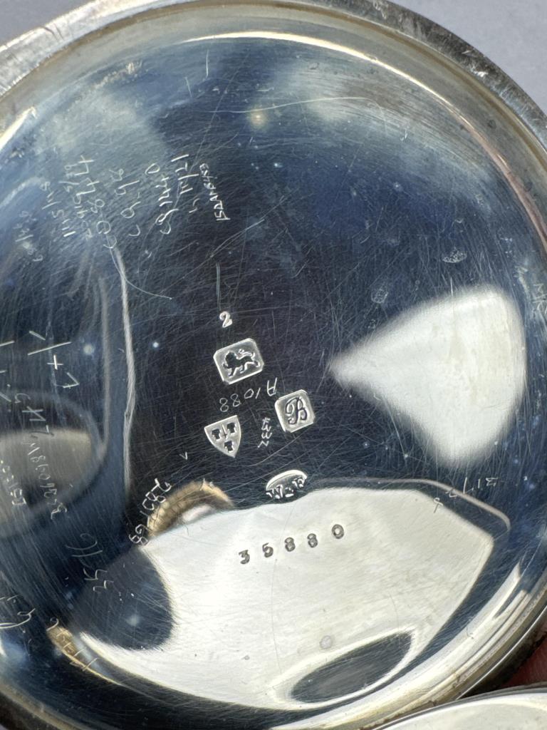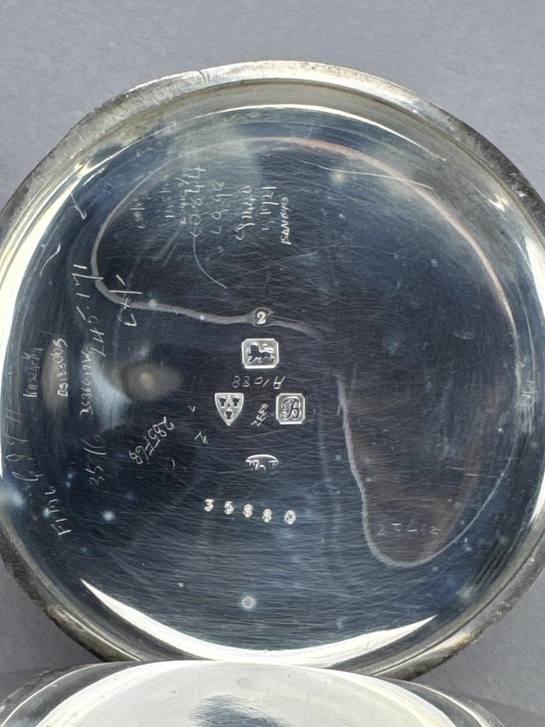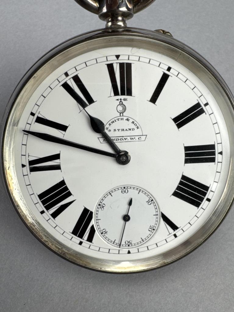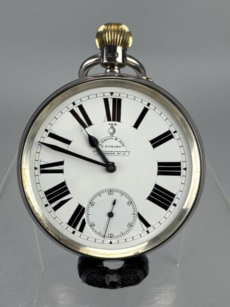 S. Smith & Son / 9 Strand / London, W. C. on dial. Serial No. 35880, c. 1902. Sterling silver open face case, no engraving.Case marked W&F, Assayed and Hallmarked at the Chester Guildhall (assay office) in 1902. 13 jewels. Stem wind and set. Suspension loop is loose, cpl tiny chips at edge of crystal, lt wear/scs to case. Average condition. Total wt: 301.4 grams.