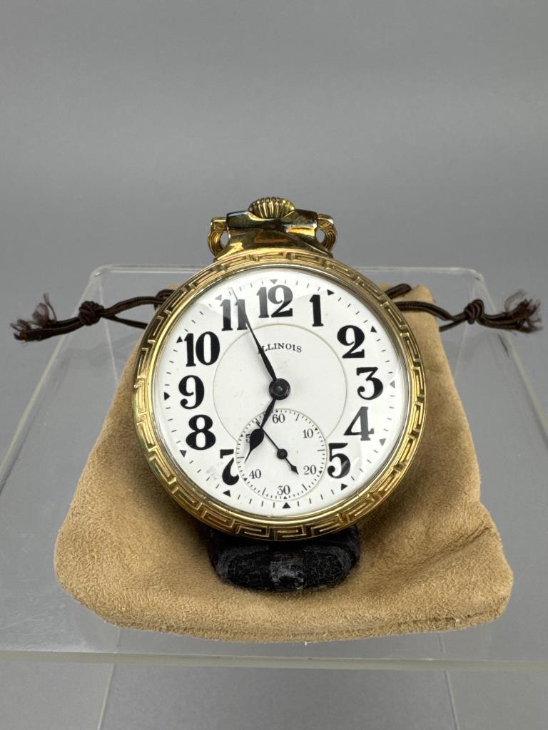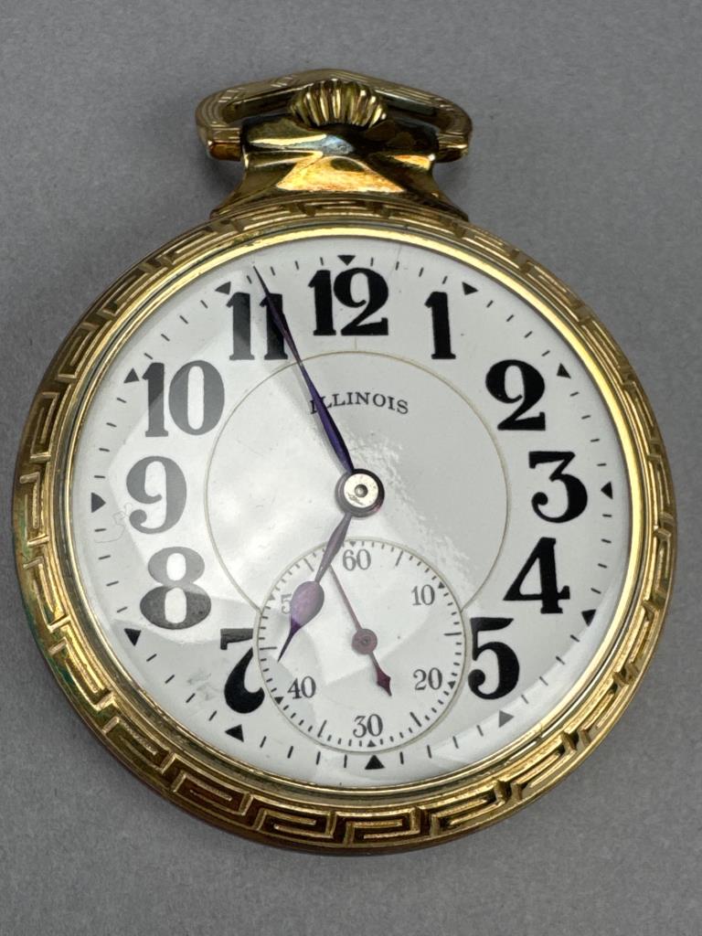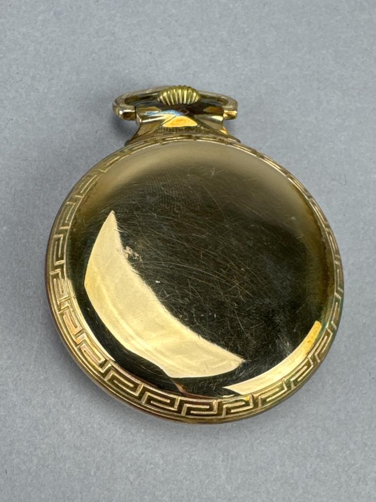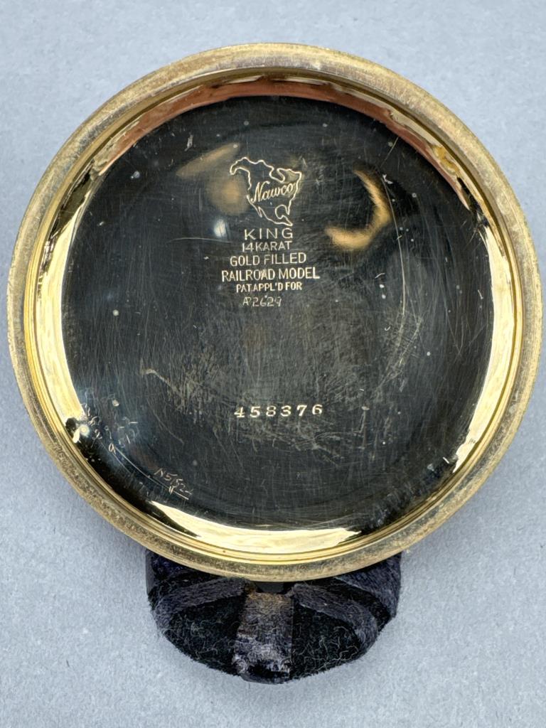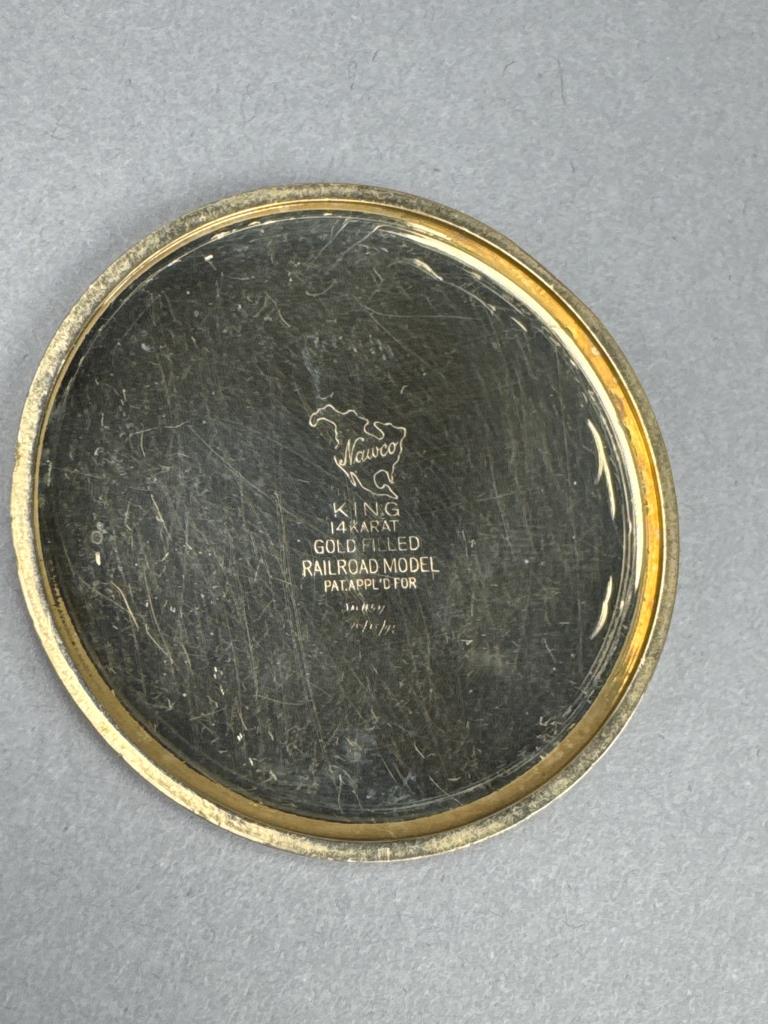 Serial No. 4306953, c. 1923, Model 9. 16 size, 21 jewel. Grade: Bunn Special. Nawco King 14K gold filled Railroad model Serial No. 458376 open case, plain back, Greek Key around edges. Lever set, pendant wind. Average, wear at stem area. Running.