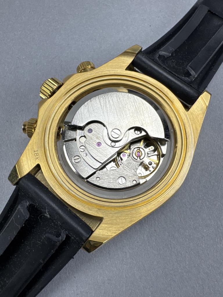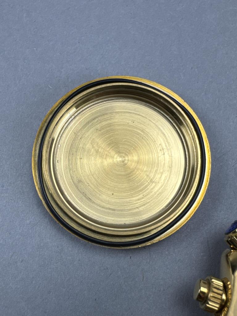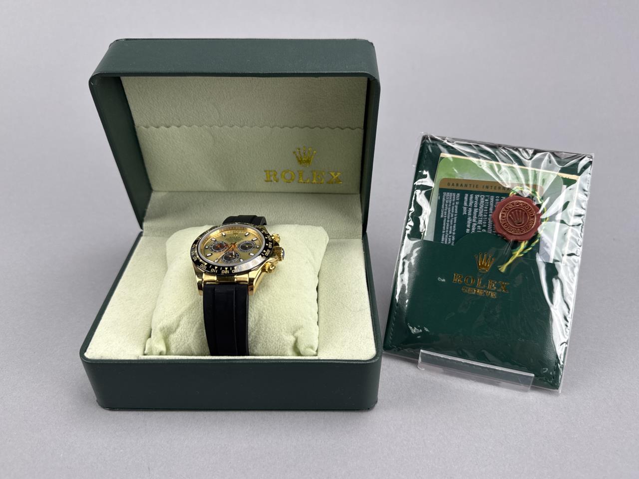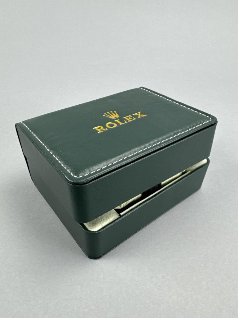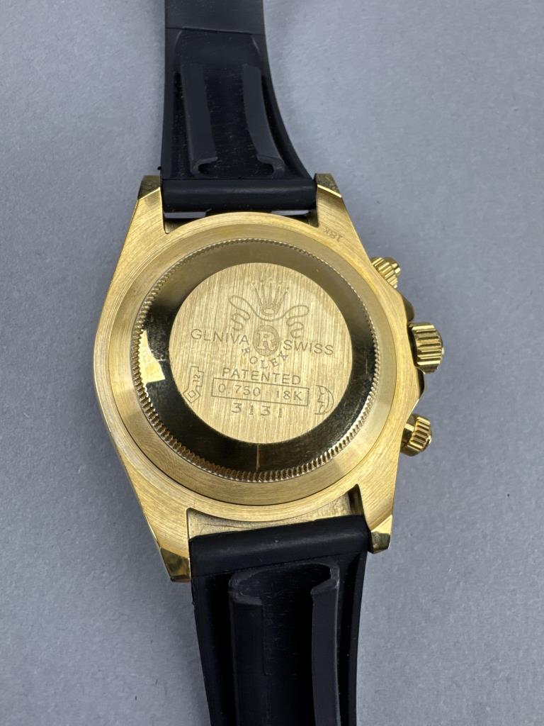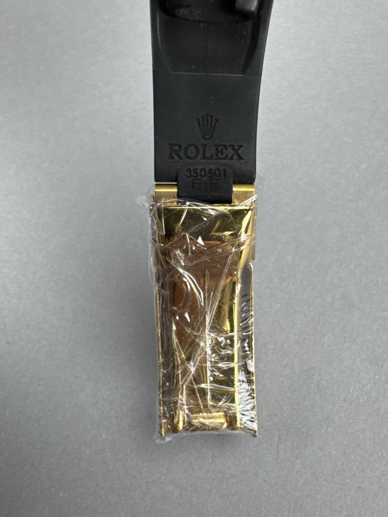 Like new replica of a Rolex 18K wrist watch in box. Band needs to be attached, all pieces are there. Runs.