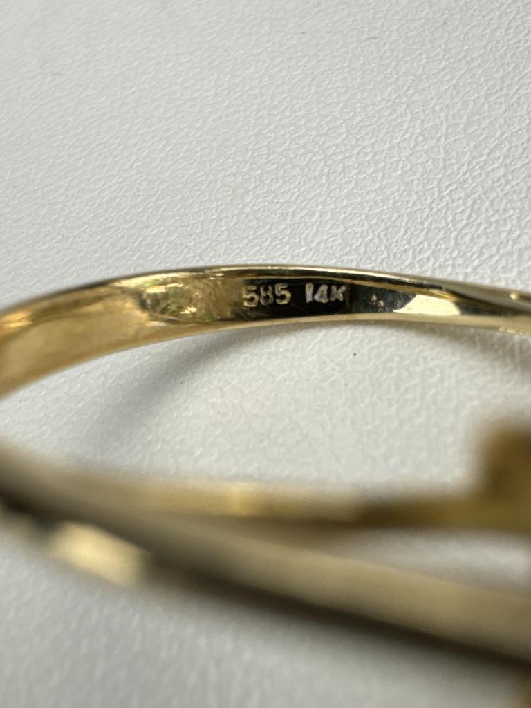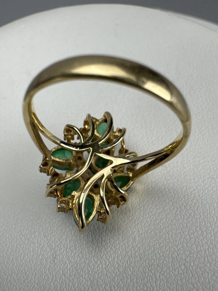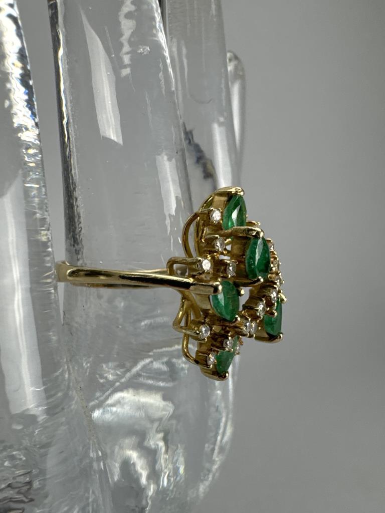 Marked 14K 585. 22 round diamonds and 6 pear shaped emeralds. Ring size is 7 1/4 and weighs approx. 4.5 grams.
