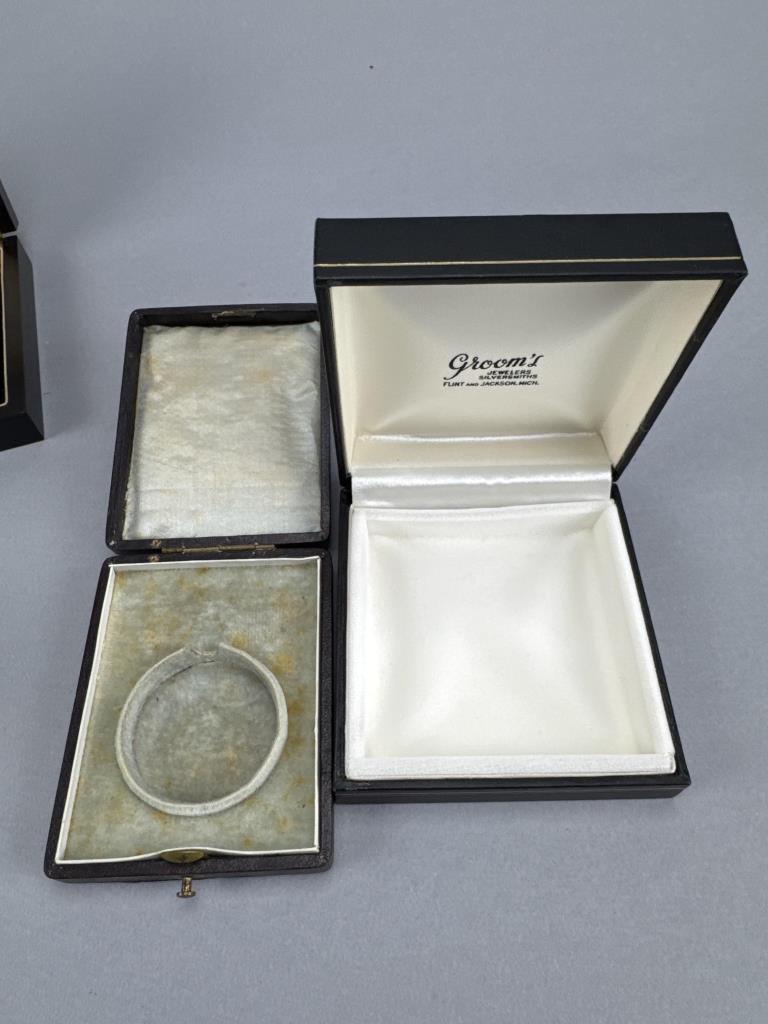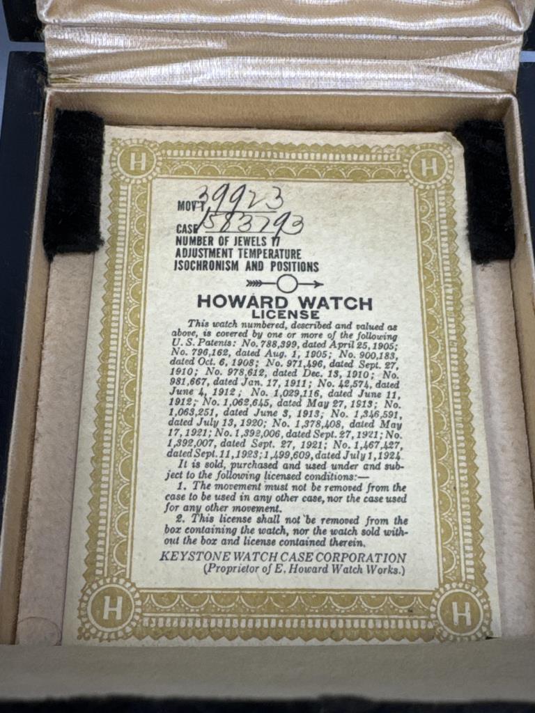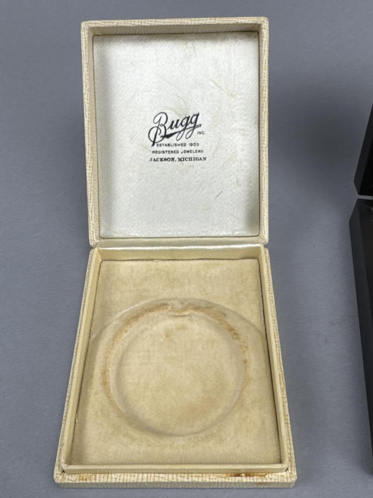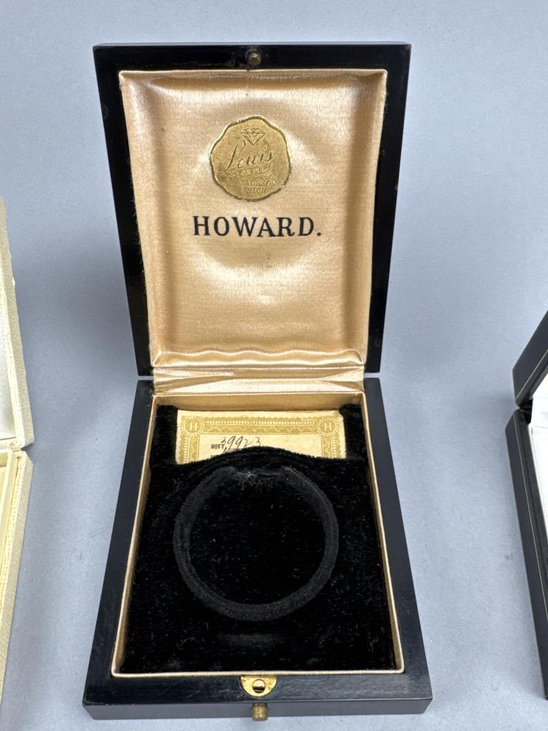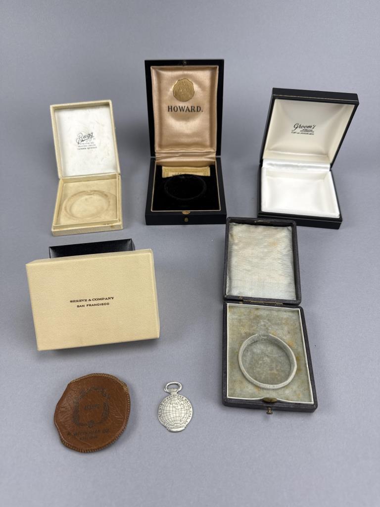 Lewis Jeweler Jackson, Mich. Howard watch box. Shreve & Co. San Francisco jewelry boxes. Bugg Inc. Jackson, Michigan, 1903. Agassiz A, Wittenauer Co. Est. 1866 small leather pouch. Souvenir World’s Columbian Exposition Chicago1893 watch back opener tool.