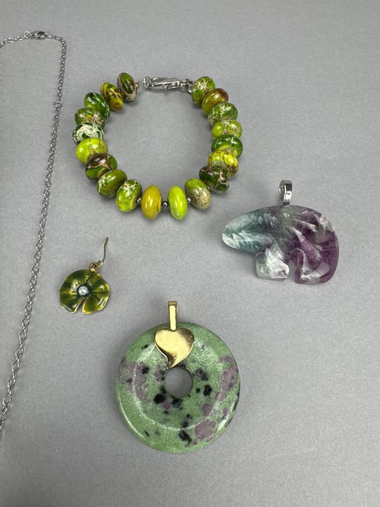 Monet lily pad enamel earrings, Fluorite bear. 18 inch necklace.8 3/4 inch necklace.
