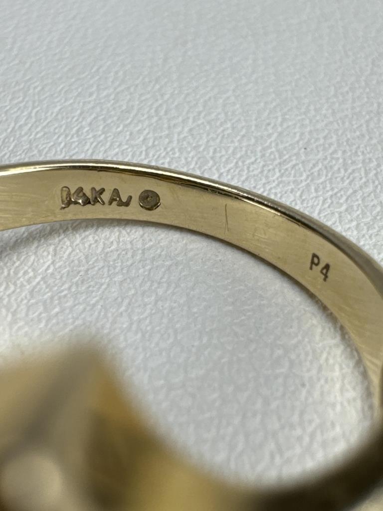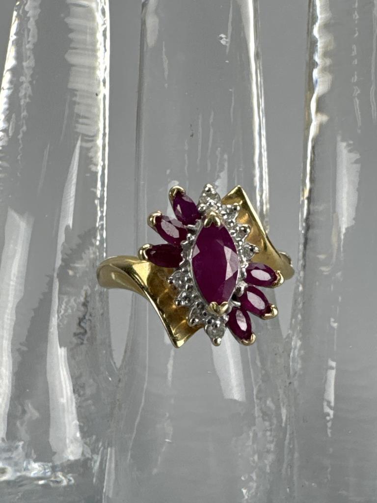 Marked 14K AJ P4 on shank. 8 round diamonds and 7 marquise rubies. Ring size is 7 and weighs approx. 5.1 grams.