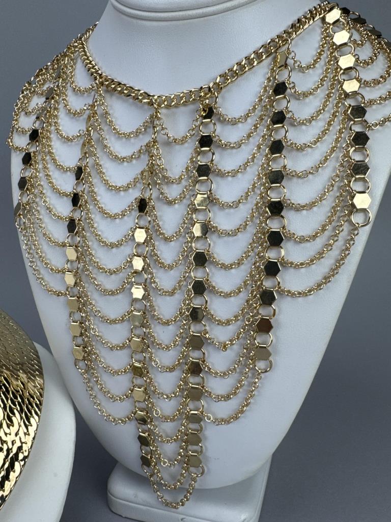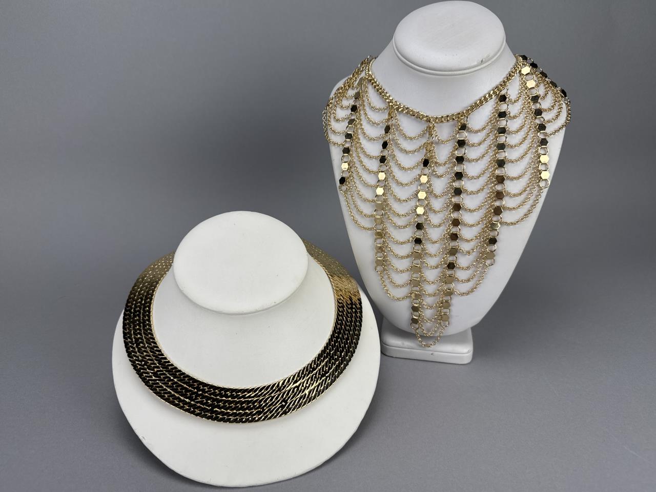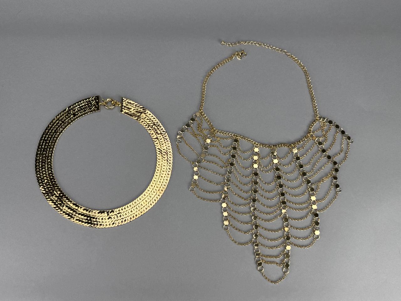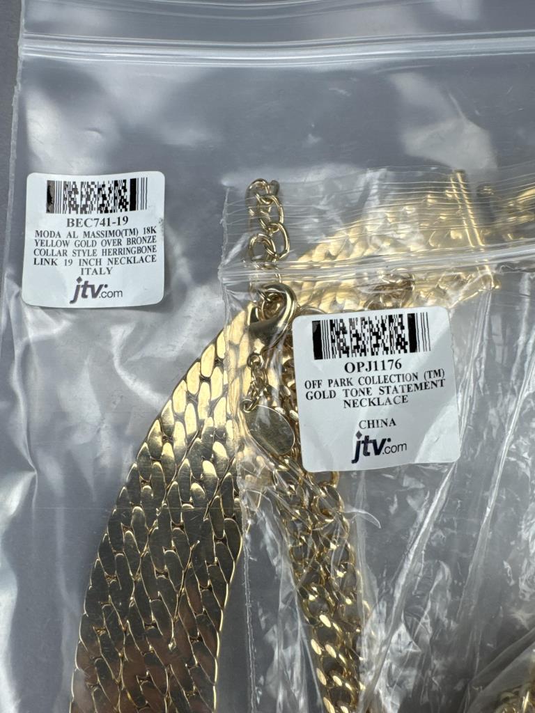 Jtv BEC741-19 19 inch triple-strand 18K over bronze collar style necklace, marked G ITALY 18K GP. Jtv OPJ1176 18 + 4 inch Off Park Collection gold tone statement bib necklace.