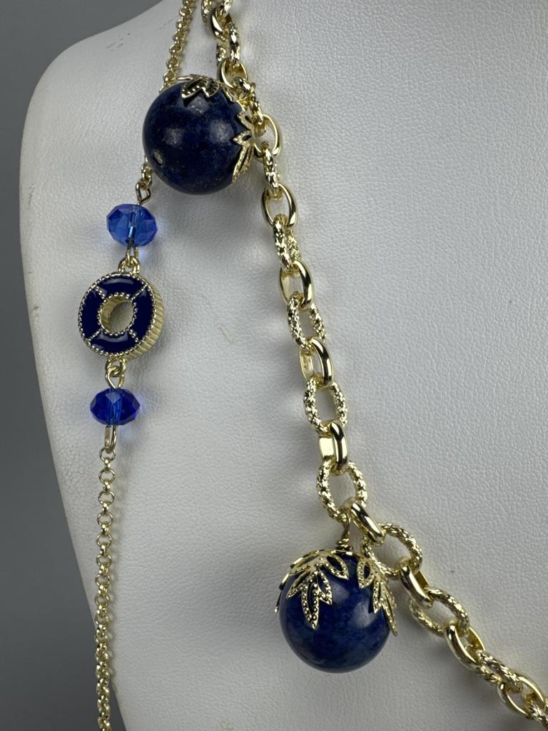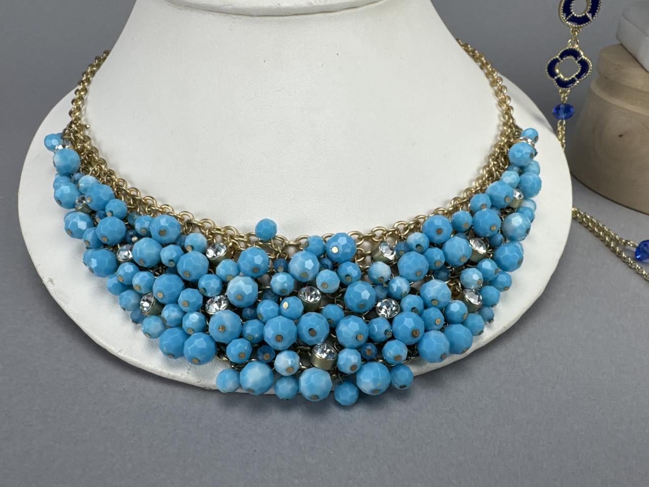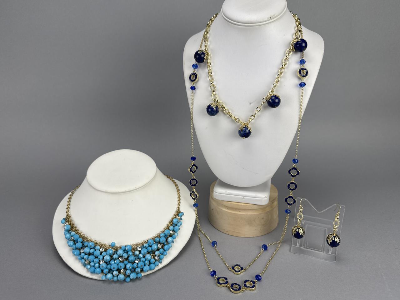 18 inch lapis lazuli necklace with matching earrings. Bib necklace with blue beads and rhinestones. Off Park Collection 36 + 2 inch blue bead and enamel necklace.