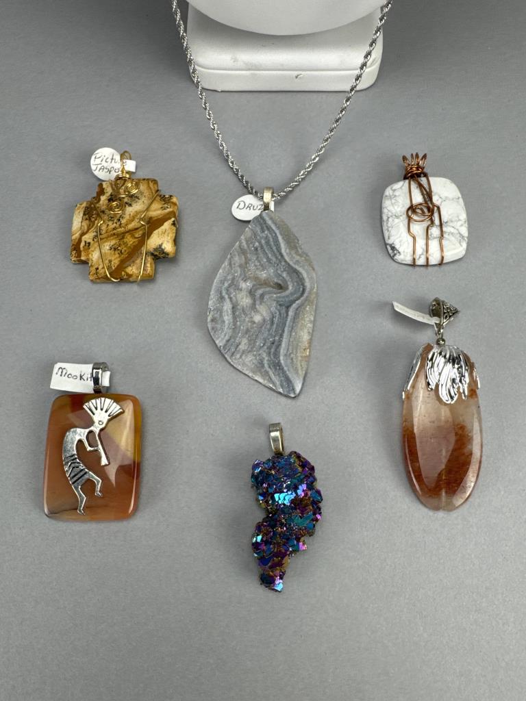 29 inches. Druzy, mookite, picture jasper, quartz.